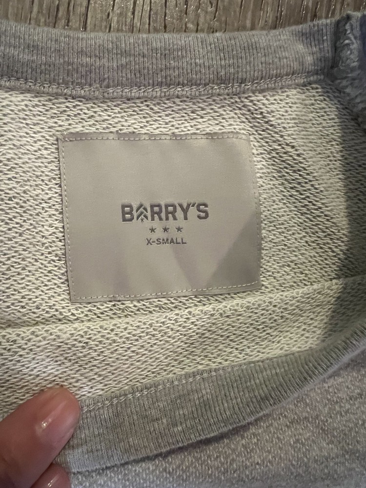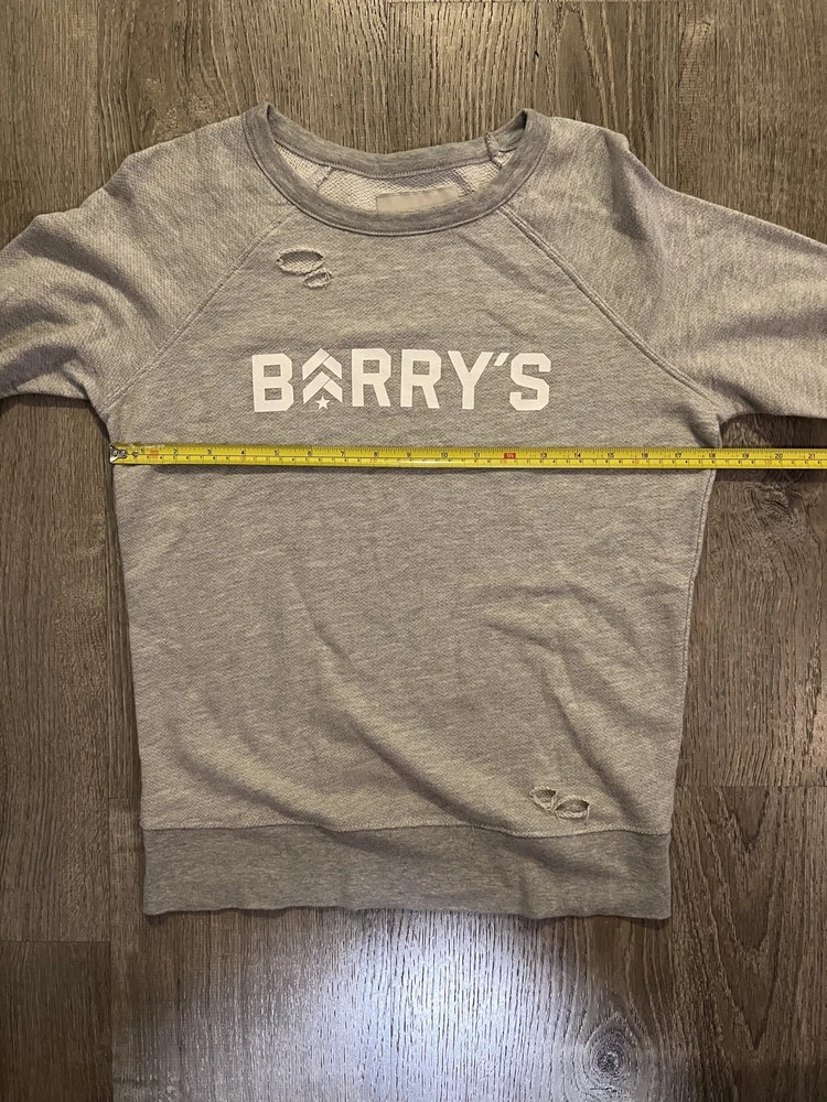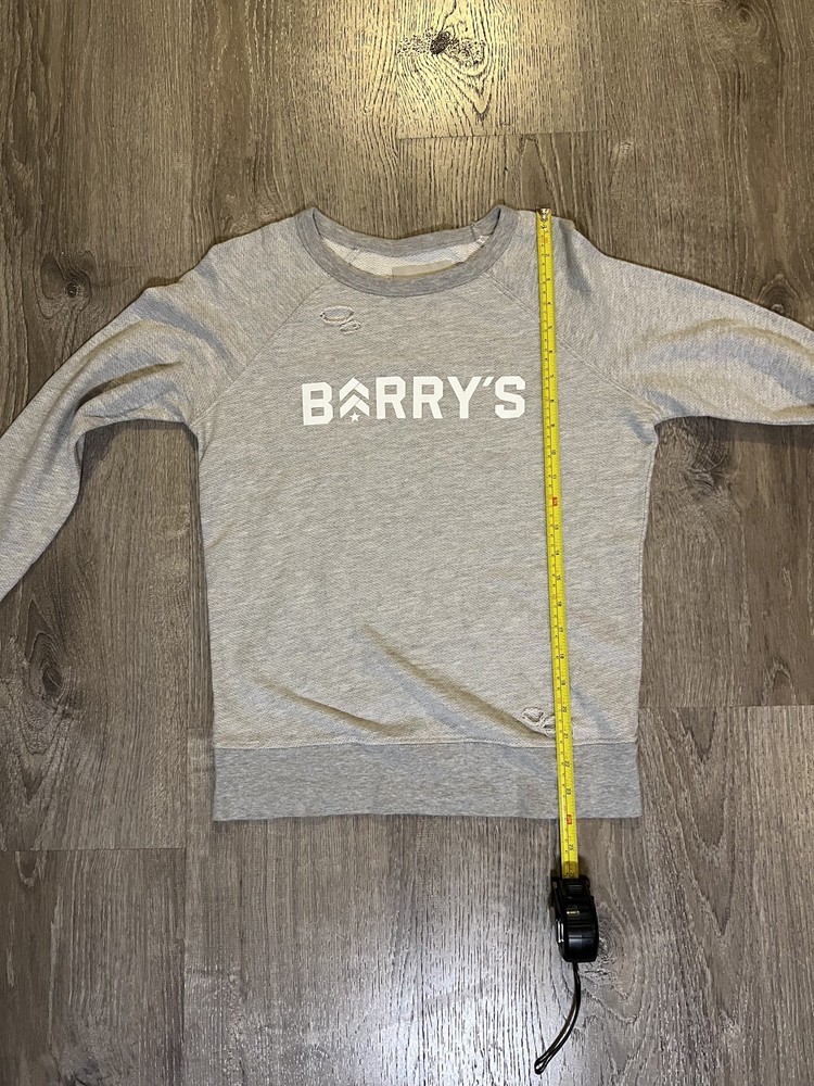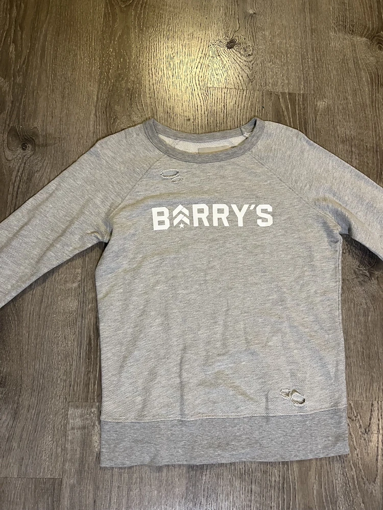 French terry sweatshirt with a deconstructed, distressed look and "BARRY'S printed across the front. It is described as having a raglan crew neck and an easy fit. The sweatshirt is made of a cotton and polyester blend. Size:XS Color:gray/white Condition:pre-owned Offers are welcome Trendy, chic, fashion,casual,edgy,sporty,cozy,comfy, outdoors