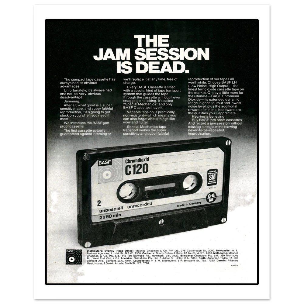 BASF Cassette Tape Eighties Retro Advertisement Art Print Poster All retro advertising prints are created using scans of the original ad. As a result, prints may show signs of age and/or wear or other imperfections. • Digitally Printed.• Sizes available: 8x10, in. 11x14 in, 12x16 in, 16x20 in 18x24 in.• 16x20 in, 18x24 in• Printed with a matte finish on heavy duty archival paper.• 200 GSM heavy weight paper BASF Cassette Tape Eighties Retro Advertisement Art Print Poster All retro advertising prints are created using scans of the original ad. As a result, prints may show signs of age and/or wear or other imperfections. • Digitally Printed. • Sizes available: 8x10, in. 11x14 in, 12x16 in, 16x20 in 18x24 in. • 16x20 in, 18x24 in • Printed with a matte finish on heavy duty archival paper. • 200 GSM heavy weight paper × Shipping info Click the Shipping & Payments tab above the listing description for more info FREE Shipping See more... USPS First Class - $0.00 USPS Priority Mail - $9.95 Click the Shipping & Payments tab above the listing description for more info! Additional delivery notes PICK UP OPTION Sorry, our items are NOT available for pick-up. PAYMENT Immediate payment is required upon selecting "Buy It Now" or upon checking out through the cart. We accept payment via U.S. PayPal accounts and all Major Credit Cards, Debit Cards & Google Pay. We are legally required to collect sales tax in those states and localities where we maintain a physical presence (nexus). The applicable amount of sales tax charged to an order will be calculated based on the shipment destination's state and local sales tax laws. Thank you for shopping with us on eBay! Additional Information No additional information at this time Ask seller a question You might also like Peaches Records & Tapes Est. 1975 Record Shop Music Store Men's Unisex T Shirt T Elmore Elmo James 78 RPM Mississippi Delta Blues Trumpet Record Label Men's T Sh Howlin' Wolf Chicago Blues Men's T Shirt Tee Opryland USA Amusement Park Nashville Retro Unisex T-Shirt Tee Contact To contact our Customer Service Team, simply click the button here and our Customer Service team will be happy to assist. Ask seller a question © Mad Apple Shop Shipping & Payments Shipping is FREE for this item Payment Accepted Payment Methods Immediate payment is required upon selecting "Buy It Now" or upon checking out through the cart. We accept payment via U.S. PayPal accounts and all Major Credit Cards, Debit Cards & Google Pay. We are legally required to collect sales tax in those states and localities where we maintain a physical presence (nexus). The applicable amount of sales tax charged to an order will be calculated based on the shipment destination's state and local sales tax laws. Thank you for shopping with us on eBay! Returns Returns are accepted Items must be returned within 30 days of the auction ending Buyer will pay for return shipping. eBay integration by