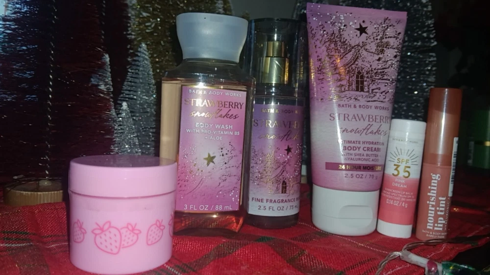 BATH & BODY WORKS "STRAWBERRY SNOWFLAKES!" 6 PIECE ONE OF A KIND GIFT SET INCLUDES LIP MASK, LIP BALM, LIP TINT, & TRAVEL SIZE SHOWER GEL, LOTION, AND BODY SPRAY