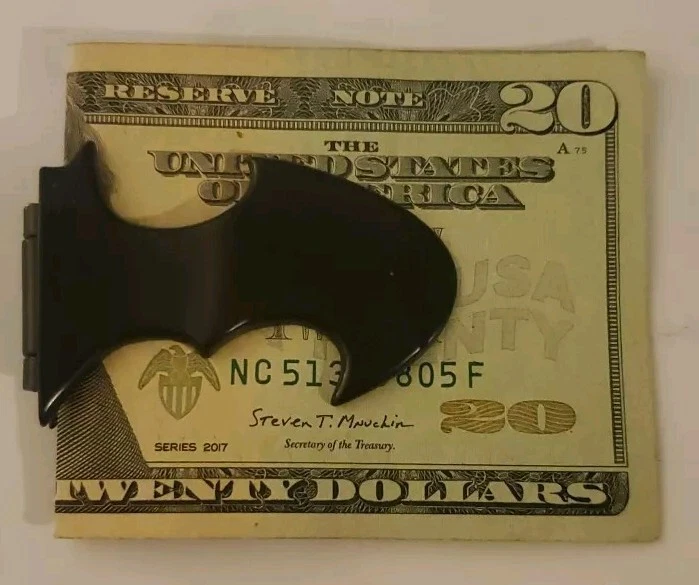 Awesome rare money clip The Batman 1989 Batarang Money Clip is a hinged magnet clip designed to securely hold bills and cards in place. This money clip features the iconic Batarang symbol from the 1989 Batman film, adding a touch of superhero flair to your everyday essentials. The sleek black design and Batman character make it a stylish and practical accessory for any Batman fan looking to keep their cash organized in a unique way. Thanks for looking