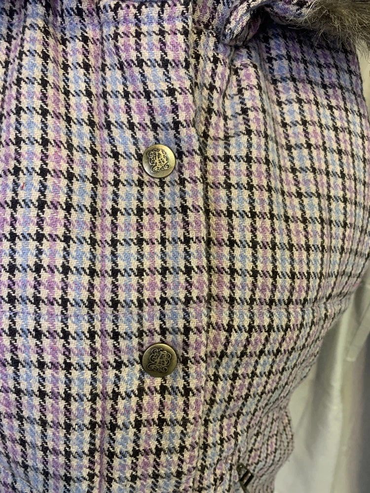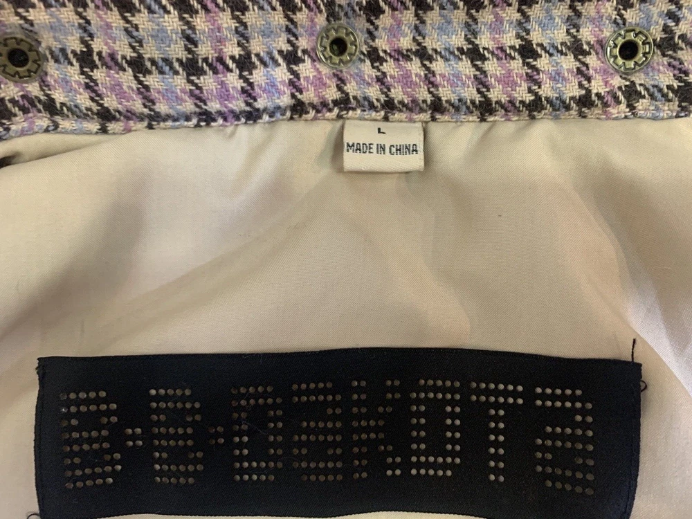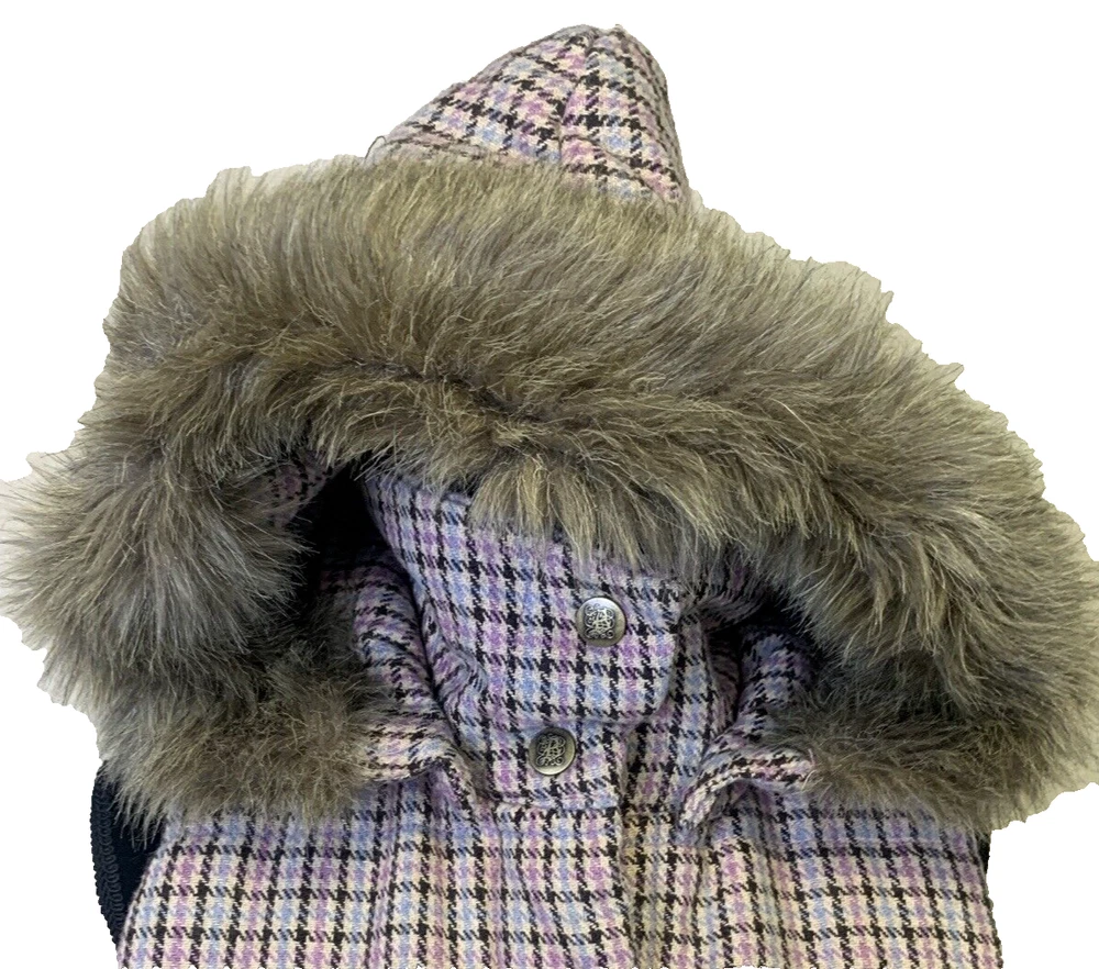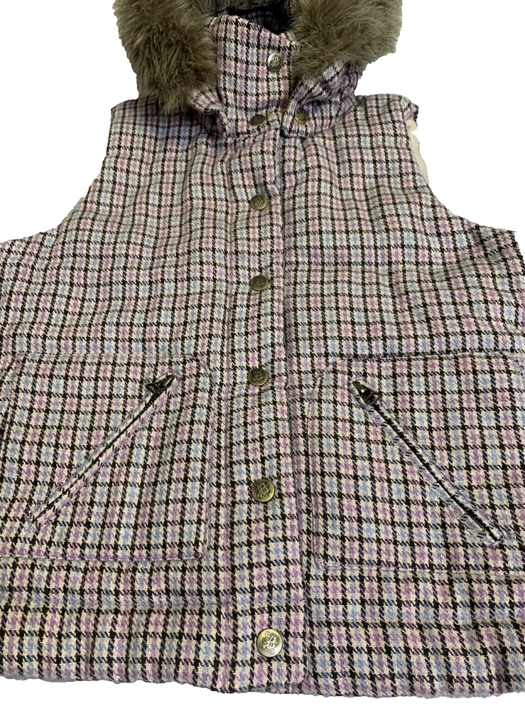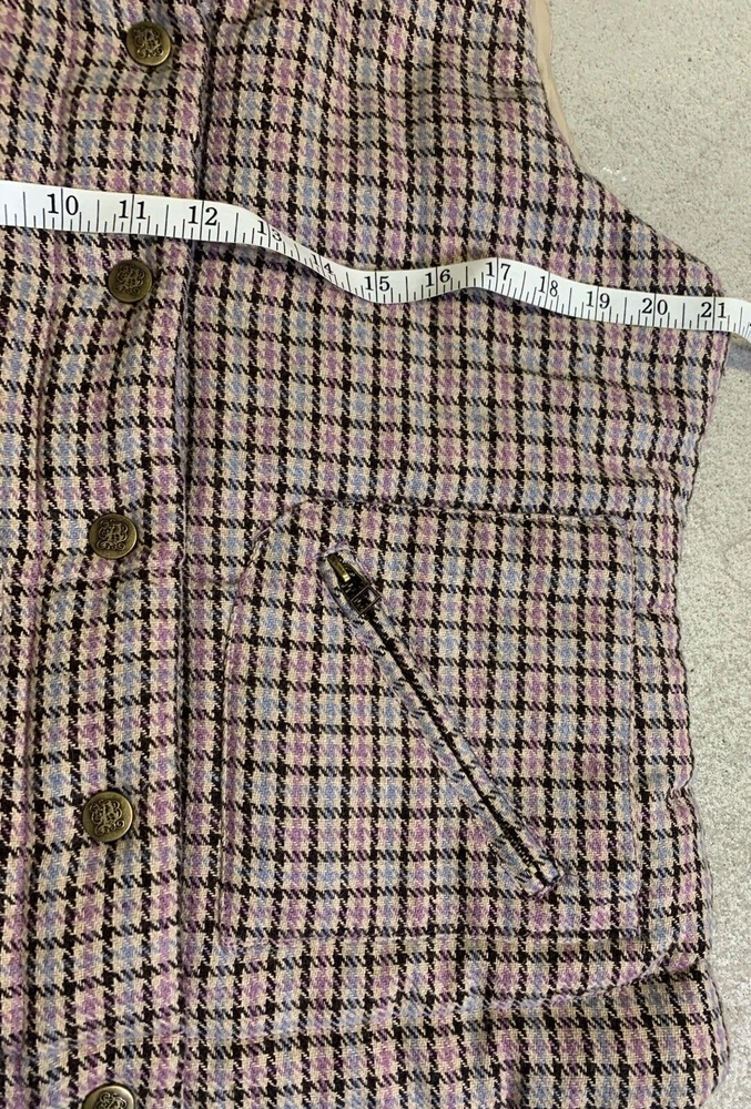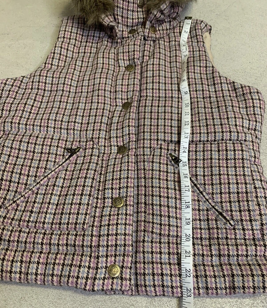 BB Dakota Vest Womens Large Pink Plaid Wool Blend Hood Faux Fur Trim Snap Front Excellent pre-owned condition. No visible flaws. -50% Polyester/30% Acrylic/10% Wool/6% Rayon/4% Nylon/ -Fully Lined -Zipping Pockets -Hand Wash Cold -SKU E24-792 -Measurements laying flat: Chest: 21" Waist: 20" Length: 23" Questions? Please ask. Ships next business day. Offers welcome.