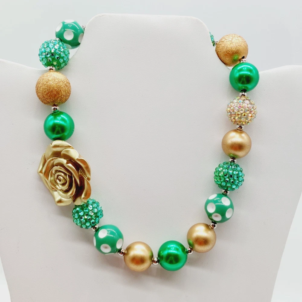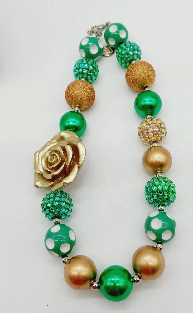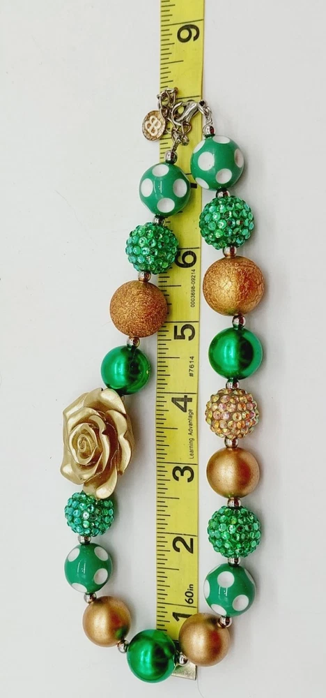 BB Gold Tone Rose Green White Gold Plastic Beads Choker Necklace