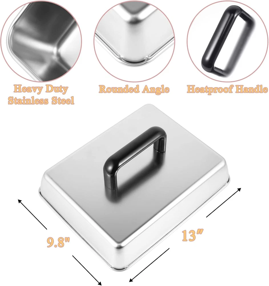 BBQ Melting Dome Basting Cover Grill Press Barbecue Weight Kit for Blackstone Packing include:1*Rectangular Basting Cover and 1* heavy duty cast iron grill press. Rectangular Basting Cover Size: 13 x 9.8 Inch. Heavy duty cast iron grill press size: 8.5 x 4.1 inch This square Rectangular Basting Cover is made from high quality stainless steel, cast iron grill press is made from heavy duty cast iron for a compact and sturdy construction that is built to last, making it ideal for everyday outdoor barbecues and more Heavy-duty cast iron grill press with raised bottom grain to leave attractive grill marks on the grill features a premium wood handle that you can just grip in your hand for use The excellent material makes the grill accessories heat and corrosion resistant and durable. The set is easy to clean, you just need to use soapy water to clean it easily. Reduce the stress of your housework The grill accessory set is perfect for indoor cooking, outdoor grilling, outdoor camping and restaurants. Works with any grill for cooking burgers, meats, buns, fajitas, eggs and more We are always committed to the quality of our products and services, if you have any questions about this, please feel free to cont us, we will provide you with solutions as soon as possible Product Description Rectangular Melting Dome and Grill Press Melting Dome: Measure: 13 x 9.8 inch (L x W) Material: Stainless Steel Grill Press: Measure: 8.5 x 4 inch (L x W) Material: Heavy-duty Cast Iron Feature Heat resistance Sturdy, not easy to deform Keep the flavor Non-stick oil Dishwasher safe Smash Burger Press Rough textured surface helps cook food quickly, add delicious and smoky barbecue flavor in your grills Rectangular Basting Cover Rectangular cheese melting dome is professional indoor and outdoor grill tools Keep the Flavor Perfect for burgers, bacon, beef, flatbreads, sandwiches, quesadillas, paninis, chops and steaks Fit for Blackstone grill accessories Fit for any bbq grills, such as flat top, gas, pellet, teppanyaki Fit for home kitchen, family bbq party, back yard, buffet, restaurant, indoor and outdoor Item model number 13 Inch Basting Cover & Grill Press Closure Type Lid Style Compact Is Microwaveable No Number of Pieces 1 Color silver Product Dimensions 13"L x 9"W Material Stainless Steel, Cast Iron Country of Origin China Is Dishwasher Safe Yes Item Weight 0.71 ounces Shape Rectangular Size 13" x 9" Shipping Fast shipping is very important for us. Our expedited US shipping service is FREE. Your order will be shipped within 2 business days upon full payment received. Your order will be delivered within 2-3 business days after the handling time. Warranty & Returns 30-Day FREE Return Policy offered for unsatisfactory items. Options include: Refund or Exchange for another item. Contact us Customer satisfaction is our top priority. If you encounter any issues with our product, please don't hesitate to reach out to us. We are committed to ensuring your satisfaction and will go above and beyond to assist you. Your happiness is our goal! Thank you for shopping at our store.