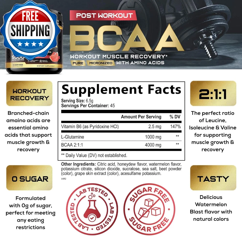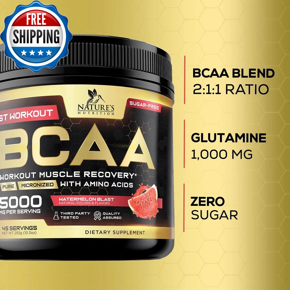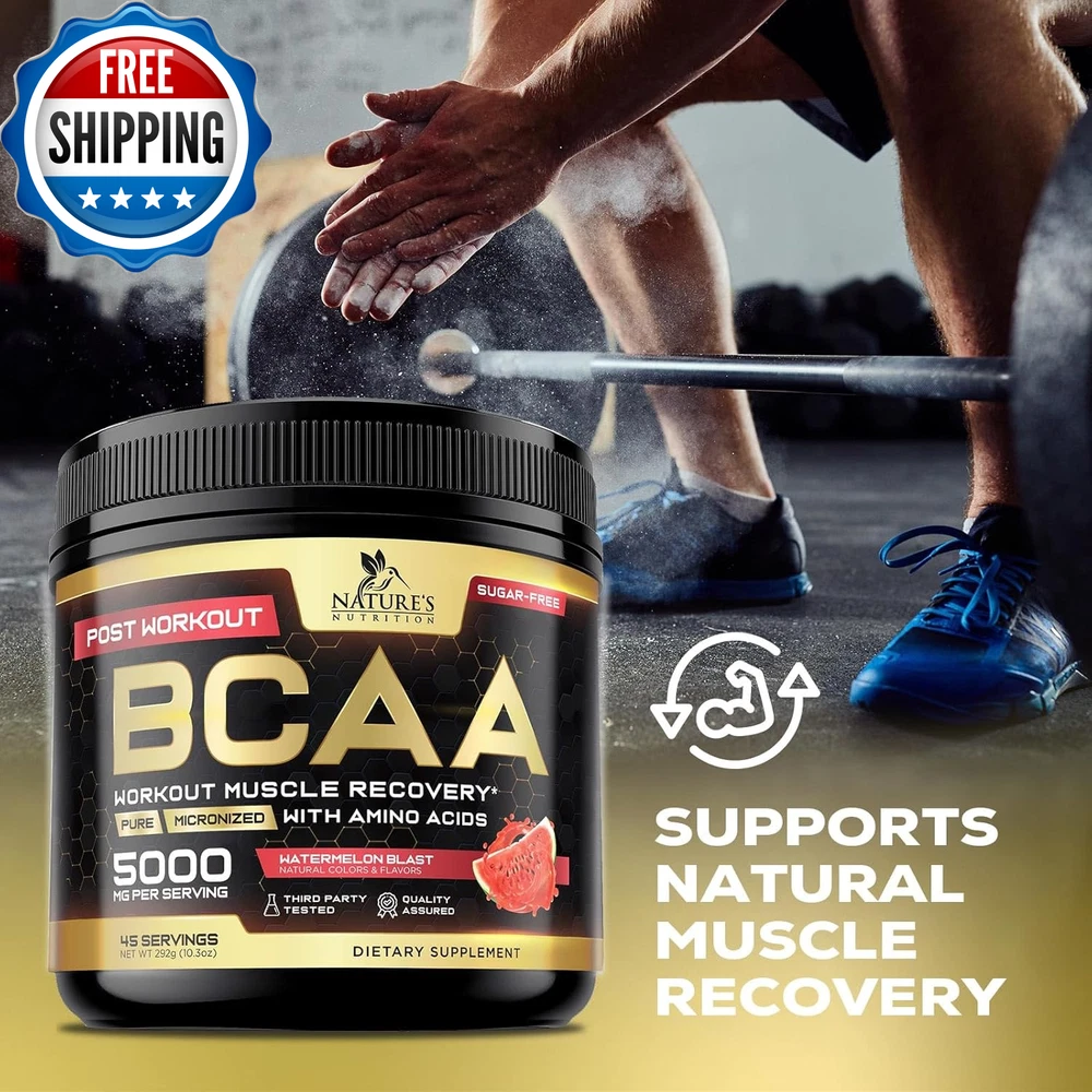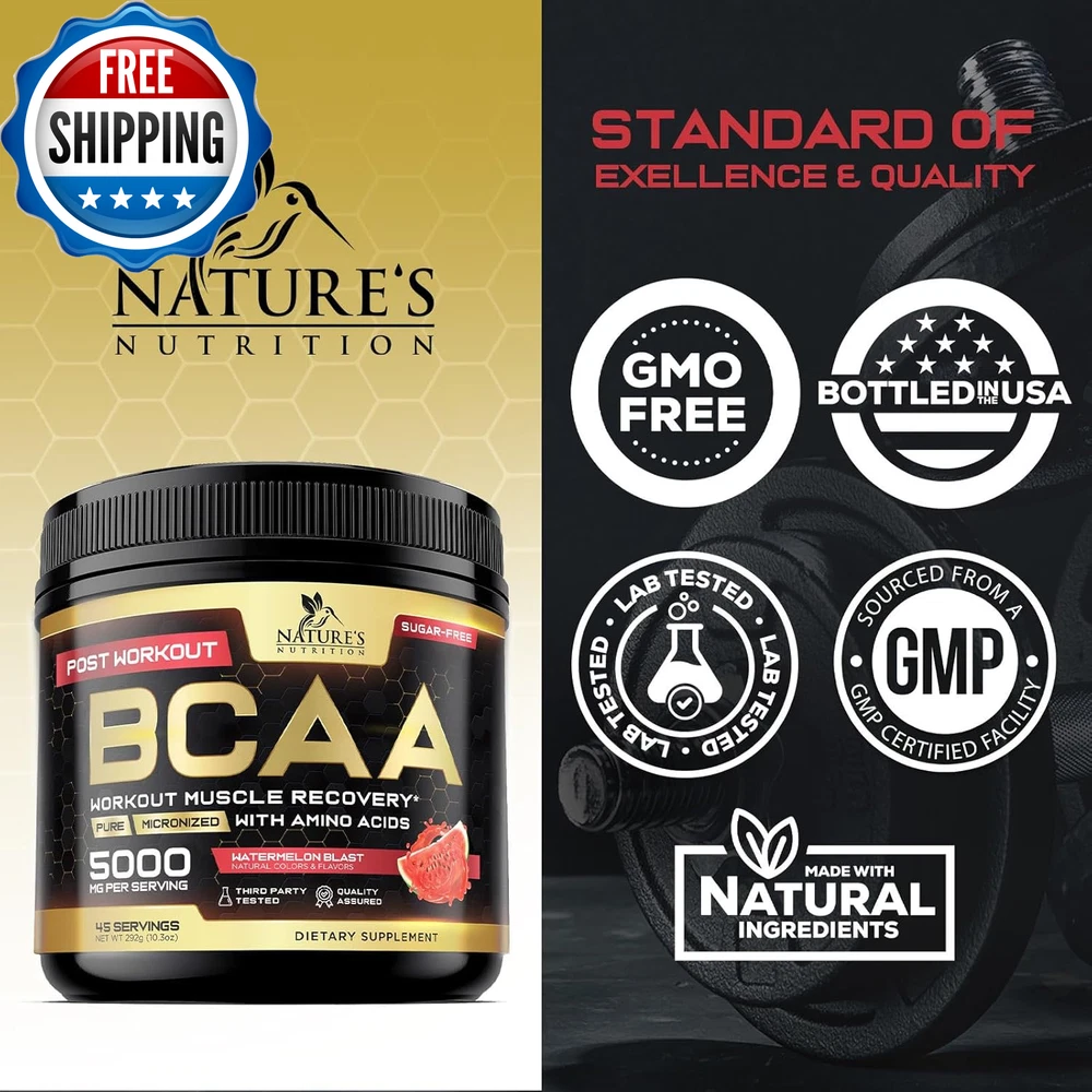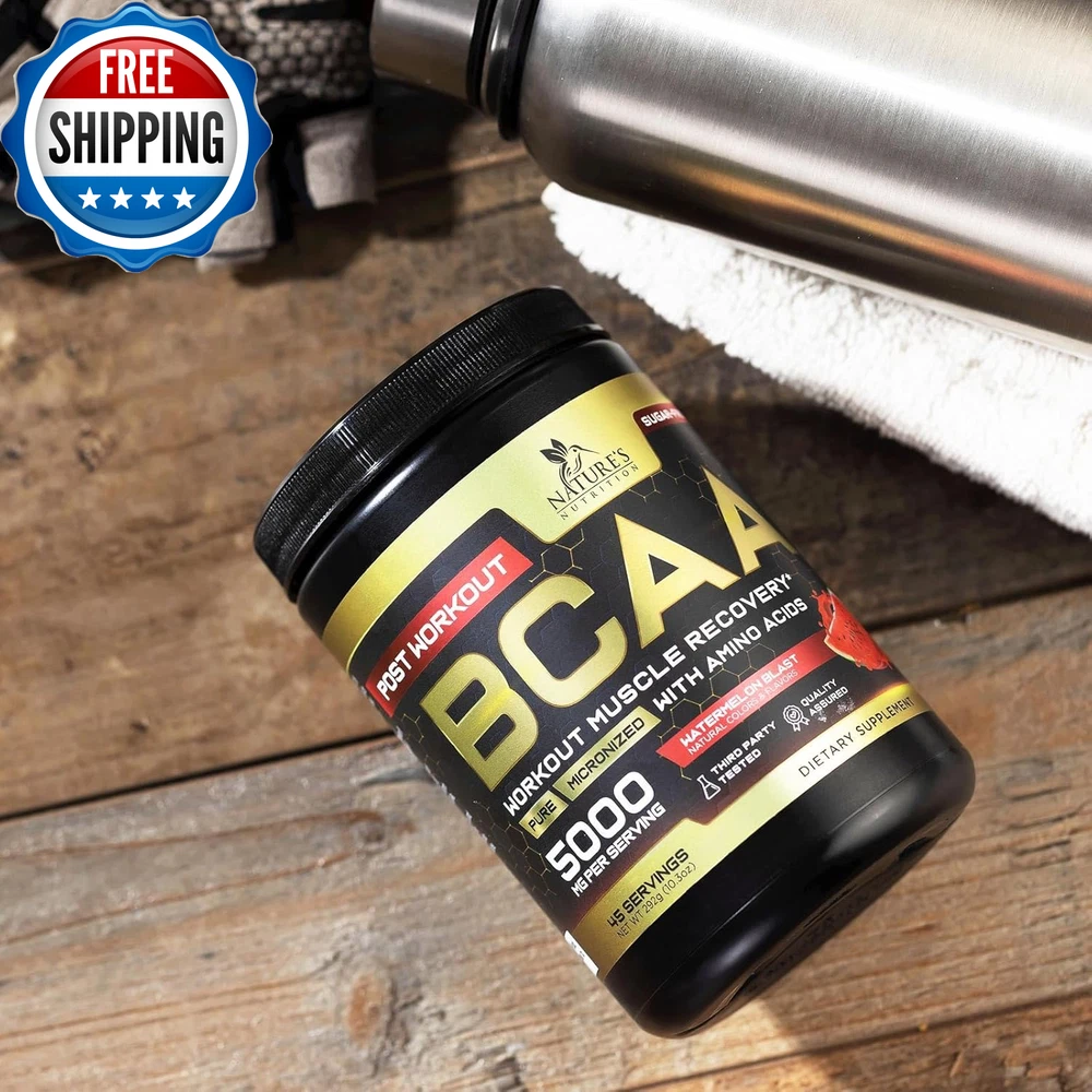 BCAA Powder, 4G Bcaas 2:1:1, 1G Glutamine, B6 - Pre Workout Drink Energy Boost & Post Workout Muscle Recovery Amino Acids Supplement for Men & Women - Keto, Sugar Free, Watermelon Flavor - 45 Servings BCAAS AMINO ACIDS POWDER: Each serving delivers 4g of branched chain amino acids (Leucine, Isoleucine and Valine in the optimal 2:1:1 ratio), plus 1g Glutamine, 2.5 mg Vitamin B6, as well as sea salt and trace minerals to support endurance, hydration, boost energy, combat fatigue, and support muscle recovery and growth VERSATILE BCAA WORKOUT DRINK: Perfect for pre, intra and post-workout use; provides essential amino acids for muscle support and recovery without caffeine or sugar KETO & SUGAR-FREE FORMULA: Ideal for those on ketogenic diets or looking for a sugar-free option, supporting workout performance and hydration without added carbs, and no artificial colors REFRESHING WATERMELON FLAVOR: Enjoy a delicious and refreshing BCAA powder workout supplement for women and men that supports hydration, recovery and overall workout performance in every scoop BRANCHED CHAIN AMINO ACIDS FOR MUSCLE GROWTH: Nature's Nutrition 2:1:1 BCAA Powder best pre work out after post workout drink mix natural essential aminos protein supplement complex bcaas electrolyte glutamine energy boost gym men women prework preworkout recovery branch bca acid supplements b6 fitness keto friendly bcca watermelon aminoacidos caffeine free zero sugar hydration endurance performance growth support bodybuilding strength training athletic sports fuel 30 90 211 aminoacids Product Description Unit Count 10.3 Ounce Number of Items 1 Product Benefits Muscle Growth Item Weight 0.39 Kilograms Special Ingredients Branched-Chain Amino Acid Age Range (Description) Adult Package Information Bottle Flavor Watermelon Item Form Powder Package Dimensions 5.75 x 3.74 x 3.66 inches; 13.76 ounces Shipping Fast shipping is very important for us. Our standard US shipping service is FREE. Your order will be shipped within 2-3 business days upon full payment received. Your order will be delivered within 2-3 business days after the handling time. We only ship to the confirmed PayPal address. We reserve the right to cancel any order for any reason at any time. We are not responsible for undeliverable addresses. Returns and payment We offer a 30 days return policy from checkout winning date. We allow only PayPal as payment method FeedBack Your feedback very important to us, after you get your package and you are satisfied with our service please leave us positive feedback If you have any problem with your order / any questions please before leave any type of feedback Please visit our eBay store to check out other items for sale! Thank you for shopping at our store.