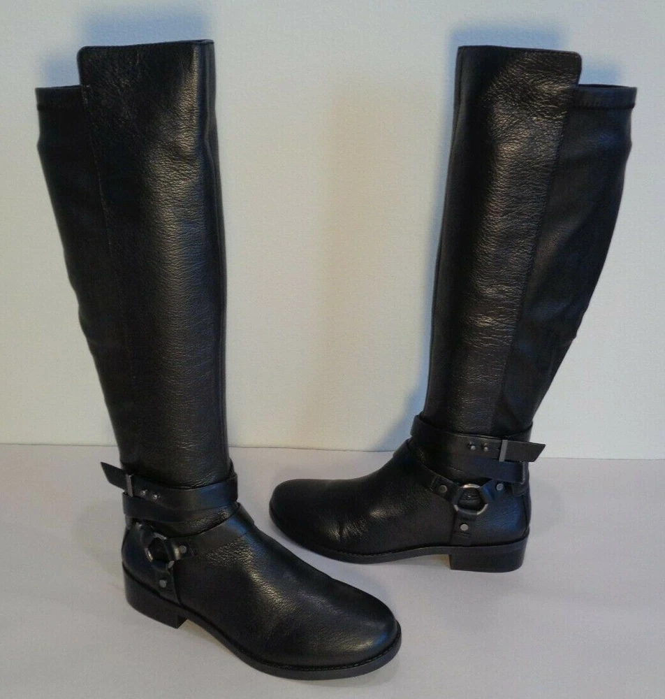 BCBG BCBGeneration Size 6 M KAI Black Leather Riding Boots New Womens Shoes Style: BG-KAI Color: Black L eather and man made upper Man made lining and outsole Inner shaft zipper L ug Sole Stretch elastic shaft for easy fit and comfort Shaft height is approximately 16.5 inches Heel height is approximately 1.25 inches Top to bottom is approximately 17.25 inches Boot opening is approximately 13.5 inches and flexible Eur 36