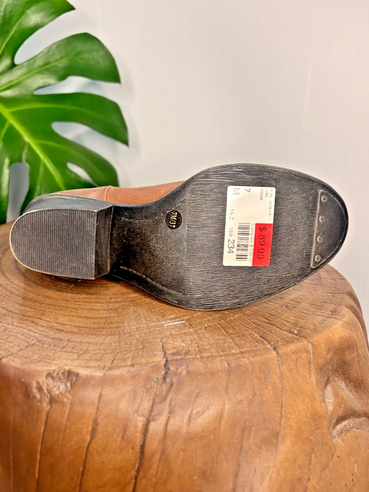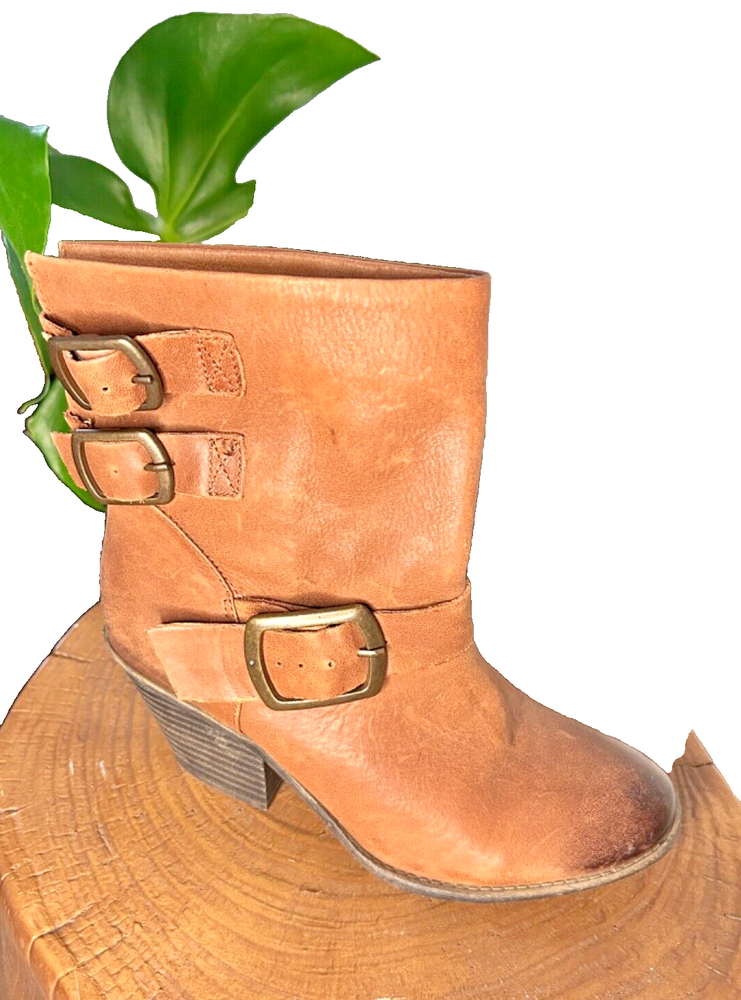 Stylish BCBG booties in a beautiful distressed tan color with multiple buckles. These pull-on boots feature straps and are perfect for travel, casual outings, workwear, and business meetings. The leather upper and outsole provide durability, while the leather insole adds a touch of luxury. These boots are a size 7, which is equivalent to a EU size 37. The solid pattern are the same as the Lucky Brand Tommie Boot. Ideal for the winter, fall, and spring seasons, these BCBG Generation Toni Brown booties are a must-have for any fashion-forward woman.