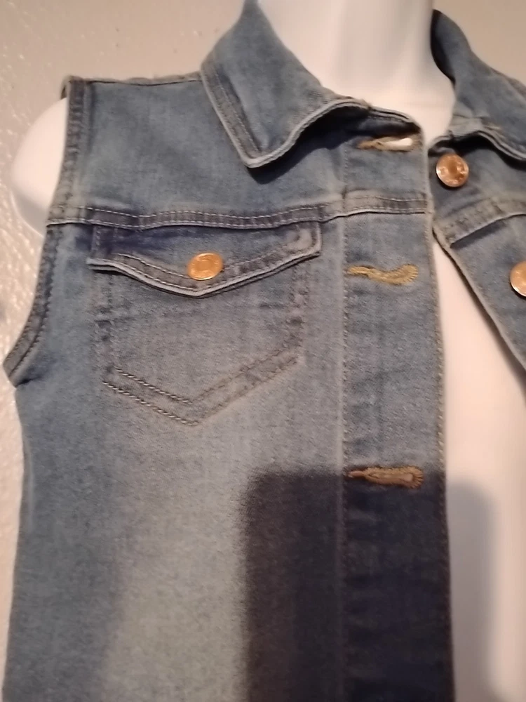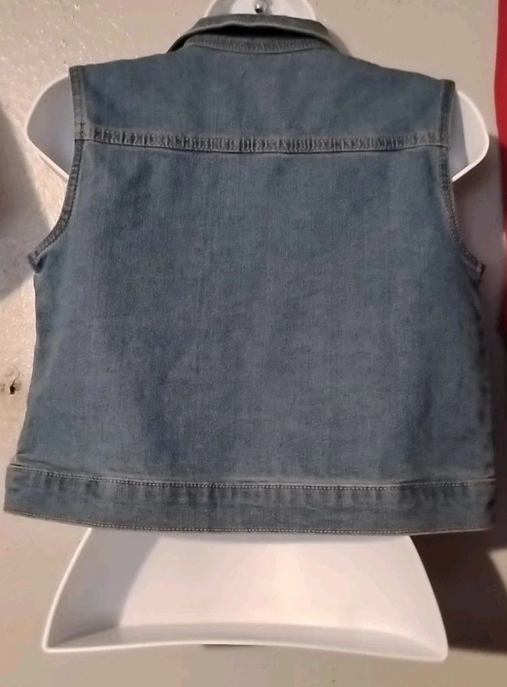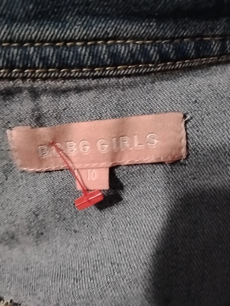 This is a BCBG Girls blue denim vest in size 10, featuring a cooper button-up closure. It is a casual sleeveless jacket with a mid-length style and a collared neckline. Made of cotton denim fabric with polyester lining, it has pockets and a logo accent. The jacket has a modern Y2K style, suitable for summer, fall, and spring seasons, perfect for walking or school activities. In excellent condition inside and outside. Only have been worn once.