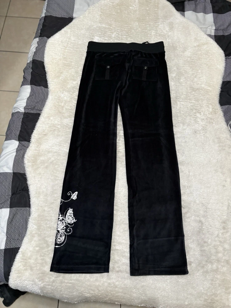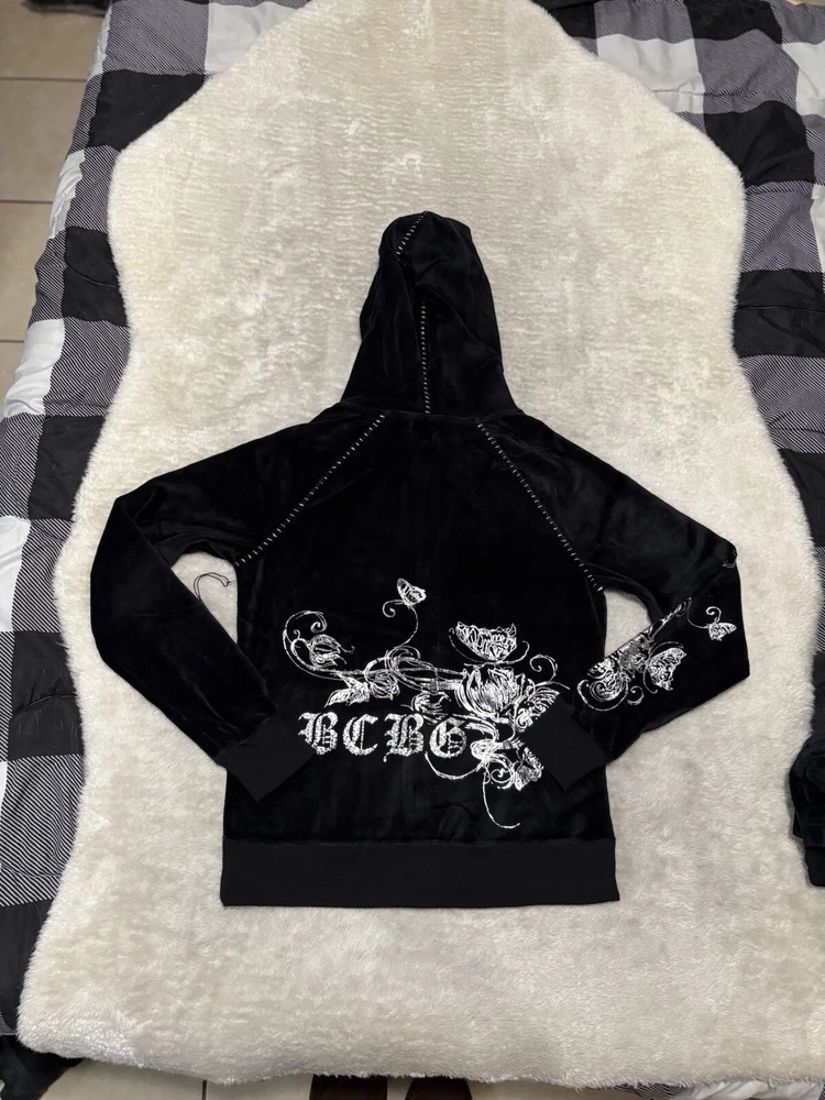 BCBG Max Azria Black Velour Track Suit Set Sz SM Sequin Embellish Pants Hood Y2K