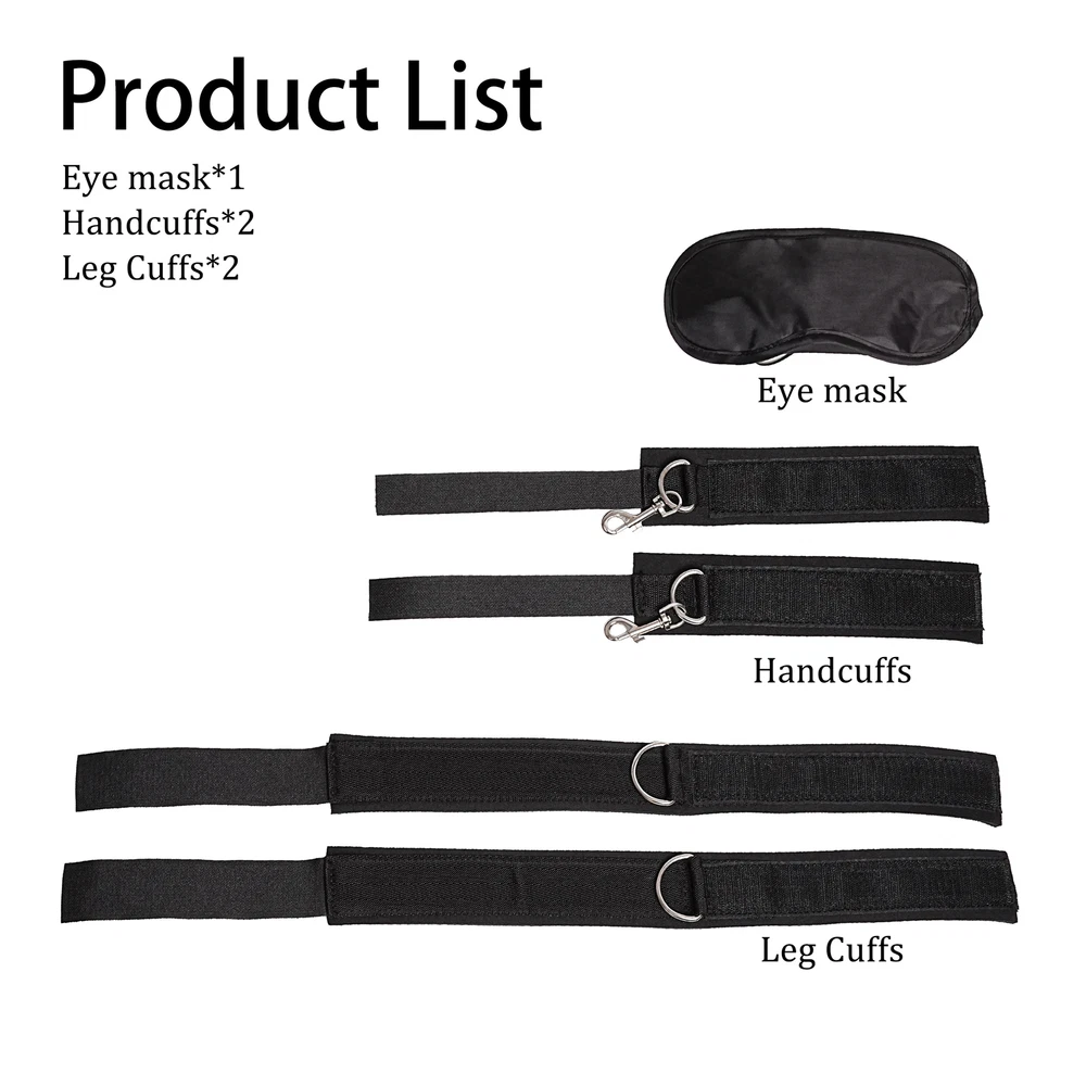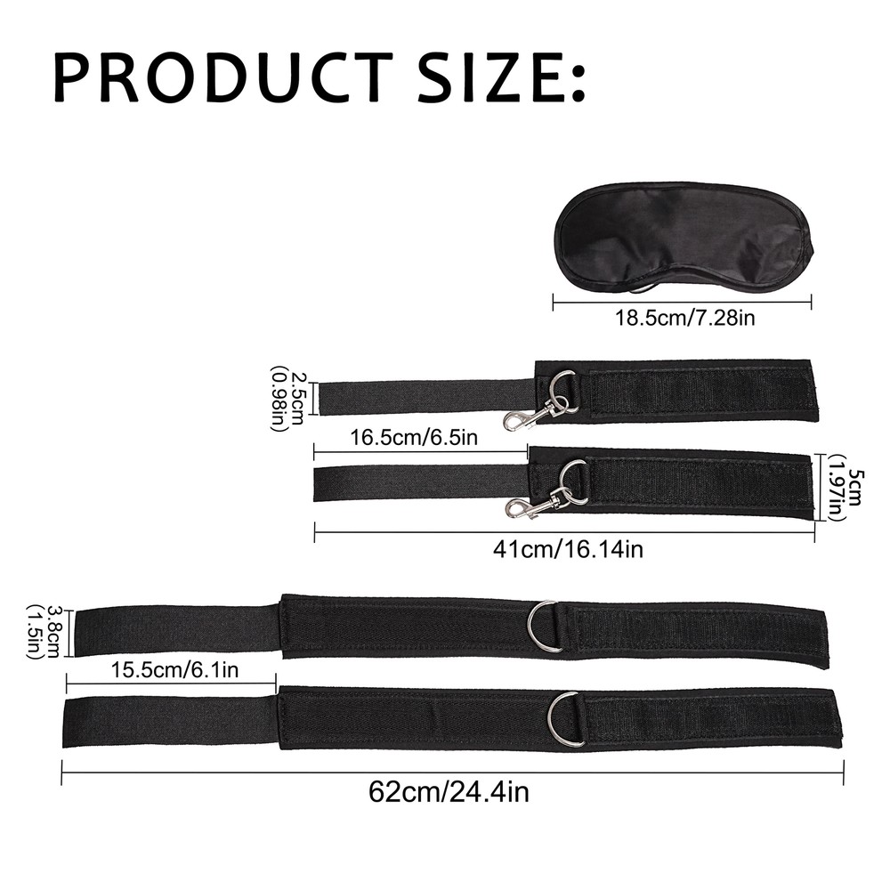 Guarantee 100% discreet shipping on the package and no wirtting on package. Features: 100% Brand New! Adjustable length Straps Easily concealed by tucking under matress when not in use. Thick Sponge straps provide extra security. The joint of handcuff and ankle cuff can be removed Color: Black Material: Sponge Size: Handcuff circumference: 23.7cm AnkleCuff circumference length: 46.7cm Minimum diameter of handcuffs: 6.6cm. Maximum diameter: adjustable according to the degree of use Minimum diameter of handcuff: 13cm. Maximum diameter: adjustable according to the degree of use Net Weight: 158.5g Includes a free gift: a black eye mask Eye mask length: 18.5cm Width: 8cm Package Include:1*Blidfold, 4*Cuffs Note: Because this is the length measured by hand, please allow 1-2cm error, please understand!