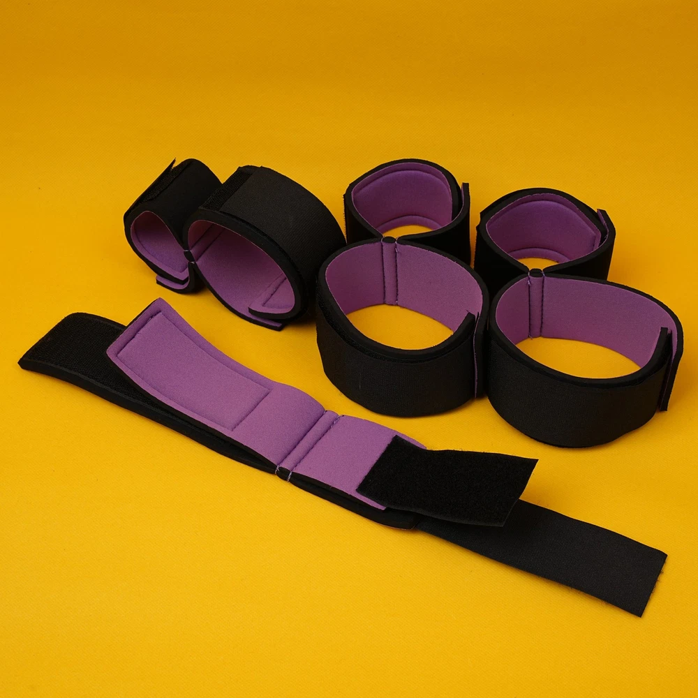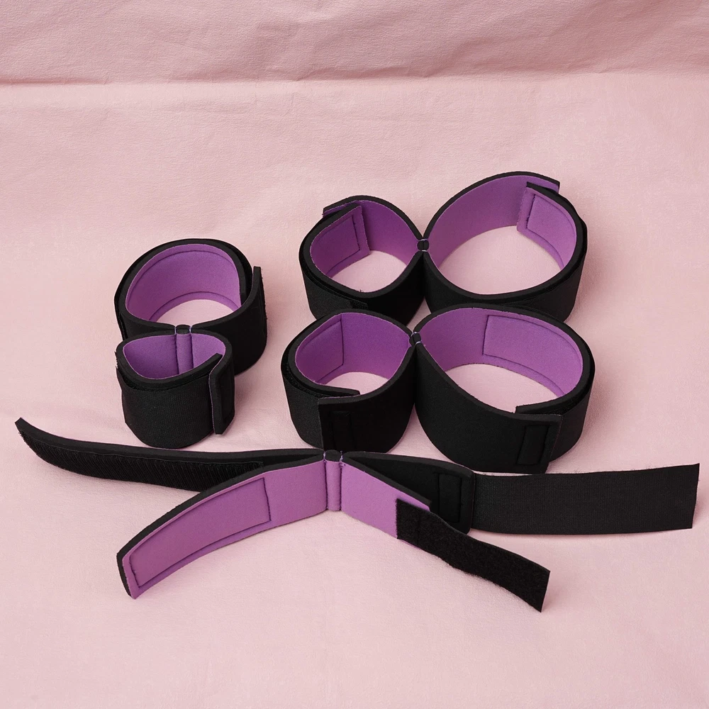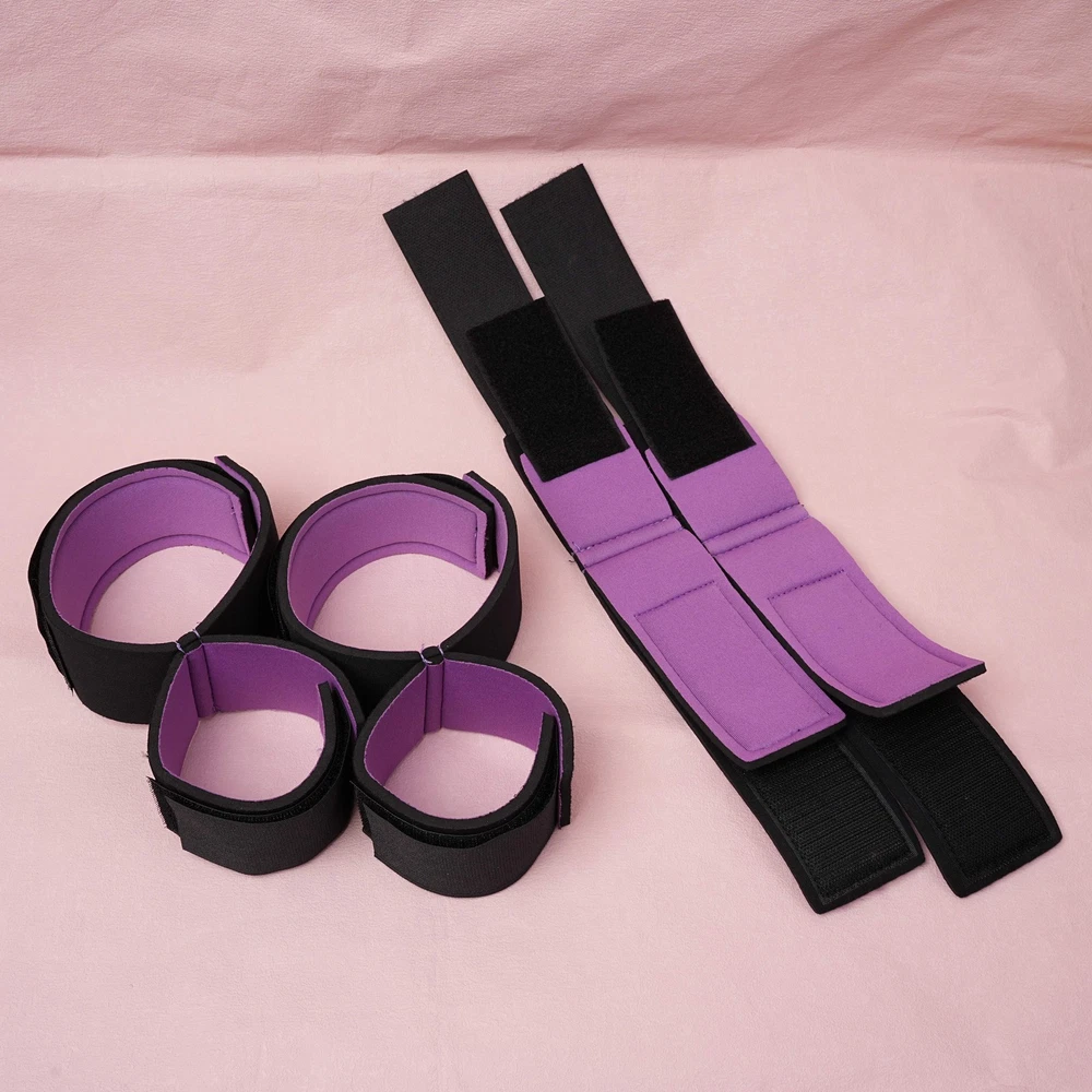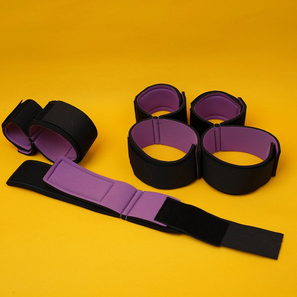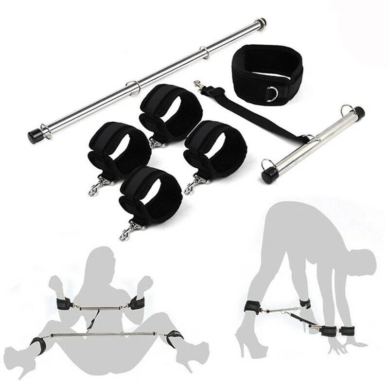 Item A: This BDSM Spreader Bar Kit includes a pair of handcuffs, a pair of footcuffs, two spreader bars, and a neck set. You can mix and match the components to create a variety of actions for added excitement. Details: Type: BDSM Sex Toys Set Includes: Handcuffs, Footcuffs, Spreader Bars Material: Nylon, Stainless Steel Size: Adjustable Item B: Features: Material: Premium Soft Nylon & Sponge Adjustable Cuffs, Fit to most customers' size. Color: Purple Weight: 140g Includings & Size: 2 x Ankle & Wrist Restraint Cuffs 21.5cm & 30cm 2 x Forearm & Leg Restraint Cuffs 28cm & 35.5cm Discreet packaging