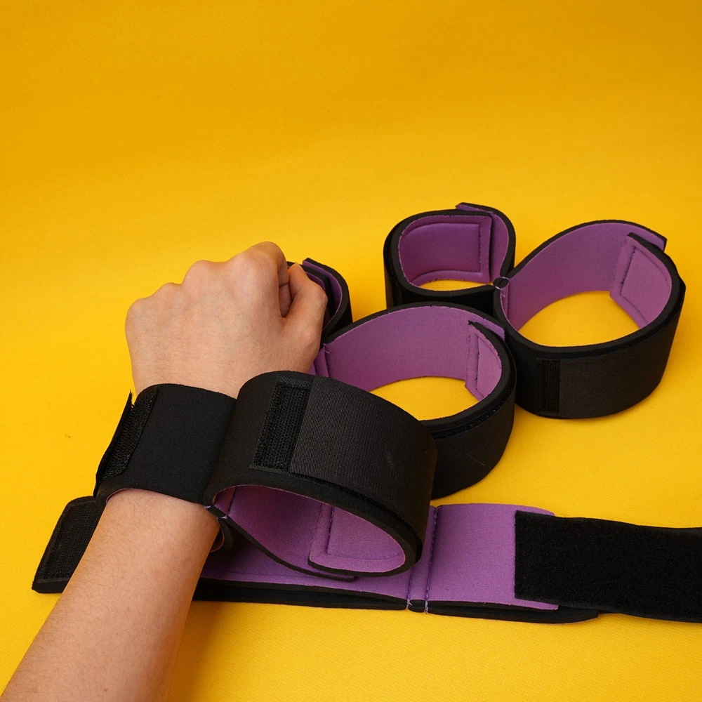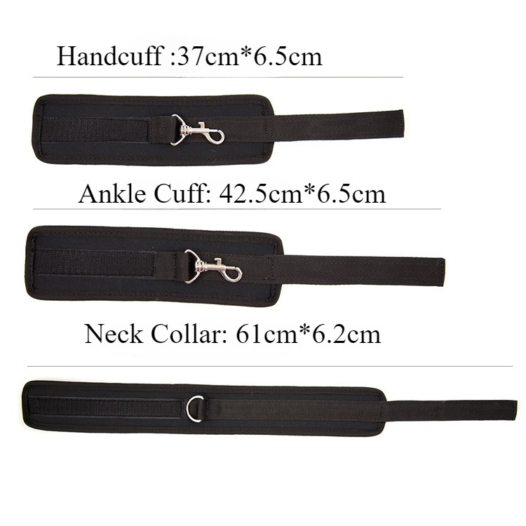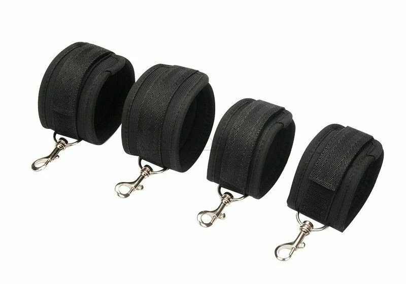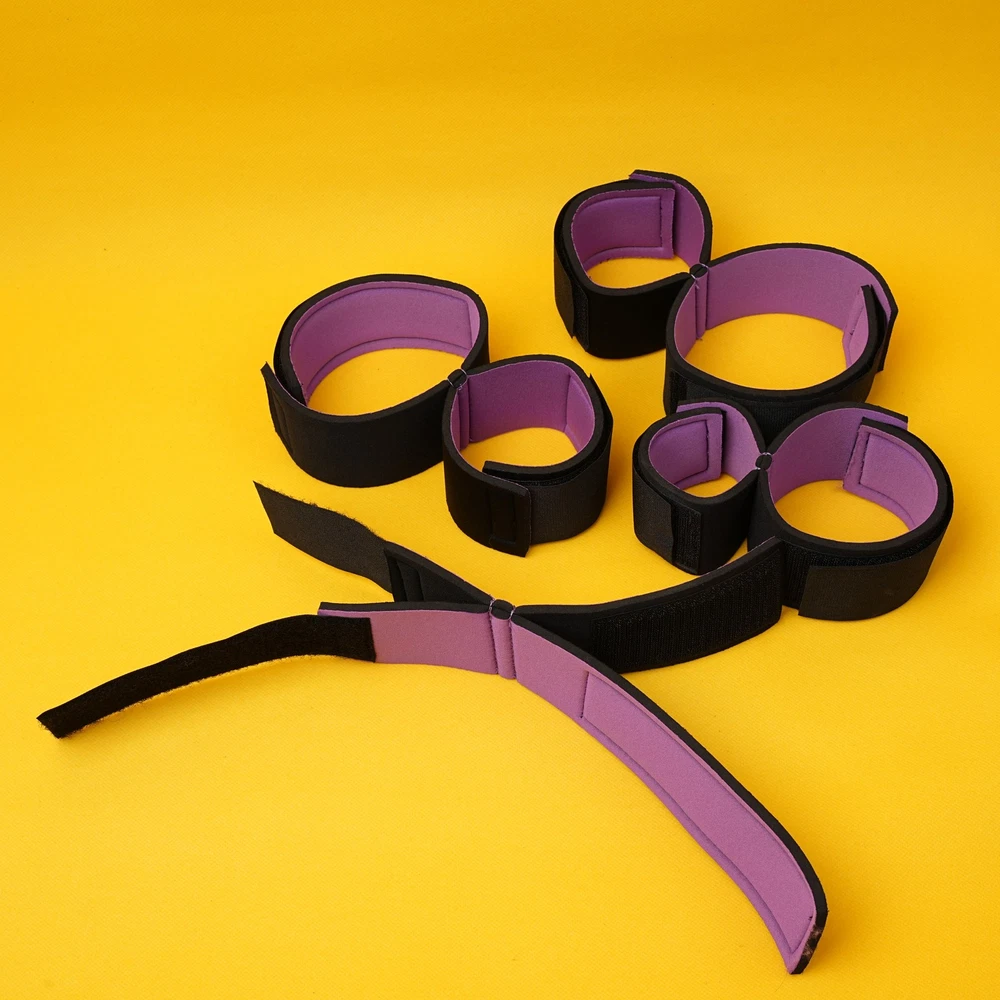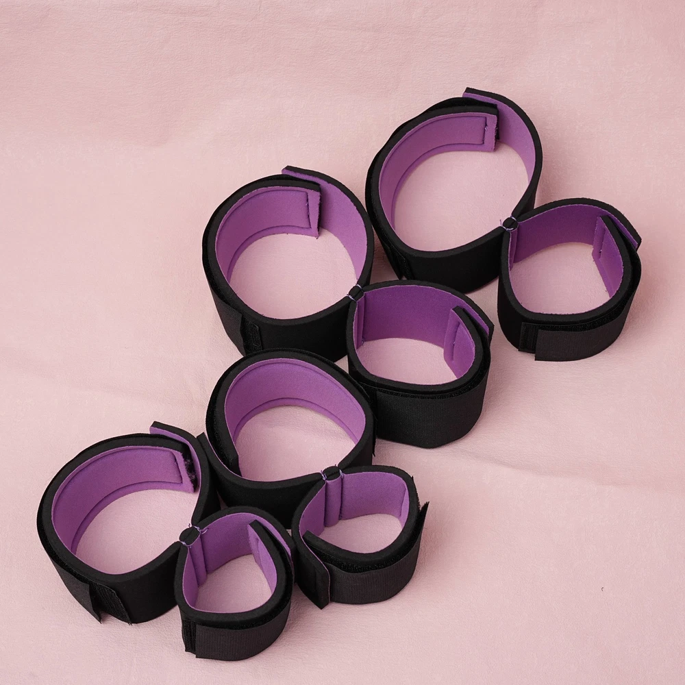 Item A: This BDSM Spreader Bar Kit includes a pair of handcuffs, a pair of footcuffs, two spreader bars, and a neck set. You can mix and match the components to create a variety of actions for added excitement. Details: Type: BDSM Sex Toys Set Includes: Handcuffs, Footcuffs, Spreader Bars Material: Nylon, Stainless Steel Size: Adjustable Item B: Features: Material: Premium Soft Nylon & Sponge Adjustable Cuffs, Fit to most customers' size. Color: Purple Weight: 140g Includings & Size: 2 x Ankle & Wrist Restraint Cuffs 21.5cm & 30cm 2 x Forearm & Leg Restraint Cuffs 28cm & 35.5cm Discreet packaging