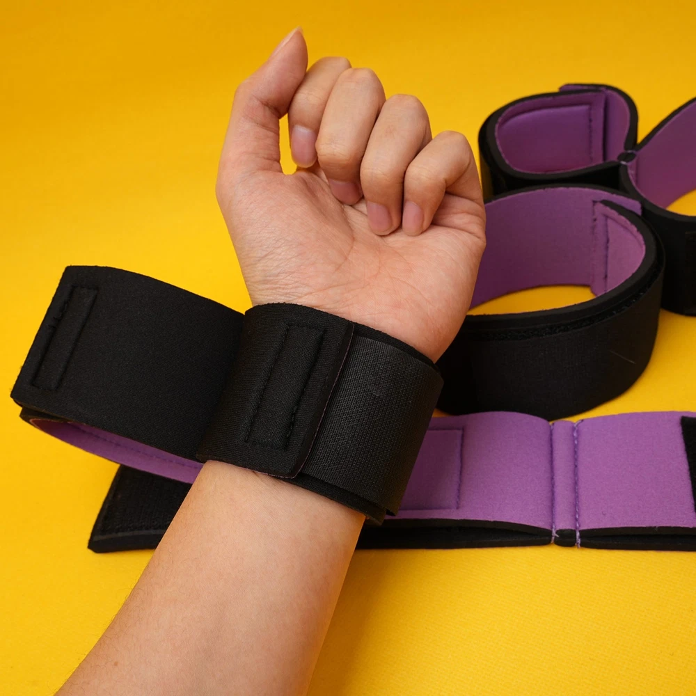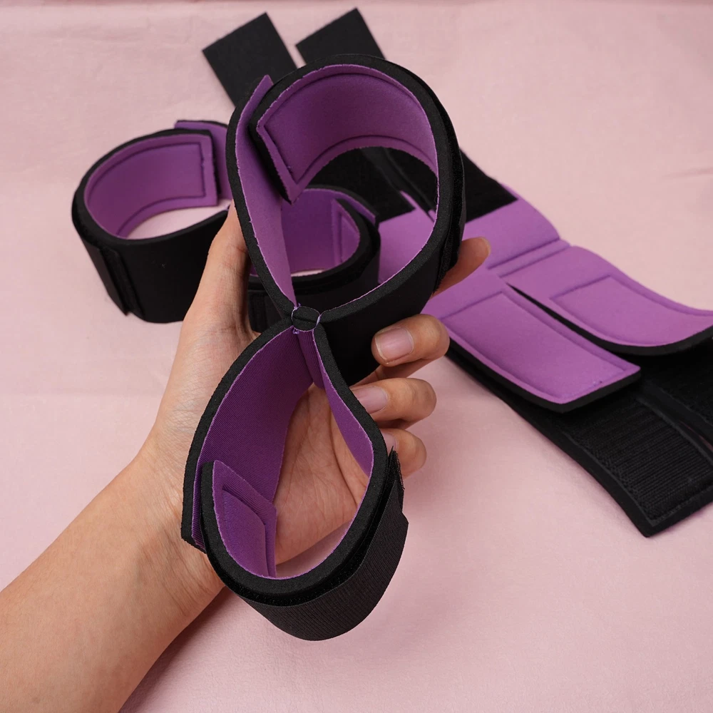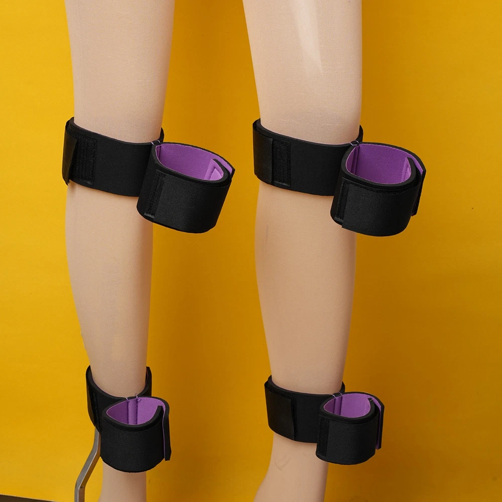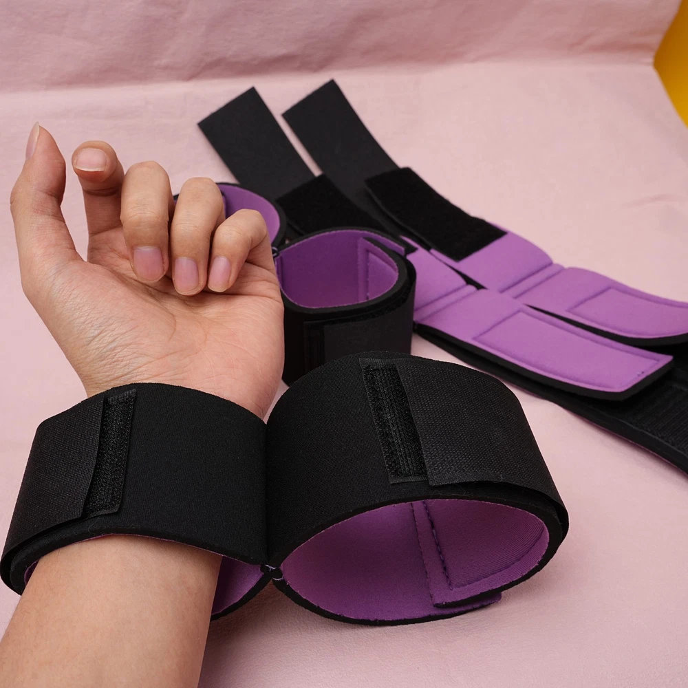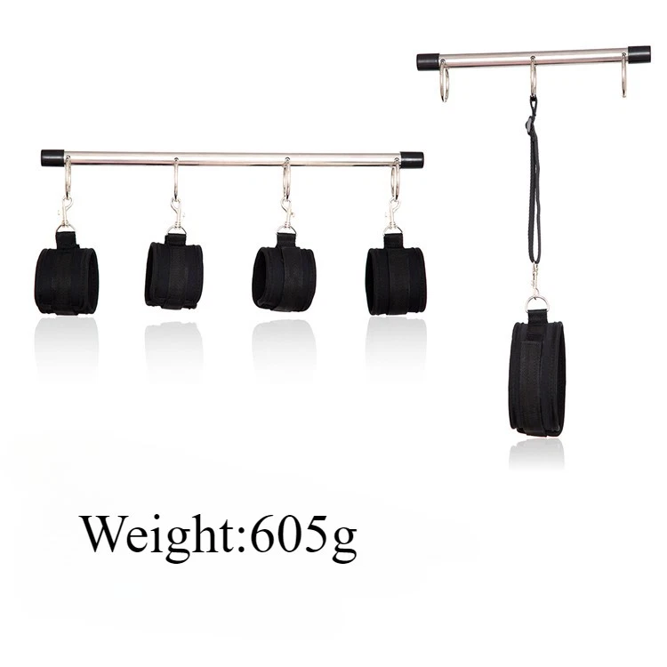Item A: This BDSM Spreader Bar Kit includes a pair of handcuffs, a pair of footcuffs, two spreader bars, and a neck set. You can mix and match the components to create a variety of actions for added excitement. Details: Type: BDSM Sex Toys Set Includes: Handcuffs, Footcuffs, Spreader Bars Material: Nylon, Stainless Steel Size: Adjustable Item B: Features: Material: Premium Soft Nylon & Sponge Adjustable Cuffs, Fit to most customers' size. Color: Purple Weight: 140g Includings & Size: 2 x Ankle & Wrist Restraint Cuffs 21.5cm & 30cm 2 x Forearm & Leg Restraint Cuffs 28cm & 35.5cm Discreet packaging