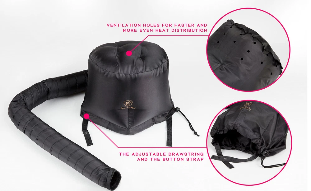 Accommodates a variety of hair styles - Our hair dryer bonnet features an optimized hood size to accommodate various hairstyles, including hair curlers and rollers. The longer, flexible hose is designed for multitasking, allowing you to move freely while conditioning or drying your hair. Advanced heat distribution - Equipped with ventilation holes, the soft bonnet hair dryer ensures faster and more even heat distribution, reducing the time needed for deep conditioning and drying sessions. This efficient design helps to enhance your hair care routine by maximizing the effects of heat treatments. Universal compatibility - The BEAUT'E SEOUL bonnet hair dryers for women fits all hand-held dryers, thanks to its stretchable hose collar (4.5 inches wide) with an adjustable velcro strap. This feature allows for a secure fit, accommodating any size of handheld dryer and ensuring no air escapes during use. Convenient and user-friendly - Designed with an adjustable drawstring and a chin strap, the hair dryer cap bonnet provides a comfortable fit for different head sizes and ensures the cap stays in place during use. The inclusion of a lightweight travel pouch makes it easy to store and transport, perfect for styling on the go. Optimal for various hair treatments - Ideal for hair setting with rollers, deep conditioning, hot oil treatments, and more. This blow dryer hood turns your regular hair dryer into a professional hair drying and treatment system, enhancing the effectiveness of your hair care products and routines. Easy To Use - Our hair dryer cap is equipped with a satin diffuser cap featuring an adjustable drawstring and a chin strap to fit different ages and sizes. Plus, ventilation holes provide faster and more even heat distribution, dramatically reducing deep conditioning time. Save time and effort: Achieve faster, more efficient drying and experience a deeper conditioning treatment with the hair drying cap. Our cap promises to cut drying time by almost half with diffused heat airflow technology.