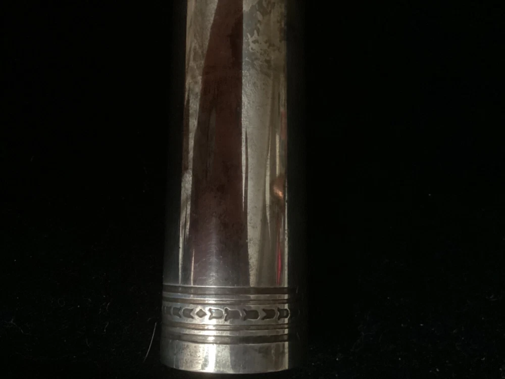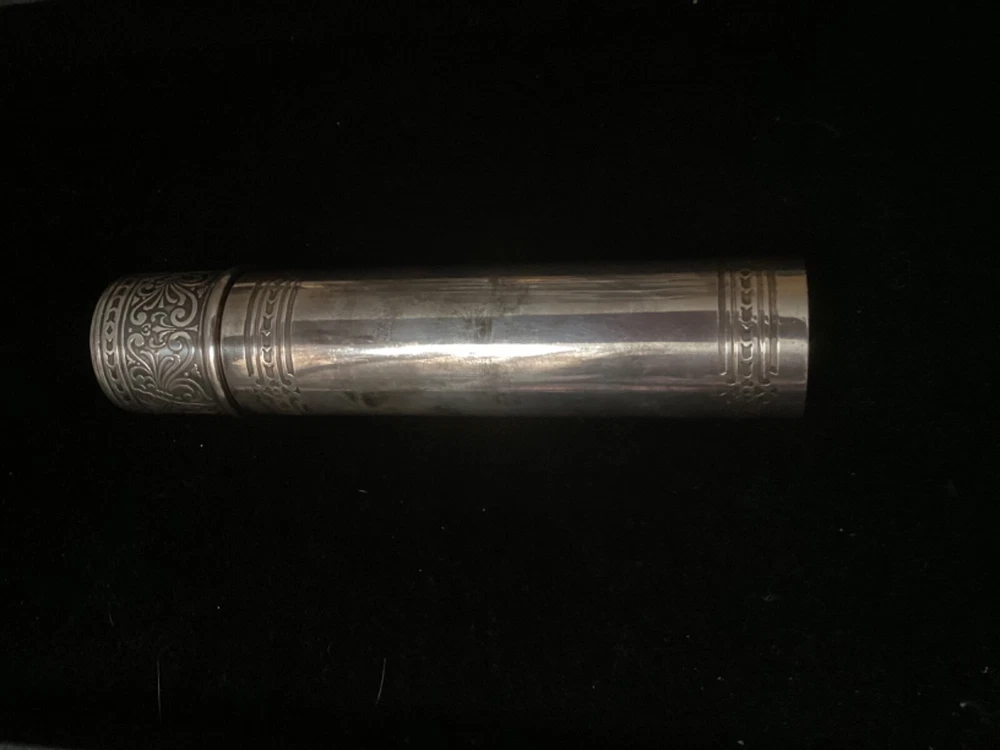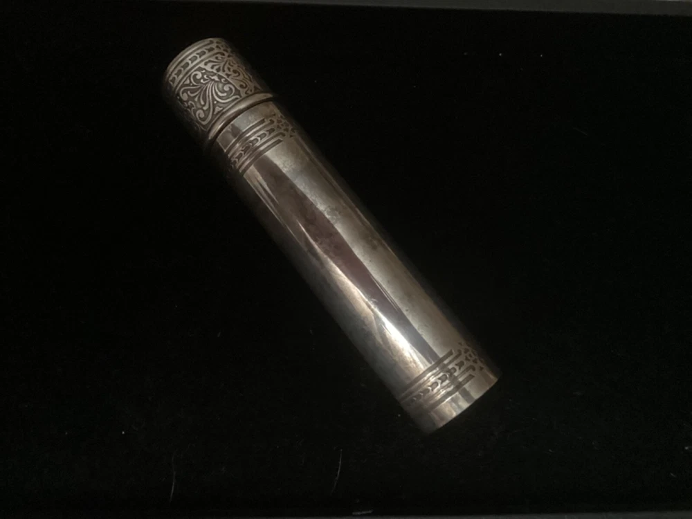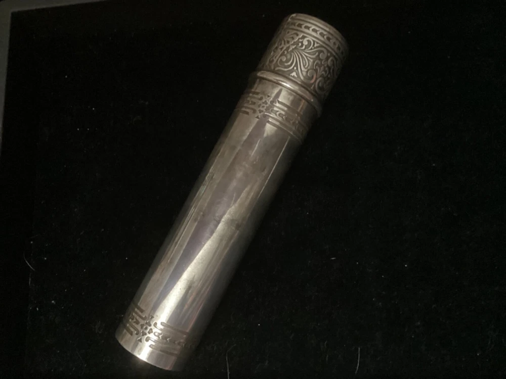 This listing is for a beautiful, large 925 Sterling silver cigar tube, made some time between 1910 and 1947 by Tiffany & Co. The epitome of elegance, it is embossed with a beautiful pattern on the entire cap, and around the borders of the tube itself. This piece is quite substantial. On my postage scale, it weighs 6.4 ounces. It measures 6 1/2” long with the cap on, and is about 1.5” in diameter. It is in excellent condition with no dings or scratches. I chose not to clean it with any type of silver polish—just buffed it up a little bit with a silver cloth. I rotated the tube as I was taking photos so that you could see all sides Please ask any questions you may have before making a purchase, as I do not accept returns. Thanks for looking!!