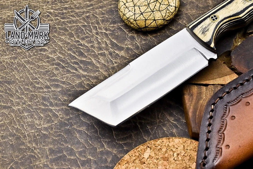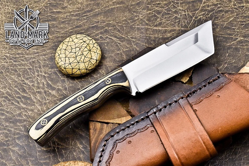Custom Hand Made D2 STEEL HUNTING KNIFE WITH BLACK HANDLE We offer a shipping discount for More then one purchased . And discount will be apply on combine invoice, Discount will not apply on separate payment. ITEM DETAILS OVER ALL LENGTH 8.0 inches long (Approx) HANDLE LENGTH 4.0 inches long (Approx) BLADE LENGTH 4.0 inches long (Approx) BLADE HARDNESS 58-60 HRC Which Holds The Sharp Edge For Long Time. HANDLE PAKKA WOOD COVER LEATHER SHEATH This Awesome custom made KNIFE has a nice hand forged with the combination of 4340 & 1080 steel. HOW OUR DAMASCUS IS MADE: All our Damascus is real and not just an acid etch. Damascus is a mixture of 1080HC and 4340 nickel carbon. You heat them up together and then fold the bar over and over to get the desired layers, ours are 396 layers. Then you burn the blade in acid, and it turns the nickel satin color and the high carbon turns blackish gray. This is how the layers are exposed to show the layers of the new steel created coined "Damascus". All Damascus is acid etched to show the layers. If you high polish the metal it will be shinny satin like all steels. Only after you burn the sides of the blade with acid do you see the layers of the two steels. Makes sense? After we make our knives we high polish the handles and put an edge on the blade. The high polishing buffs off the acid burned layer of the handle, and the blade edge is sharpened and the acid burned edge becomes satin. You can re-burn the tang of the blade near the handles and the edge of the blade and it will show the layers once more. All our knives are hand made, durable and unique ***** YOU WILL RECEIVED THE SAME KNIFE Qality Standards Our Damascus blades are made from high quality non-stainless steels which rival or exceed any Damascus blade made from the 10 series with 4340. Our Damascus combination has taken years to perfect and has been tested under a variety of application which will offer professional performance in categories of toughness, strength (lateral stress) and edge honing and holding ability. In a 5 spot Rockwell test our blades will average near or close to 58 which offers a perfect balances between its toughness and strength.Our blades due to carbon content need to be regularly treated with wax and/or 3 in 1 oil to maintain its superior quality. Questions if you have any question feel free to send us message we aim to answer all questions within 24 hours Feedback If you are not satisfied with our service please contact us before leaving any negative or natural feedback. We will resolve all issues as quickly as possible. Disclaimer We are not responsible for any injuries associated with the use of our tools. Our products are intended for legal use only by responsible buyers. Therefore, we will not sell our products to anyone under the age of 18. Before bidding please check your country laws as some countries Custom don't allow this. If your purchase is held by Custom Authorities in your country/State we will not be responsible for that and no refund will be issued Shipping We offer a 20% shipping discount for More then one purchased . And discount will be apply on combine invoice, Discount will not apply on separate payment We ship within 24 hours after receiving complete payment but this can be delayed due to week ends or Governments and Religious Festivals . . This is beyond our control and we apologize for this inconvenience. Precautions Our Tools are very sharp so open and use them very carefully We are not responsible for any injuries associated with the use of our tools Tips to Care knife 1. NEVER STORE YOUR KNIFE FOR LONG TIME IN LEATHER SHEATH. 2. LEATHER CAN ABSORB WATER, WHICH WILL RUST THE KNIFE. 3. ALWAYS CLEAN THE BLADE AFTER USING WITH OIL OR WAX