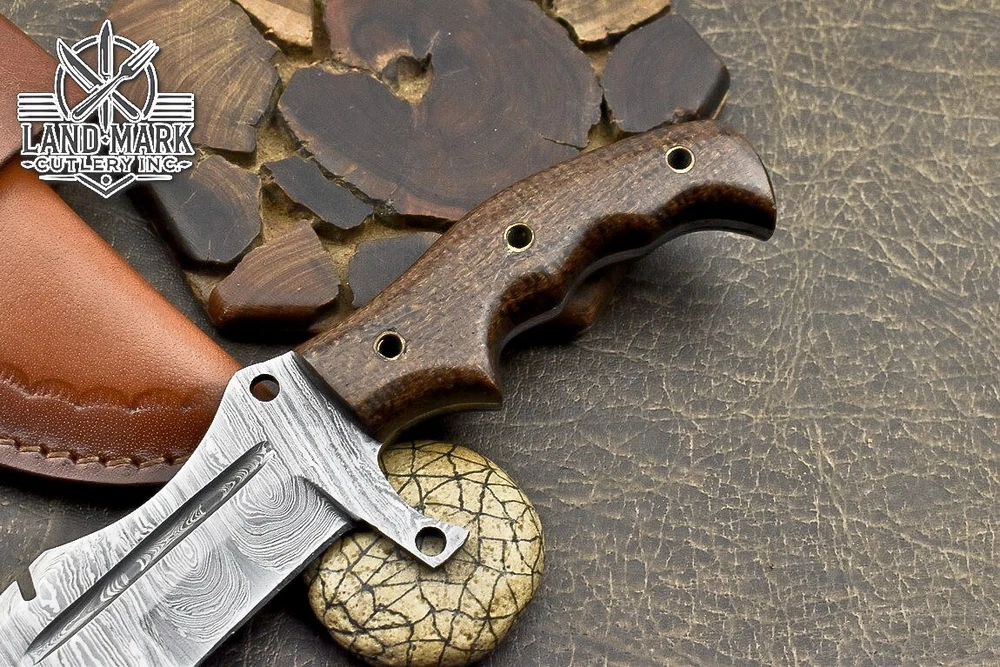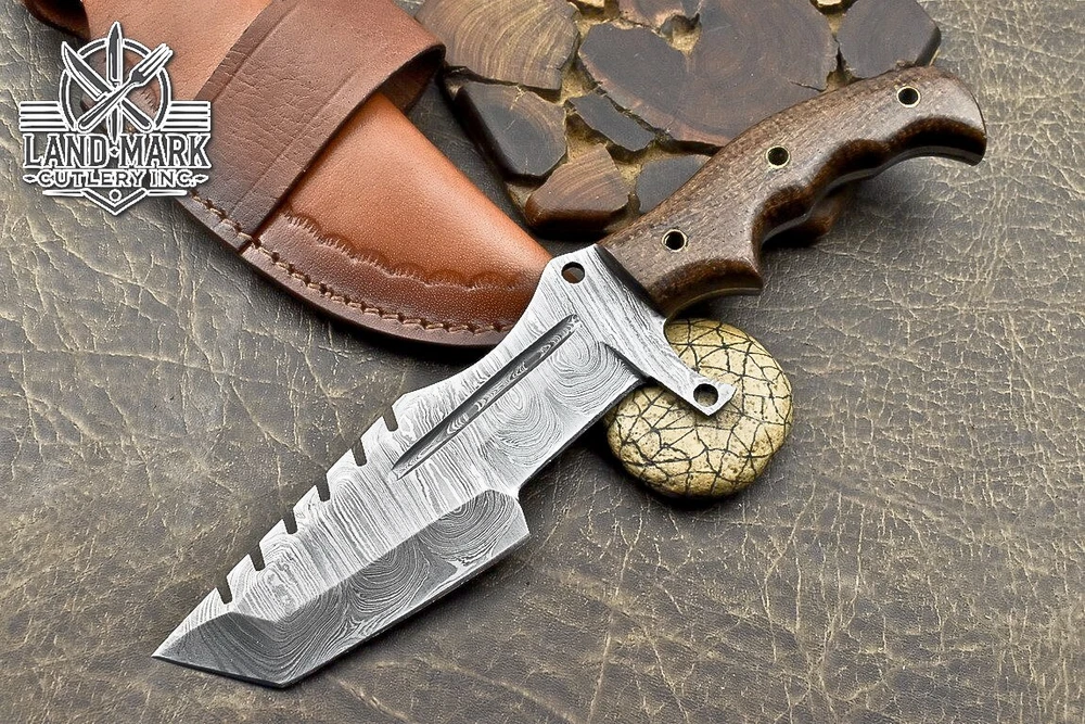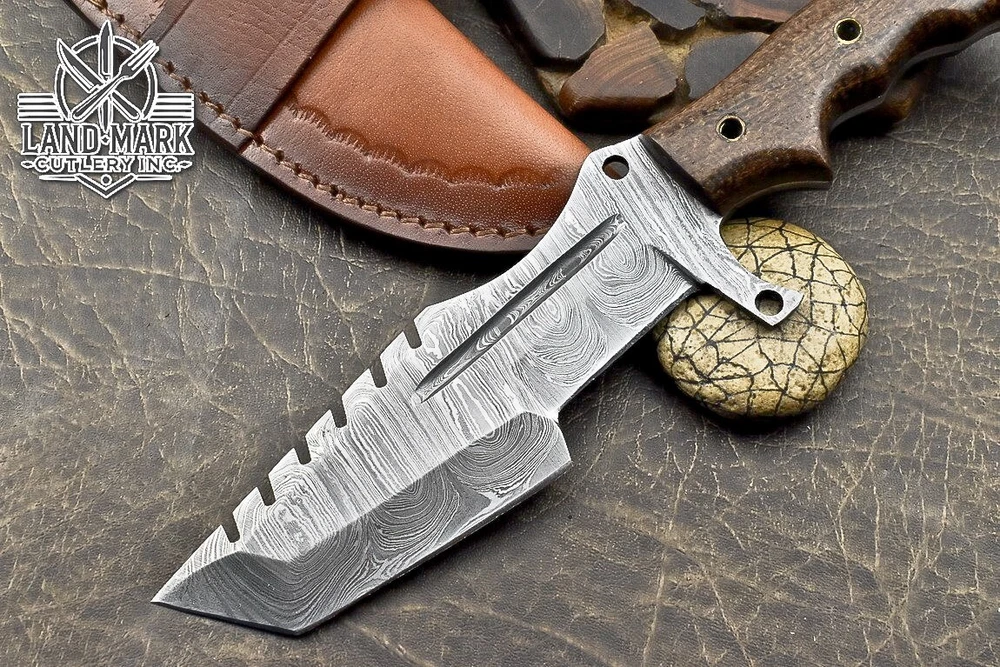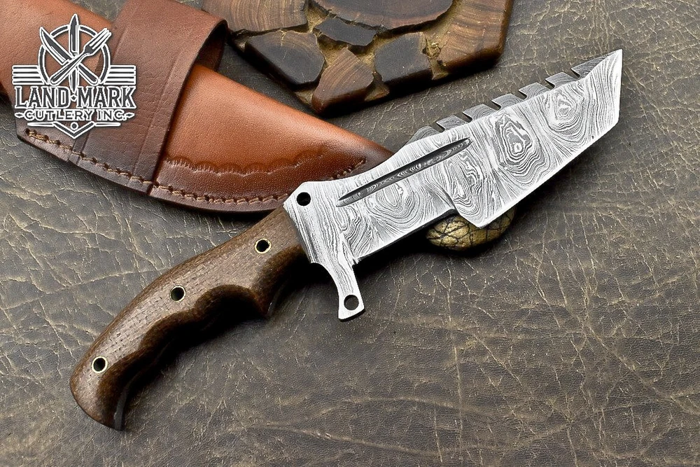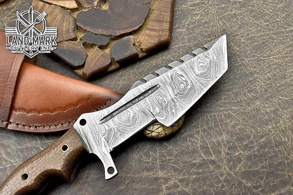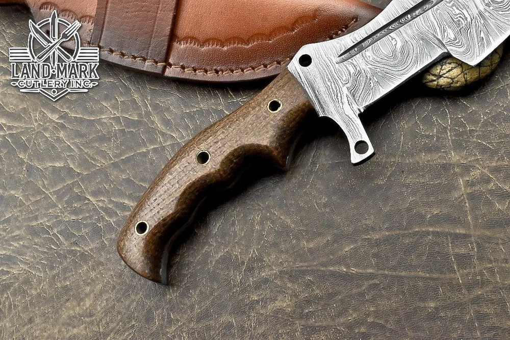 Custom Hand Made DAMASCUS STEEL HUNTING TRACKERE KNIFE WITH MICARTA HANDLE We offer a shipping discount for More then one purchased . And discount will be apply on combine invoice, Discount will not apply on separate payment. ITEM DETAILS OVER ALL LENGTH 11.0 inches long (Approx) HANDLE LENGTH 5.0inches long (Approx) BLADE LENGTH 6.0 inches long (Approx) BLADE HARDNESS 58-60 HRC Which Holds The Sharp Edge For Long Time. HANDLE MICARTA COVER LEATHER SHEATH This Awesome custom made KNIFE has a nice hand forged with the combination of 4340 & 1080 steel. HOW OUR DAMASCUS IS MADE: All our Damascus is real and not just an acid etch. Damascus is a mixture of 1080HC and 4340 nickel carbon. You heat them up together and then fold the bar over and over to get the desired layers, ours are 396 layers. Then you burn the blade in acid, and it turns the nickel satin color and the high carbon turns blackish gray. This is how the layers are exposed to show the layers of the new steel created coined "Damascus". All Damascus is acid etched to show the layers. If you high polish the metal it will be shinny satin like all steels. Only after you burn the sides of the blade with acid do you see the layers of the two steels. Makes sense? After we make our knives we high polish the handles and put an edge on the blade. The high polishing buffs off the acid burned layer of the handle, and the blade edge is sharpened and the acid burned edge becomes satin. You can re-burn the tang of the blade near the handles and the edge of the blade and it will show the layers once more. All our knives are hand made, durable and unique ***** YOU WILL RECEIVED THE SAME KNIFE Qality Standards Our Damascus blades are made from high quality non-stainless steels which rival or exceed any Damascus blade made from the 10 series with 4340. Our Damascus combination has taken years to perfect and has been tested under a variety of application which will offer professional performance in categories of toughness, strength (lateral stress) and edge honing and holding ability. In a 5 spot Rockwell test our blades will average near or close to 58 which offers a perfect balances between its toughness and strength.Our blades due to carbon content need to be regularly treated with wax and/or 3 in 1 oil to maintain its superior quality. Questions if you have any question feel free to send us message we aim to answer all questions within 24 hours Feedback If you are not satisfied with our service please contact us before leaving any negative or natural feedback. We will resolve all issues as quickly as possible. Disclaimer We are not responsible for any injuries associated with the use of our tools. Our products are intended for legal use only by responsible buyers. Therefore, we will not sell our products to anyone under the age of 18. Before bidding please check your country laws as some countries Custom don't allow this. If your purchase is held by Custom Authorities in your country/State we will not be responsible for that and no refund will be issued Shipping We offer a 20% shipping discount for More then one purchased . And discount will be apply on combine invoice, Discount will not apply on separate payment We ship within 24 hours after receiving complete payment but this can be delayed due to week ends or Governments and Religious Festivals . . This is beyond our control and we apologize for this inconvenience. Precautions Our Tools are very sharp so open and use them very carefully We are not responsible for any injuries associated with the use of our tools Tips to Care knife 1. NEVER STORE YOUR KNIFE FOR LONG TIME IN LEATHER SHEATH. 2. LEATHER CAN ABSORB WATER, WHICH WILL RUST THE KNIFE. 3. ALWAYS CLEAN THE BLADE AFTER USING WITH OIL OR WAX