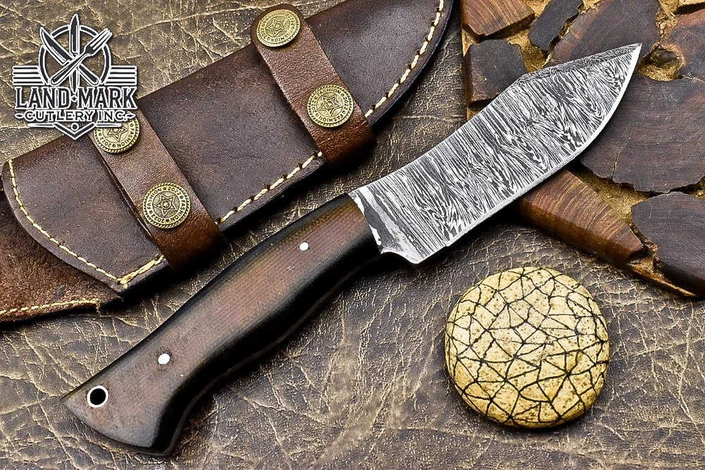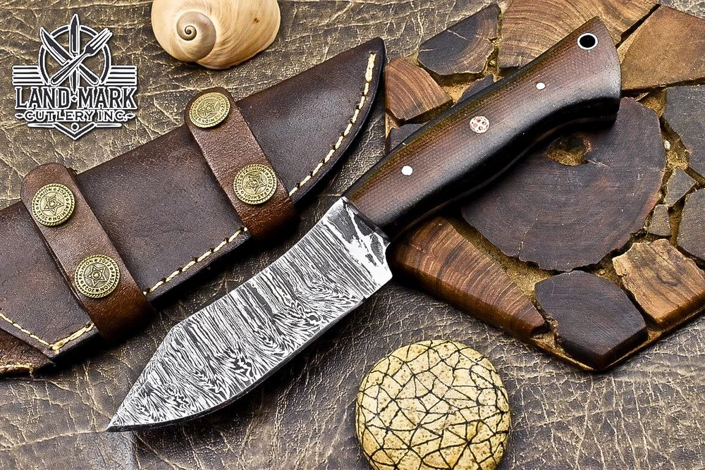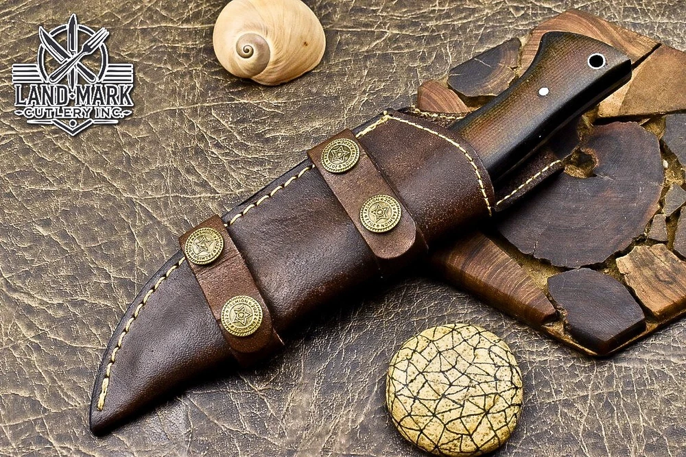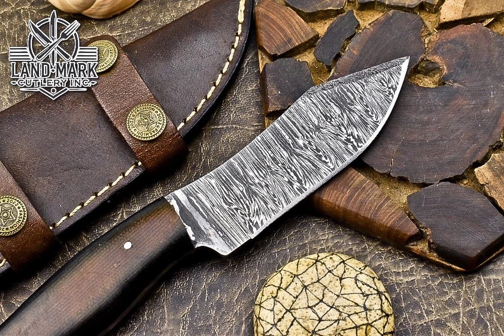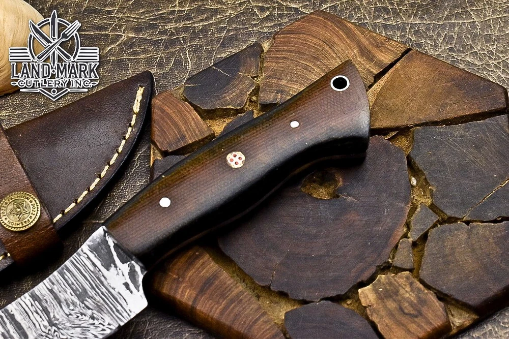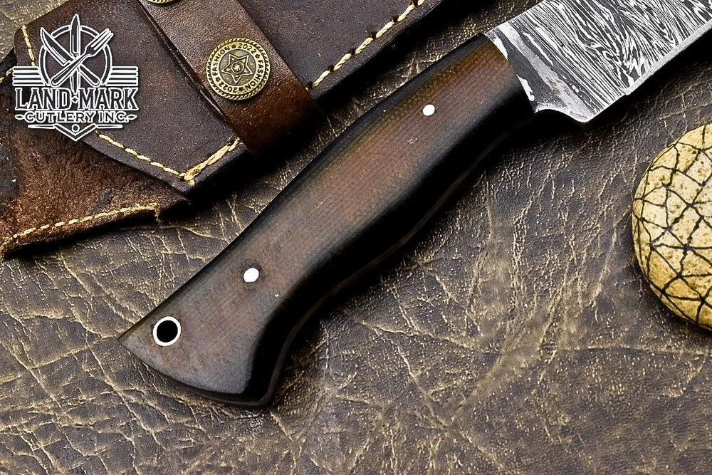 Custom Hand Made DAMASCUS STEEL HUNTING KNIFE WITH MICARTA HANDLE We offer a shipping discount for More then one purchased . And discount will be apply on combine invoice, Discount will not apply on separate payment. ITEM DETAILS OVER ALL LENGTH 8.0 inches long (Approx) HANDLE LENGTH 4.0 inches long (Approx) BLADE LENGTH 4.0 inches long (Approx) BLADE HARDNESS 58-60 HRC Which Holds The Sharp Edge For Long Time. HANDLE MICARTA COVER LEATHER SHEATH This Awesome custom made KNIFE has a nice hand forged with the combination of 4340 & 1080 steel. HOW OUR DAMASCUS IS MADE: All our Damascus is real and not just an acid etch. Damascus is a mixture of 1080HC and 4340 nickel carbon. You heat them up together and then fold the bar over and over to get the desired layers, ours are 396 layers. Then you burn the blade in acid, and it turns the nickel satin color and the high carbon turns blackish gray. This is how the layers are exposed to show the layers of the new steel created coined "Damascus". All Damascus is acid etched to show the layers. If you high polish the metal it will be shinny satin like all steels. Only after you burn the sides of the blade with acid do you see the layers of the two steels. Makes sense? After we make our knives we high polish the handles and put an edge on the blade. The high polishing buffs off the acid burned layer of the handle, and the blade edge is sharpened and the acid burned edge becomes satin. You can re-burn the tang of the blade near the handles and the edge of the blade and it will show the layers once more. All our knives are hand made, durable and unique ***** YOU WILL RECEIVED THE SAME KNIFE Qality Standards Our Damascus blades are made from high quality non-stainless steels which rival or exceed any Damascus blade made from the 10 series with 4340. Our Damascus combination has taken years to perfect and has been tested under a variety of application which will offer professional performance in categories of toughness, strength (lateral stress) and edge honing and holding ability. In a 5 spot Rockwell test our blades will average near or close to 58 which offers a perfect balances between its toughness and strength.Our blades due to carbon content need to be regularly treated with wax and/or 3 in 1 oil to maintain its superior quality. Questions if you have any question feel free to send us message we aim to answer all questions within 24 hours Feedback If you are not satisfied with our service please contact us before leaving any negative or natural feedback. We will resolve all issues as quickly as possible. Disclaimer We are not responsible for any injuries associated with the use of our tools. Our products are intended for legal use only by responsible buyers. Therefore, we will not sell our products to anyone under the age of 18. Before bidding please check your country laws as some countries Custom don't allow this. If your purchase is held by Custom Authorities in your country/State we will not be responsible for that and no refund will be issued Shipping We offer a 20% shipping discount for More then one purchased . And discount will be apply on combine invoice, Discount will not apply on separate payment We ship within 24 hours after receiving complete payment but this can be delayed due to week ends or Governments and Religious Festivals . . This is beyond our control and we apologize for this inconvenience. Precautions Our Tools are very sharp so open and use them very carefully We are not responsible for any injuries associated with the use of our tools Tips to Care knife 1. NEVER STORE YOUR KNIFE FOR LONG TIME IN LEATHER SHEATH. 2. LEATHER CAN ABSORB WATER, WHICH WILL RUST THE KNIFE. 3. ALWAYS CLEAN THE BLADE AFTER USING WITH OIL OR WAX