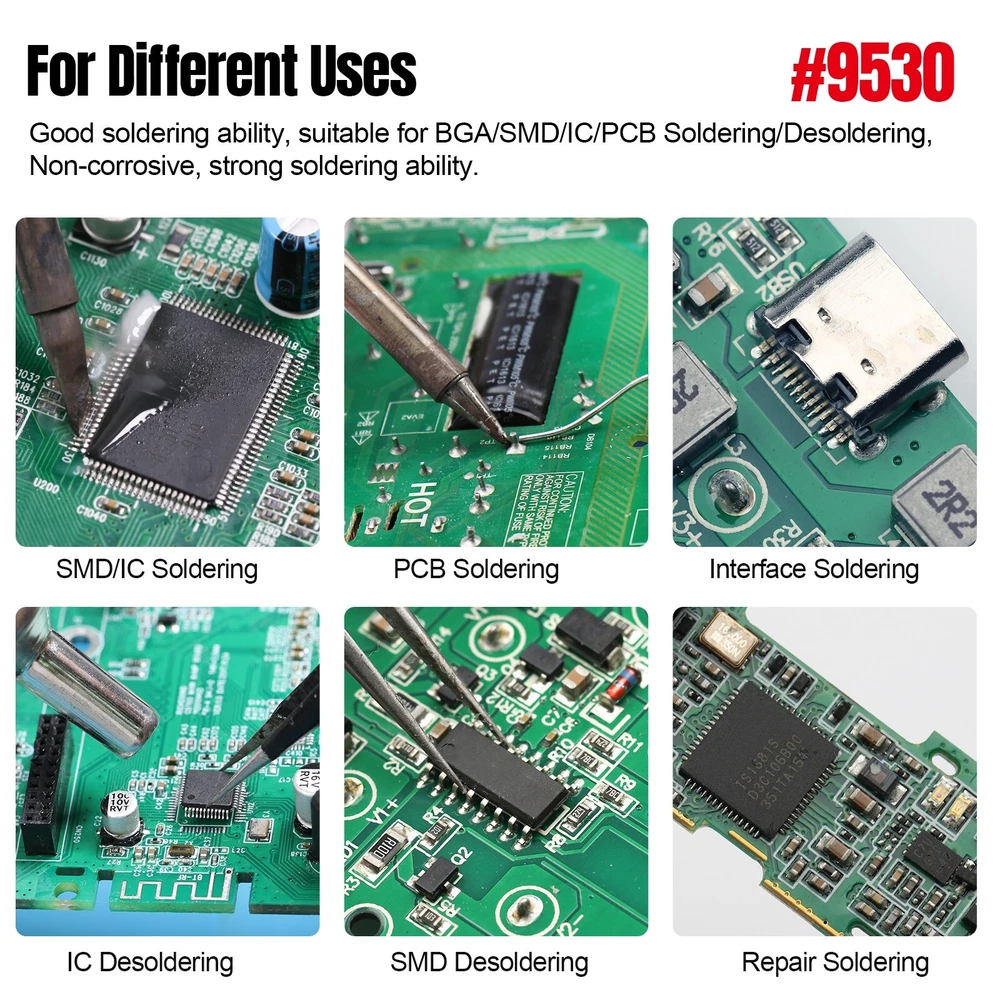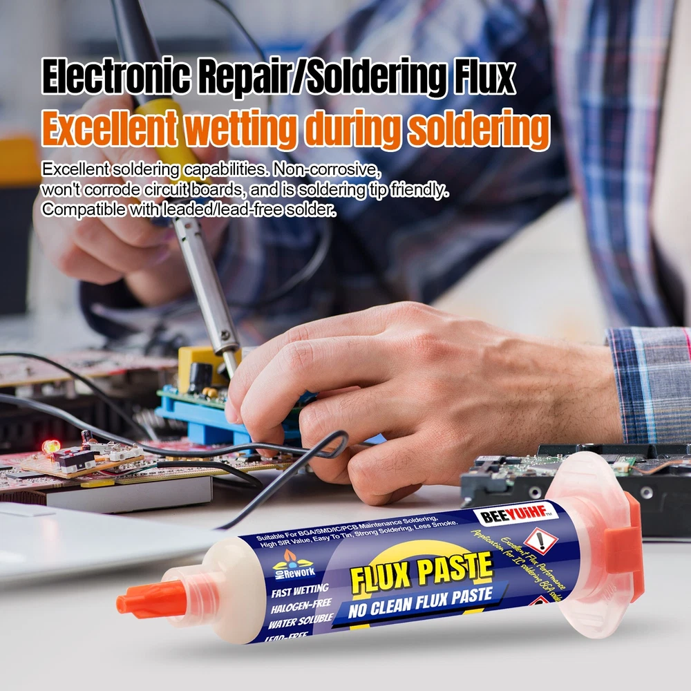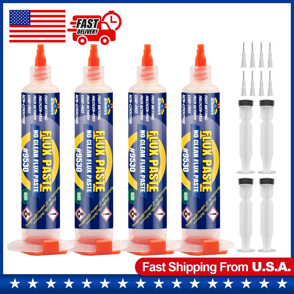 BEEYUIHF No-Clean Soldering Flux Paste for SMD PCB BGA Electronics #9530 (4 Pack) Technical Parameter: Brand:BEEYUIHF Type: Industrial grade Rosin Soler Paste Flux Volume: 10cc/10mL Quantity: 4 Pack Shell: Syringe Paste color: slightly yellow Model:9530 【BEEYUIHF #9530 is a no-clean ultra low residue flux】 It was support the soldering of high-density, miniaturized, ultra-fine copper pillars and microsphere bumped flip-chip IC packages. This flux suitable for small and intensive welding equipment such as precision type solder, BGA soldering and SMD soldering. 【9530 High-activity flux increases the fluidity of tin】Soldering with the addition of flux can drive the fluidity of tin, making tin plating very simple and lightweight. Flux can automatically home in on electronic components to achieve precise soldering and the highest quality results. 【9530 - No-Clean Halogen-Free Flux】 This soldering flux formula with a unique halogen-free activator system.It is a no-clean flux with a low solids content that leaves virtually no residue. Solder joints appear shiny after soldering, even without cleaning. 9530 is room temperature stable and does not require refrigeration for long-term storage. Fill the 5cc syringe with flux before use, the compact syringe is very easy and light to operate, 30cc flux can meet the needs of multiple soldering. BEEYUIHF 9530 flux is an ultra-low residue flux with less than 8% (w/w) residue after reflow, which is 2 times less residue than traditional rosin-based fluxes, a very surprising statistic. This No clean flux is the best soldering flux for electronic soldering and surface mount assembly. Industrial grade Solder Flux advantage: Lead-Free, No-Clean, halogen-free, acid-free, no corrosion, high intensity joint, good immersion,good insulation, very little residue, easy to tin, help soldering firm, make soldering fluidity better, slightly yellow paste. Welding Flux Application: Mobile phone repair, computer and digital service industries, high-precision circuit board SMT soldering, BGA welding process, Maintenance drag soldering, BGA planting tin, maintenance desoldering, electronic components soldering, mobile phone maintenance, mobile phone chip maintenance, LED lighting, home appliance maintenance,etc. About our Soldering Flux Paste: No Clean Flux Paste. Convenient syringe dispenser ideal for touch up and repair of surface mount assemblies. Soldering Flux Paste Features : 1.Made of no acid soldering flux, in a syringe, easy to squeeze out the required volume at any time. 2.Have strong oxide removal effect to gold-copper alloy substrate and wire. 3.Strong welding power, joint high intensity, low residual. 4.This flux have stable performance and low volatility, long use cycles, no irritant smell. 5.It’s the ideal auxiliary products for High quality electronic products manufacturing.