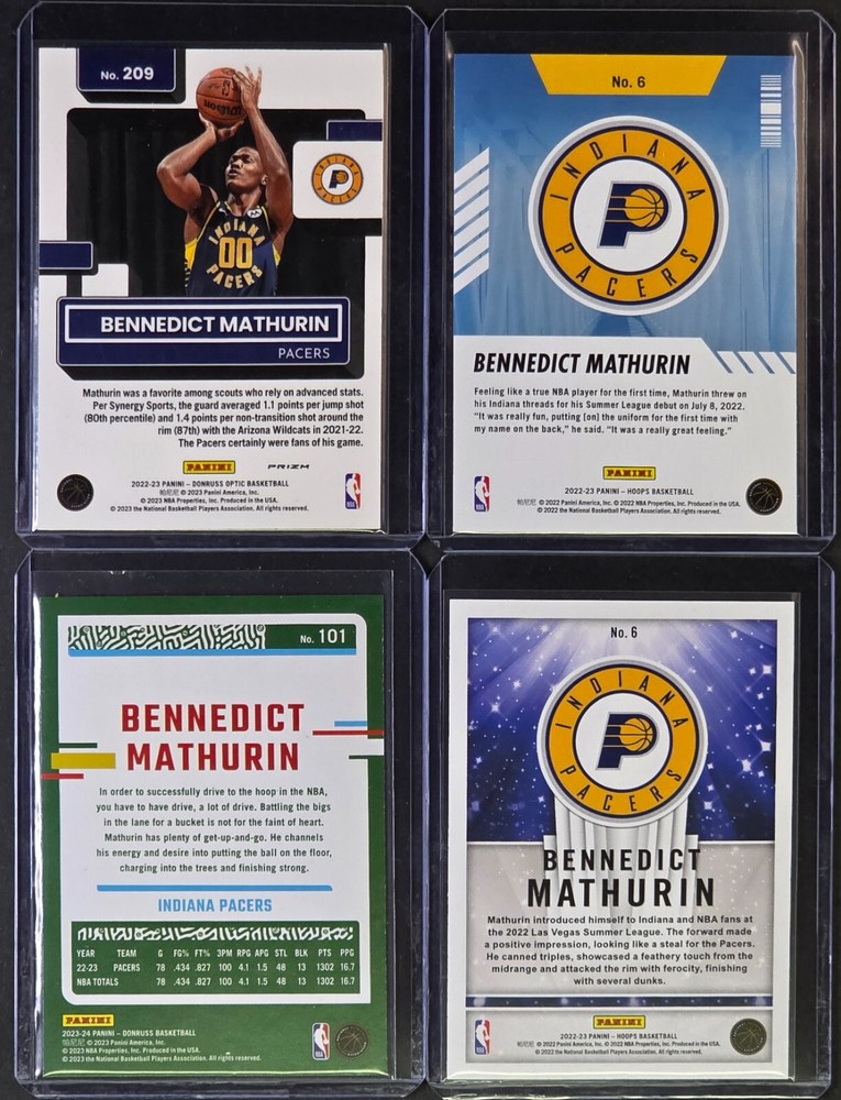 The Benedict Mathurin 4-Card Lot consists of two Optic cards featuring a Purple Shockwave design and two Donruss cards with a Green Holo Laser finish. These original sports trading cards showcase the Indiana Pacers player in the National Basketball Association (NBA) for the 2022-24 season. Manufactured by Panini, the standard-sized cards are made of card stock and are part of various sets like 2023-24 Panini Donruss and 2022-23 Panini NBA HOOPS. Each card offers a unique design and features a base set for basketball fans looking to collect and trade cards of their favorite player.