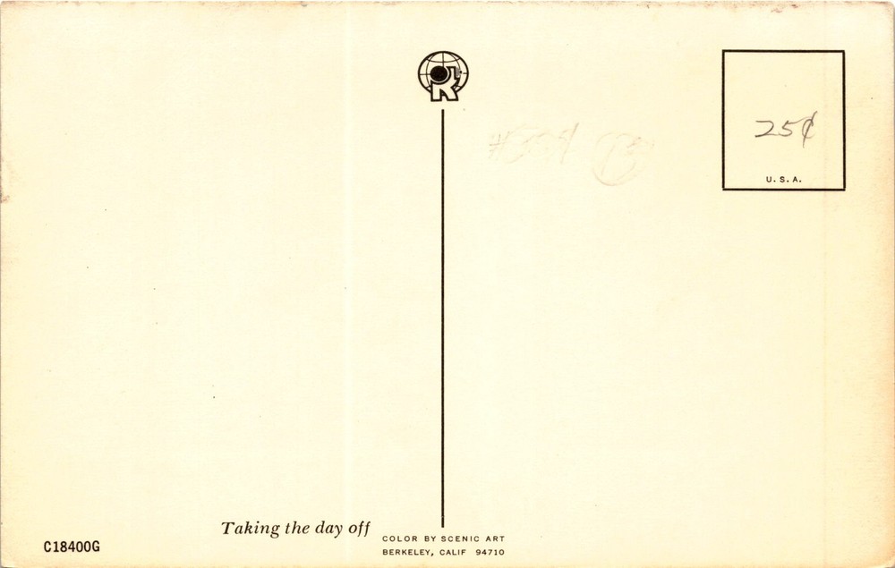 MAKE AN OFFER. THE MORE YOU BUY THE BETTER DEAL I WILL ACCEPT The postcard is from Berkeley, California, featuring a scenic art image. The front of the postcard mentions Taking the day off and includes a reference number C18400G. The back of the postcard provides the address and details of the publisher, COLOR BY SCENIC ART located in Berkeley, California.