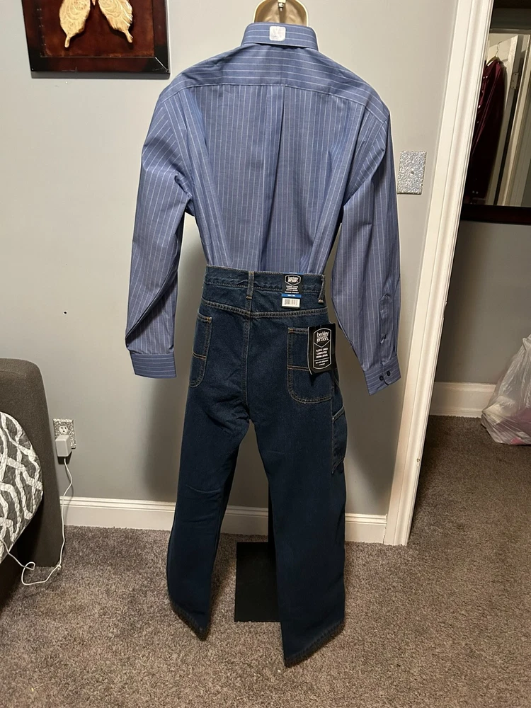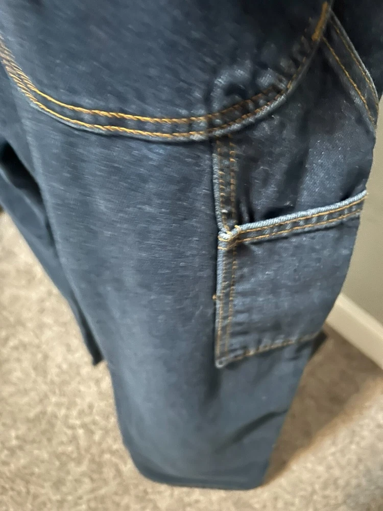 Elevate your style with these Berkley Jensen carpenter jeans. The dark denim and fleece lining make them perfect for winter, fall, and spring. The relaxed fit and high-rise waist provide comfort and style, while the 5-pocket design with slash pockets and cargo pockets offers ample storage space. The zip closure and cotton material make these jeans easy to care for and machine washable. The solid pattern and blue color add a touch of sophistication, and the carpenter jeans theme is perfect for any occasion. Order now to add these Berkley Jensen carpenter jeans to your wardrobe. CONDITION NEW WITH TAGS MEASUREMENTS WAIST 40 INCHES INSEAM 30 INCHES MATERIAL CONTENT 100% COTTON COLOR DARK DENIM