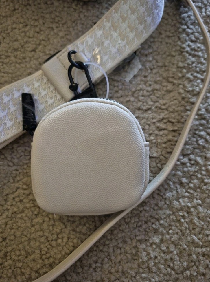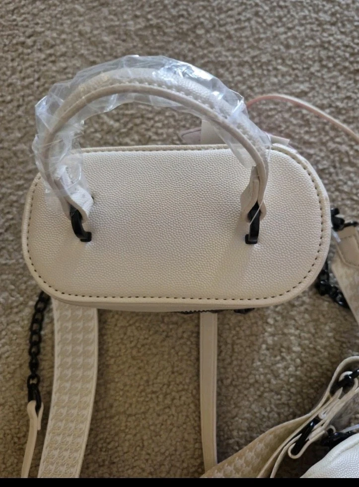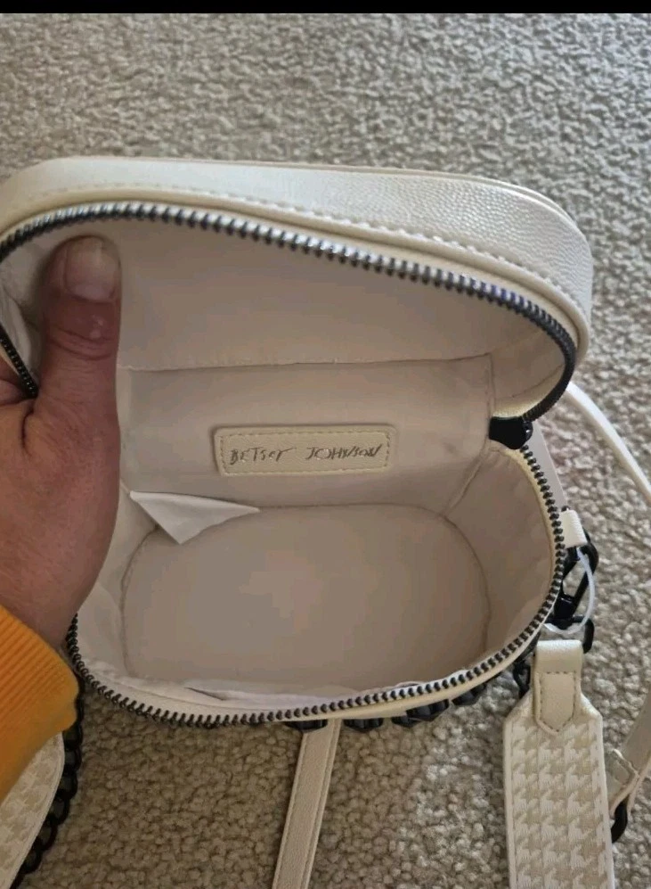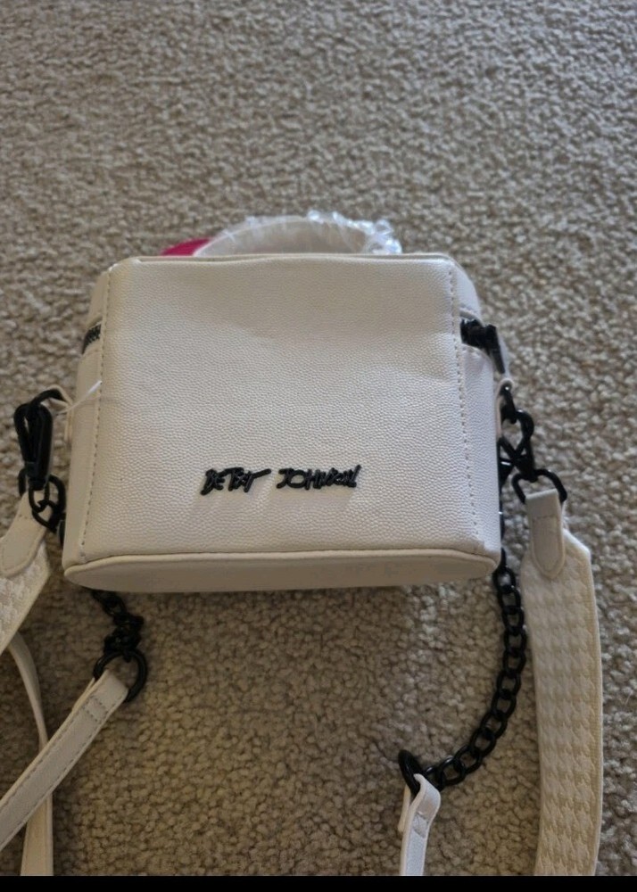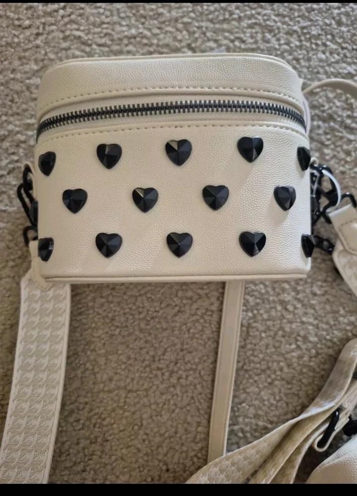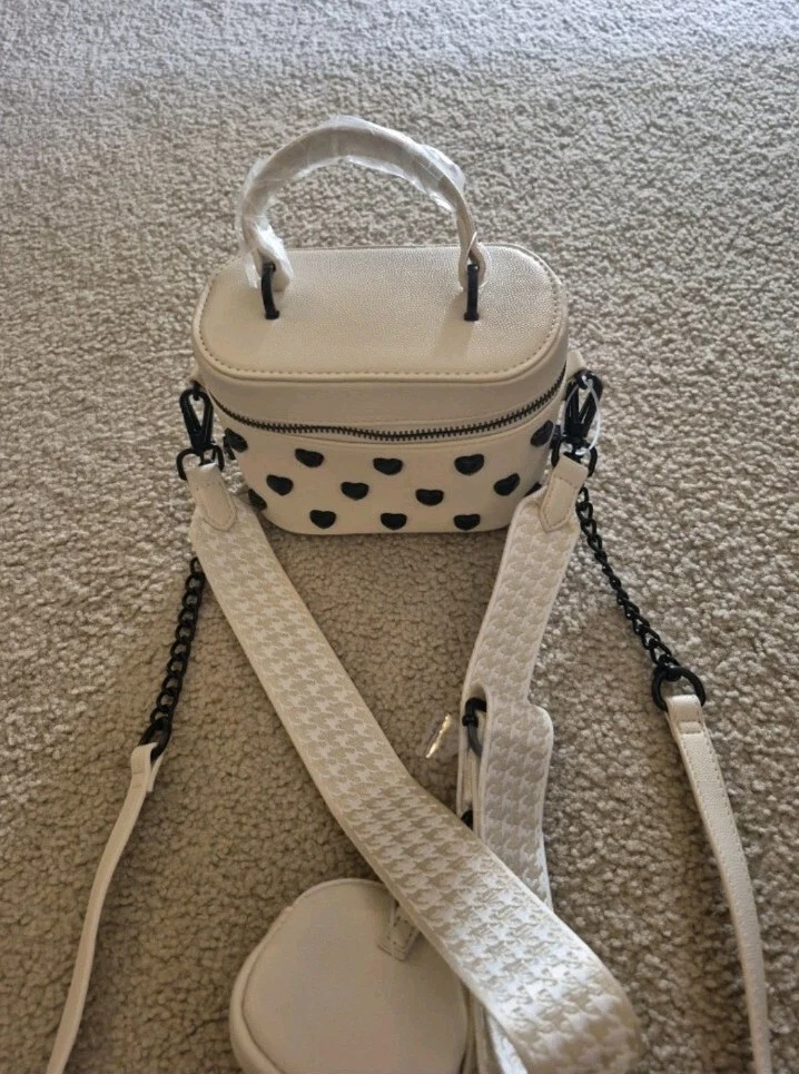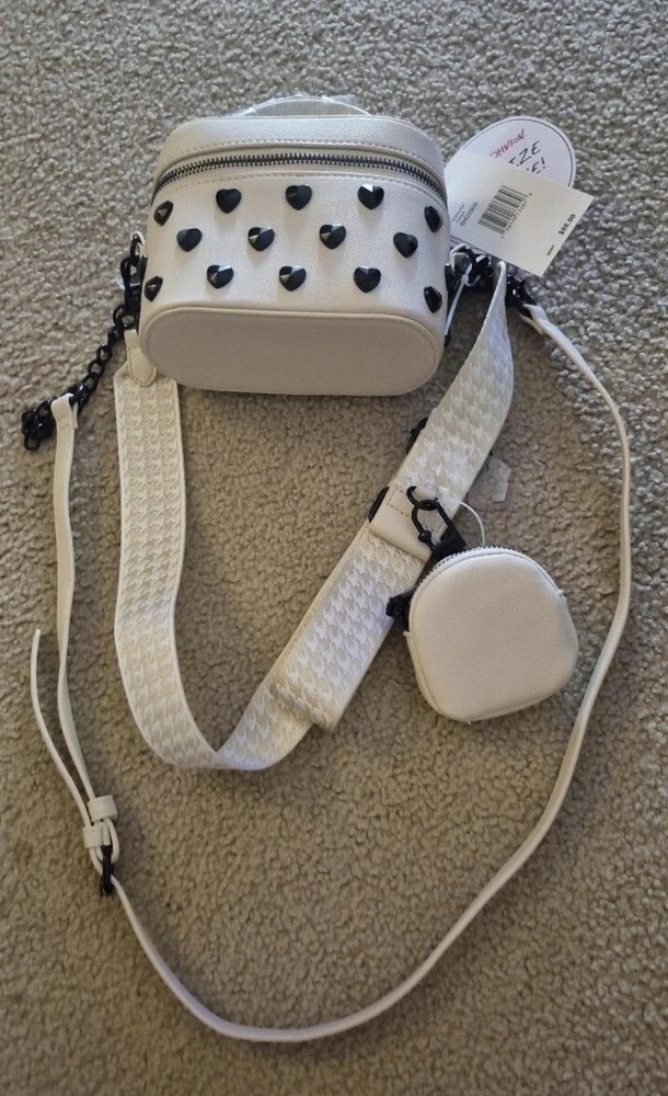 BRAND NEW WITH TAG BETSEY JOHNSON XO HALEN TOP HANDLE CROSSBODY BAG WITH STUDDED HEARTS. COLOR IS CHALK AN OFF WHITE HAS DETACHABLE STRAPS. ZIP AROUND STYLE. ONE STRAP IS TAN AND WHITE PATTERN OTHER STRAP IS FAUX LEATHER WITH WITH LINK CHAIN AT END OF IT. HAS LITTLE REMOVABLE POUCH. HAS BETSEY JOHNSON LOGO ON. ACK OF NAG LOGO ALSO ON ZIPPER MEASURES APPROXIMATELY 6.5" W + 5" L STRAP DROP IS APPROXIMATELY 23"L
