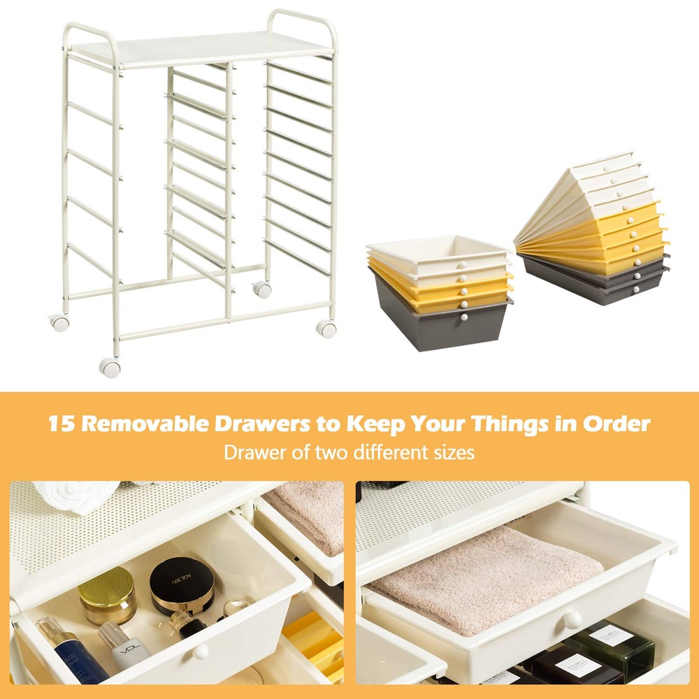 Description: This 15-drawer rolling storage cart features a vertical design that provides ample space for office supplies such as notepads, pens, staples and paper clips, while saving floor space. At the same time, each drawer is equipped with metal knobs for easy pulling. The cart is made of high-strength galvanized iron pipe, which is very durable for long-term use. There are 4 wheels underneath, which makes it easy for you to move it to any place. Better yet, there are multiple colors for you to choose, so you can put it in your office, home, garage or wherever you need to organize it according to your preference and the style of the room. Features: 15 removable drawers for classified storage Metal frame and plastic drawers, sturdy and durable 4 universal wheels (2 with lock) for easy movement and fixation Drawers slide through metal channels with no resistance Drawer with metal knob for easy closing and opening Easy to pull or push the cart with 2 handles on the top Spacious storage space on the top of the cart Ideal drawer storage cart for home, office, garage and school Drawers are easy to clean with a damp cloth Easy to assemble in short time according to instruction Specifications: Materials: Steel Frame, Plastic Drawers Overall Dimensions: 24.6” x 14.5” x 34.2” (L x W x H) Inner Size of Big Drawer: 13.5” x 9” x 4.5” (L x W x D) Inner Size of Small Drawer: 13.5” x 9” x 2” (L x W x D) Diameter of Wheel: 1.5” Package Includes: 1 X 15 Drawers Rolling Cart 1 X User’s Manual 【Large Storage Space w/ 2 Types of Drawers】15 removable drawers on metal rails provide you with a large space for keeping your home office supplies tidy and close. Offering sizes of drawers, this mobile organizer provides flexible storage solution to organize makeup and cosmetics, storing arts and crafts supplies, and arranging tools for use in the garage. It is easy to find something after you keep them in order. 【Stable Vertical Frame w/Chrome】The whole frame is made of chrome steel, which is very strong enough to support all the things you put inside. And the cart is not easily deformed or cracked, providing long time service. And 15 drawers are made of high-quality plastic. Even better, the vertical design also saves space greatly. 【Easy to Move w/Universal Wheel】360-degree rotating casters are able to change the direction of movement freely. In addition, if you want it to stay in a certain place, the lockable brake design ensures its stability. Plus, the casters will not scratch the ground when moving. 【Thoughtful Design w/ Handles & Mesh Top】This multipurpose storage cart is equipped with 2 top handles, which bring great convenience to moving the drawer cart. Meanwhile, the mesh top can be used as a perfect table top for storing or displaying anything you want. 【Eye-catching Drawers for Various Place】This 15-drawer Organizer with five different colors look attractive and eye-catching. The cart is perfectly to be placed in office, home, living room, entryway, bathroom, school, garage etc.