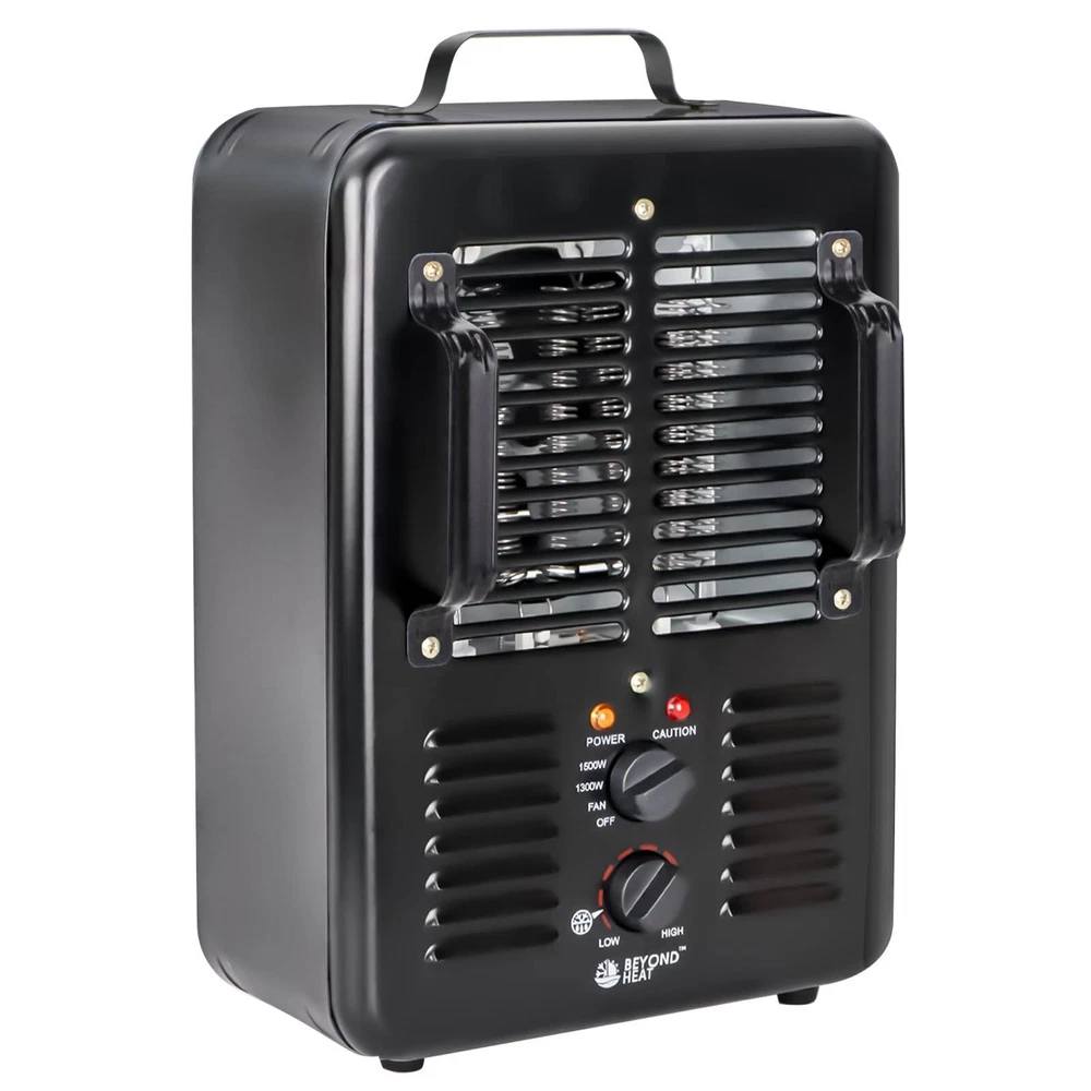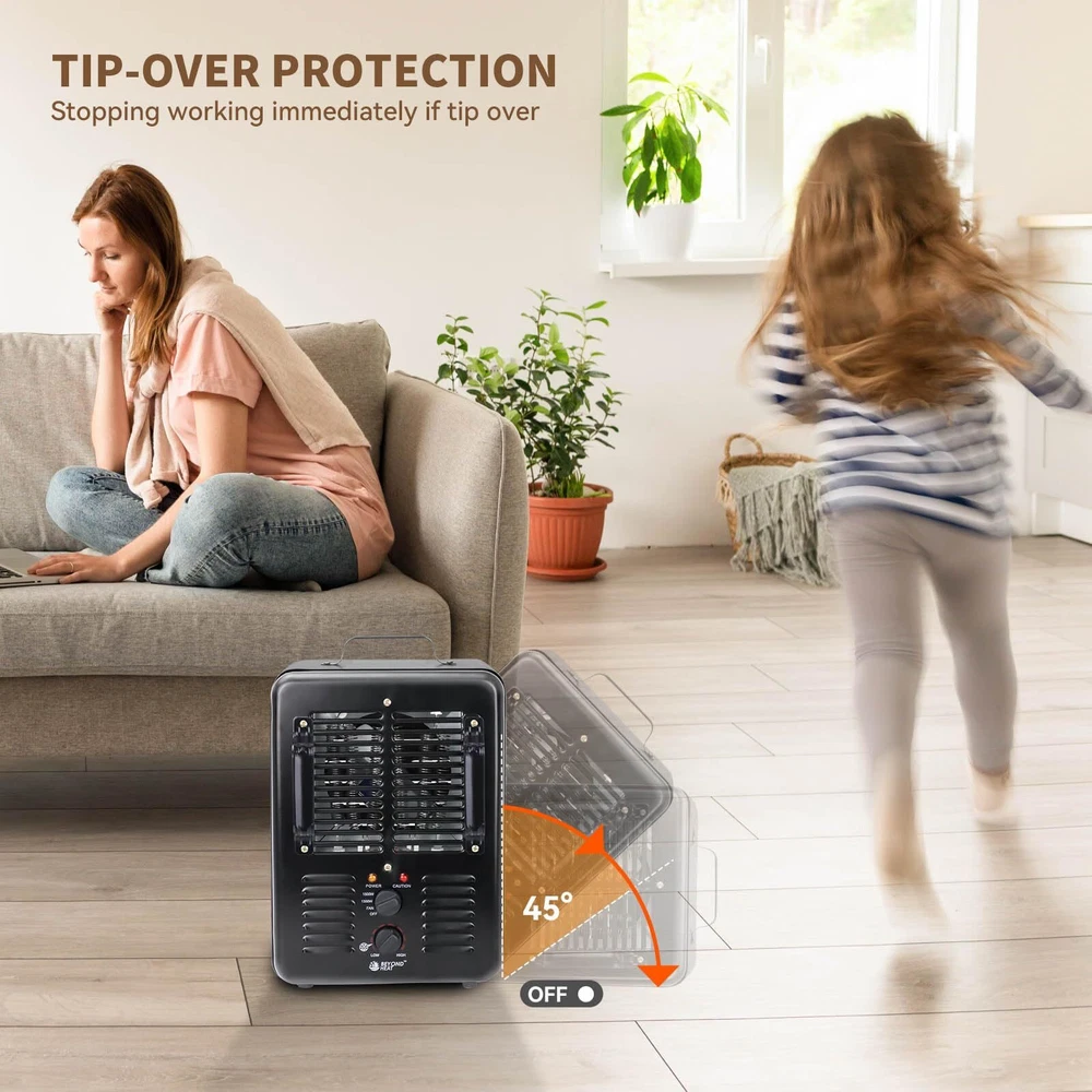VERSATILE HEAT SETTINGS: The small space heater for indoor use has 3 adjustable power levels fan-only, 1300W and 1500W, providing targeted heating to meet your different needs. When set to the anti-freeze setting, Milkhouse heater will turn on whenever the temperature drops below 40°F. PRIORITIZING SAFETY: Our small electric heater features a tip-over switch that automatically shuts off the heater if it accidentally falls or gets knocked over, preventing potential hazards. It also equipped with an automatic overheat protection device located inside the body of the heater. If milkhouse heater gets too hot for any reason, the automatic overheat protect device will turn the heater off. PREMIUM & DURABLE: milkhouse heaters electric with thermostat is made of heavy-duty material, which is very durable and strong, and has a long service life. In addition, electric heater has also passed ETL certification to ensure safety use. FAST HEATING: Our efficient space heater with premium heating elements and rated power up to 1500W, only takes several seconds to heat up warmth for relatively small spaces, offering a comfortable and consistent temperature. PORTABLE SPACE HEATER: milkhouse heater has a solid carry handle which is convenient to carry. It is small, exquisite and lightweight. You can put space heater in the bedroom, study room, bathroom, office whever you need heat. Reduce heating cost with safe space heater.