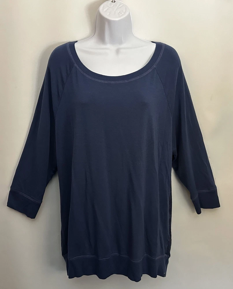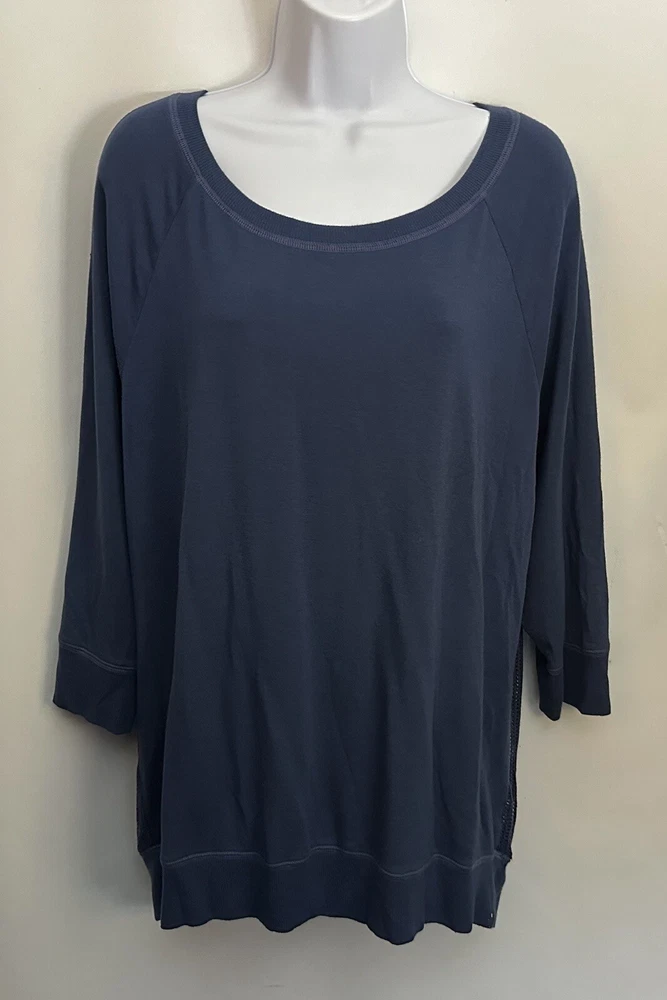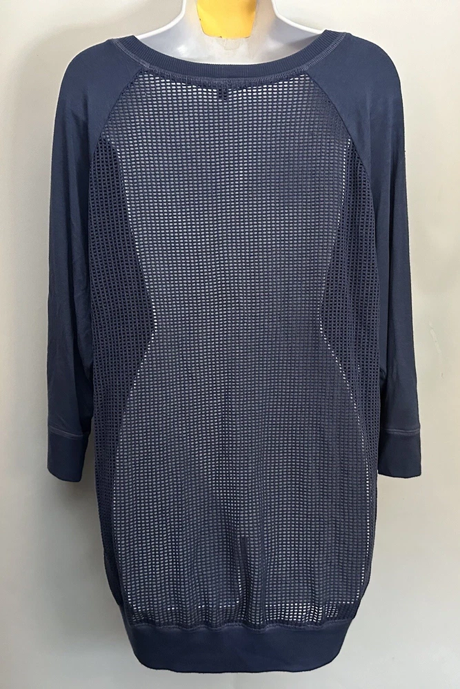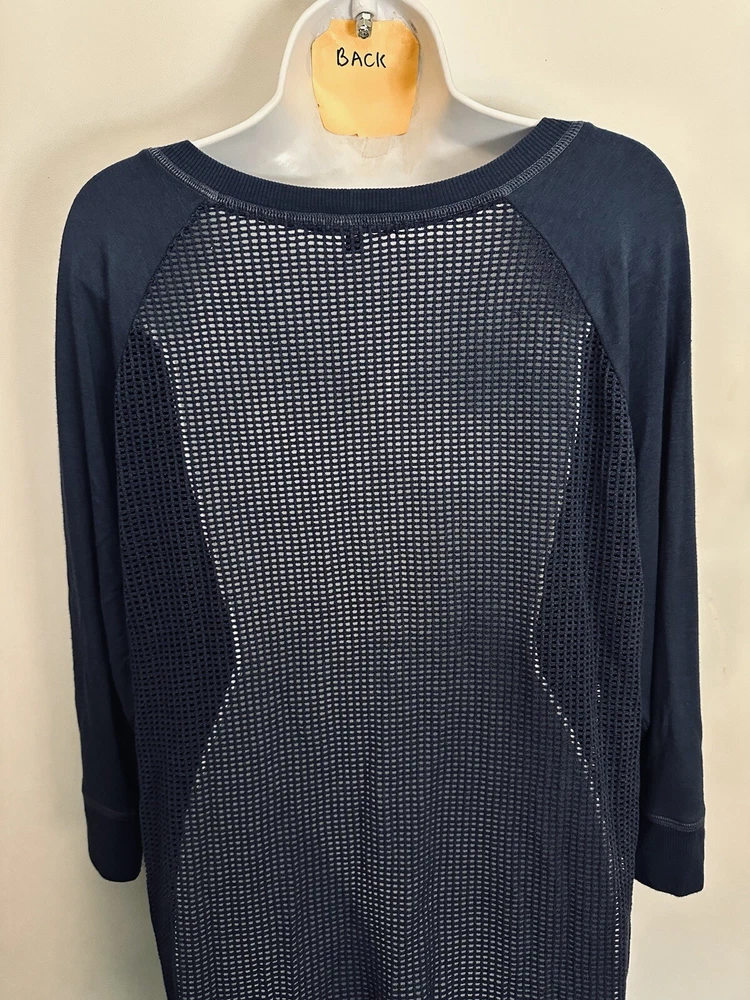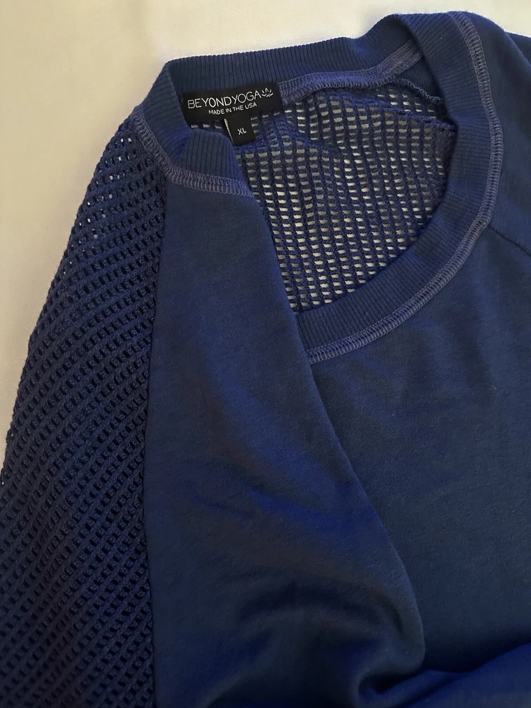 This Beyond Yoga sweater blouse, made in the USA is the perfect combination of comfort and style. The XL size pullover features a solid pattern in a blue color, with a round neckline and 3/4 sleeves. No fabric tag but this garment is made from a blend of polyester, spandex, and cotton, and the mesh fabric provides breathability in the back area. Ribbed details on hem, cuff and neckline. This Beyond Yoga sweater blouse is a must-have for any fitness enthusiast looking for a comfortable and stylish addition to their activewear collection. Measurements: Armpit to armpit: 22.5” Shoulder to hem: 27” FLAT FEE NEXT DAY SHIPPING WITHIN THE US