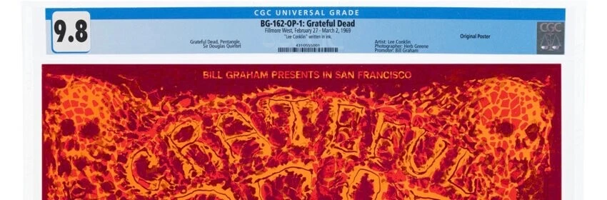 BG-162 Grateful Dead 1969 Fillmore West Concert Poster Signed by Lee Conklin, Graded 9.8. First-printing San Francisco concert poster for the Grateful Dead, Pentangle and the Sir Douglas Quintet playing at the Fillmore West on Thursday thru Sunday nights, February 27-March 2, 1969. Known as BG-162 in the Bill Graham numbered series, this poster was designed by Lee Conklin and signed by him in black at the bottom. It was then graded a red-hot 9.8 Near Mint/Mint by CGC (the Certified Guaranty Company). Dead fans can rejoice that several recordings from this weekend were used for Live/Dead , the band's first-of-many live albums, released by Warner Bros. in November. Those would include an epic 23-minute "Dark Star" from the opening night. Measures 14" x 21". From the David Swartz Concert Poster Collection. COA from Heritage Auctions. More Information: Also released on Live/Dead were "St. Stephen" from the opening night, and "Death Don't Have No Mercy," "Feedback" and "And We Bid You Goodnight" from the closing night. The poster's artwork features a dazzling combination of rust & orange colors, with the seven-member Dead's photo in the middle, taken once again by Herb Greene. Surrounding that are hidden images of faces, skulls and concert information that Bill Graham used to disdain being camouflaged like this. Pentangle was a traditional English folk quartet, touring behind its self-titled debut album on Reprise but who never broke through in the slightest. The Sir Douglas Quintet, on the other hand, led by Doug Sahm, were Bay-Area favorites by way of Austin, Texas. They racked up plenty of S.F. concert (and poster) appearances over the years. At this point Doug & Co. were enjoying the fruits of their semi-hit single "Mendocino" and album of the same name, the most successful in their career.