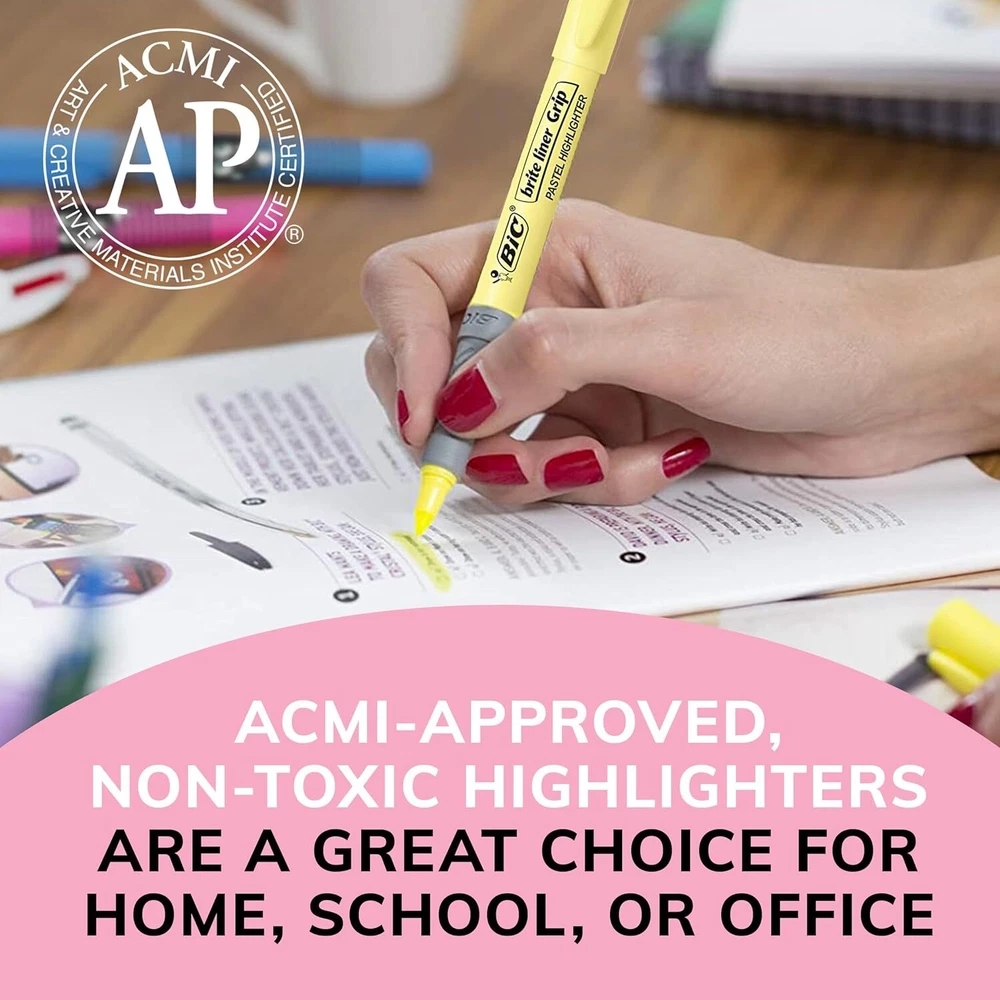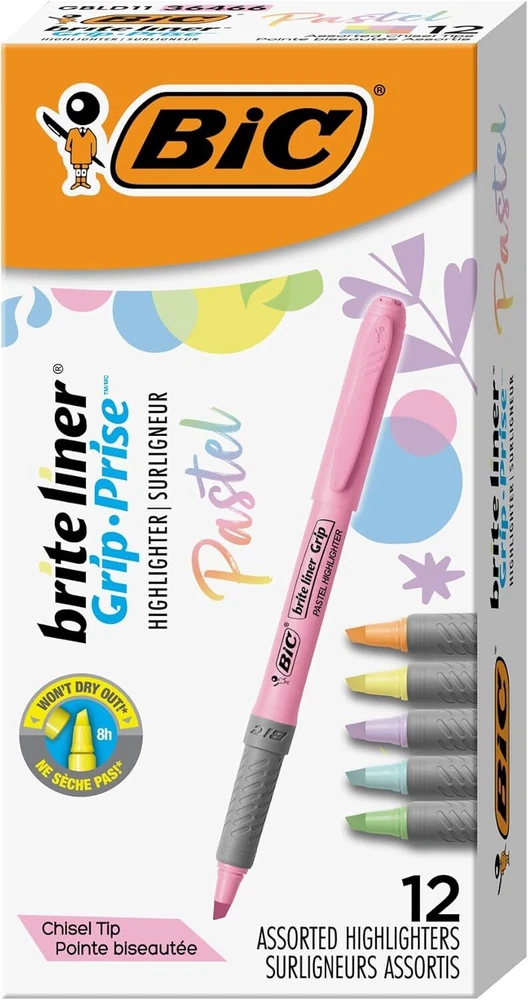BIC Brite Liner Grip Pastel Highlighter Set, 12-Count (Pack of 1), Product Details Manufacturer: BIC Brand: BIC Item Weight: 5 ounces Product Dimensions: 1.44 x 5.5 x 2.75 inches Item model number: GBLD11-AST Color: Pastel Material Type: Rubber Number of Items: 12 Size: 12-Count (Pack of 1) Point Type: Chisel Line Size: 1.6 millimeters Ink Color: Orange, Yellow, Green, Blue, Purple and Pink Manufacturer Part Number: GBLD11-AST Brand: BIC Ink Color: Orange, Yellow, Green, Blue, Purple and Pink Number of Items: 12 Point Type: Chisel Recommended Uses For Product: writing One 12-count pack of BIC Brite Liner Grip Pastel Highlighters Thin highlighters with a versatile chisel tip that creates both fine and broad lines Each highlighter pen can write for up to 8 hours without a cap on and not dry out Fits snugly in your hand with soft rubber grips for added comfort and control Pastel highlighters set featuring two markers in each of the following six trendy colors: Orange, Yellow, Green, Blue, Purple and Pink (colors per pack may vary) Perfect aesthetic school supplies for back to school! Colors May Vary Marker Point Size:1.6 mm Make organization fun and easy with the BIC Brite Liner Grip Pastel Highlighters Set. These thin highlighters have a versatile chisel tip that creates fine and broad lines. BIC’s highlighter markers feature translucent ink that emphasizes what’s important on the page without obscuring the text below. They’re ideal for use on textbooks, notebooks, documents and more. Each highlighters pen can write for up to eight hours without a cap and not dry out, so you can work with confidence. BIC Brite Liner Grip chisel-tip highlighters fit snugly in your hand and have a soft grip for added comfort and control. These trendy highlighters make great gifts for teens or creatives of all ages.Looking for cute highlighters for journals or stylish marker sets for adults? BIC Brite Liner Pastel Highlighters add a fun pop of color to your art, office or school supplies. Each highlighters pack contains 12 chisel tip markers, with two in each of the following six colors: Orange, Yellow, Green, Blue, Purple and Pink. BIC multicolor highlighters are non-toxic and ACMI-approved for a high-quality, safe product you can trust. Whether you’re emphasizing text, or just feel like getting creative, choose BIC Brite Liner Highlighters.
