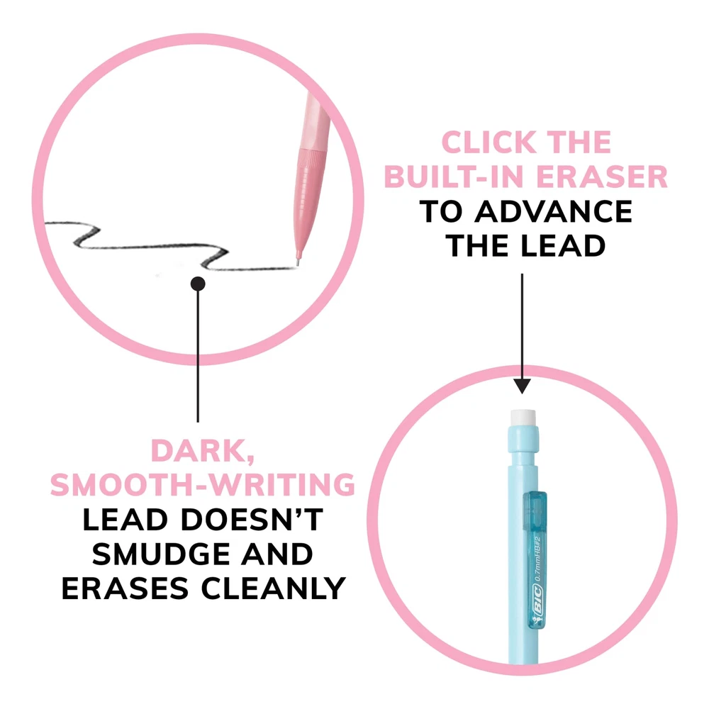 Enjoy smooth, dark writing with the durable BIC Xtra-Smooth Mechanical Pencil. With a fresh 0.7mm point only a click away, this #2 pencil is perfect for standardized tests and eliminates the need to sharpen constantly, so you're always ready to write, draw, sketch, or doodle. The smooth-writing lead does not smudge and erases cleanly, and each pencil comes with three #2 leads, offering performance and value. This pencil is the perfect addition for your school or office supplies! Smooth Dark Writing Convenient #2 lead pencil doesn't require sharpening and is always ready to write Smooth-writing lead does not smudge and erases cleanly for neater results The smart choice at test time - mechanical pencils are great for standardized tests Pastel colors provide a fun look. Refillable - designed to be used repeatedly, helping you avoid single-use disposables and potentially save money. Enjoy smooth, dark writing with the durable BIC Xtra-Smooth Mechanical Pencil. With a fresh 0.7mm point only a click away, this #2 pencil is perfect for standardized tests and eliminates the need to sharpen constantly, so you're always ready to write, draw, sketch, or doodle. The smooth-writing lead does not smudge and erases cleanly, and each pencil comes with three #2 leads, offering performance and value. This pencil is the perfect addition for your school or office supplies! Smooth Dark Writing Convenient #2 lead pencil doesn't require sharpening and is always ready to write Smooth-writing lead does not smudge and erases cleanly for neater results The smart choice at test time - mechanical pencils are great for standardized tests