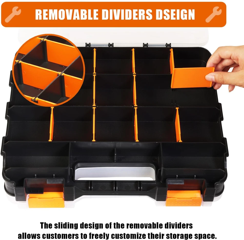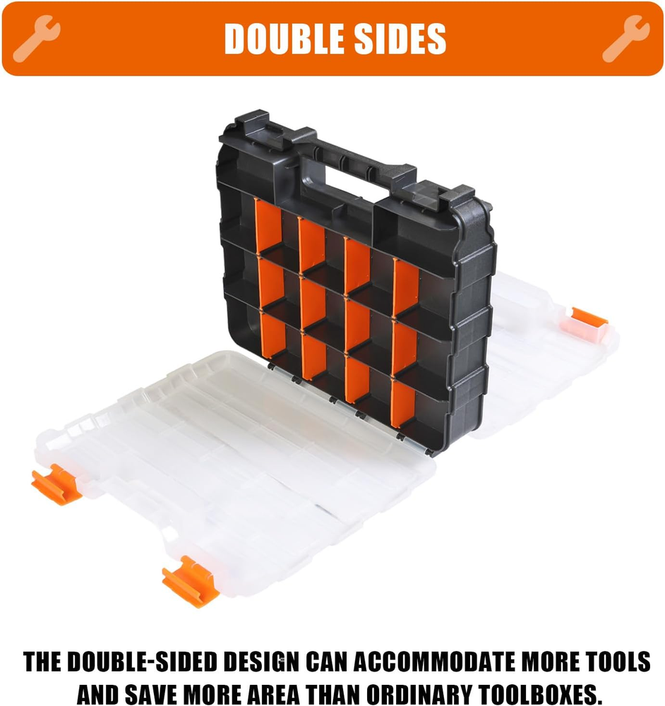 Store New Arrivals Add to Favorite View Feedback Contact BIG RED AG322R Torin Double Sided Tool and Hardware Storage Box: Portable Small Parts Organizer with Removable Plastic Dividers for Tools, Small Items and Jewelry, Black/Orange Description Item model number AG322R Style Small Parts Organizer Country of Origin China Usage Hardware Tools Batteries Required? No Number of Compartments 1 Brand BIG RED Material Plastic Maximum Weight Recommendation 13.22 Pounds Manufacturer Torin Item Package Quantity 1 Water Resistance Level Water Resistant Item Weight 2.32 pounds Finish Powder Coated Special Features Portable Part Number AG322R Mounting Type Tabletop Mount Color Multiple Shape Rectangular Included Components Plastic Tool box Product Dimensions 12.99"L x 11.02"W x 3.94"H Size 13" STURDY & DURABLE: Made of heavy-duty plastic material, this tool box has a double-sided design with 4 latches for good stability to keep items properly placed and unbreakable when dropped. REMOVABLE PARTITION DESIGN: 34-compartment double-sided organizer tool box with 30 removable dividers and 4 fixed dividers. The removable dividers are easy to slide on and off to customize the storage space you want. PORTABLE: This tool box organizer is very lightweight and it has a convenient carrying handle for easy PORTABILITY: It can be easily placed in the garage, closet, shed, car and other places, ideal for work and on the go. LARGE CAPACITY: This tool box organizer features double-sided design, ensuring ample storage space, suitable for storing various parts, keeping all your DIY accessories and tools convenient and tidy, measuring 11. 8" * 9. 8" * 2. 7". WIDE VERSATILITY: This tool box organizer is suitable for storing a variety of parts such as screws, nuts, bolts, fasteners, electrical connectors, beads, hair accessories, fishing gear and other items. This tool box organizer is made of heavy-duty plastic material,which has a double-sided design with 4 latches for good stability to keep items properly placed and unbreakable when dropped. 34-compartment double-sided organizer tool box with 30 removable dividers and 4 fixed dividers. The removable dividers are easy to slide on and off to customize the storage space you want. This tool box organizer is very lightweight and it has a convenient carrying handle for easy PORTABILITY: It can be easily placed in the garage, closet, shed, car and other places, ideal for work and on the go. This tool box organizer features double-sided design, ensuring ample storage space, suitable for storing various parts, keeping all your DIY accessories and tools convenient and tidy, measuring 11. 8" * 9. 8" * 2. 7". This tool box organizer is suitable for storing a variety of parts such as screws, nuts, bolts, fasteners, electrical connectors, beads, hair accessories, fishing gear and other items. If you meet any problems, please feel free to contact our customer service team and we will do our best to help you fix your issues. ABOUT US We offer the best prices around on high quality products. Our E-store includes media such as books, movies, music and games while offering electronics, toys, sporting apparel, clothing, tools, general home, garden items and more. SHIPPING We are always working hard to ensure your package arrives as soon as possible. Please understand that some factors like weather, high postal traffic, and the performance of shipping companies are outside of our control. We offer free shipping to the lower 48 states and ship within 2 business days of payment, usually sooner. We do not accept P.O. Boxes. Please provide a physical address. RETURNS We offer a 30-Day Return Policy on items which you are not completely satisfied with. You have the option for a full-refund or an exchange of the item. No returns are available on items shipped outside of the USA. PAYMENT We accept PayPal. CONTACT US This page content is yet to come Please ad us to your favorite seller and visit again later Thank You CUSTOMER SATISFACTION We try our very best to make sure every customer is completely satisfied. If there's a problem, message us! We're happy to help.