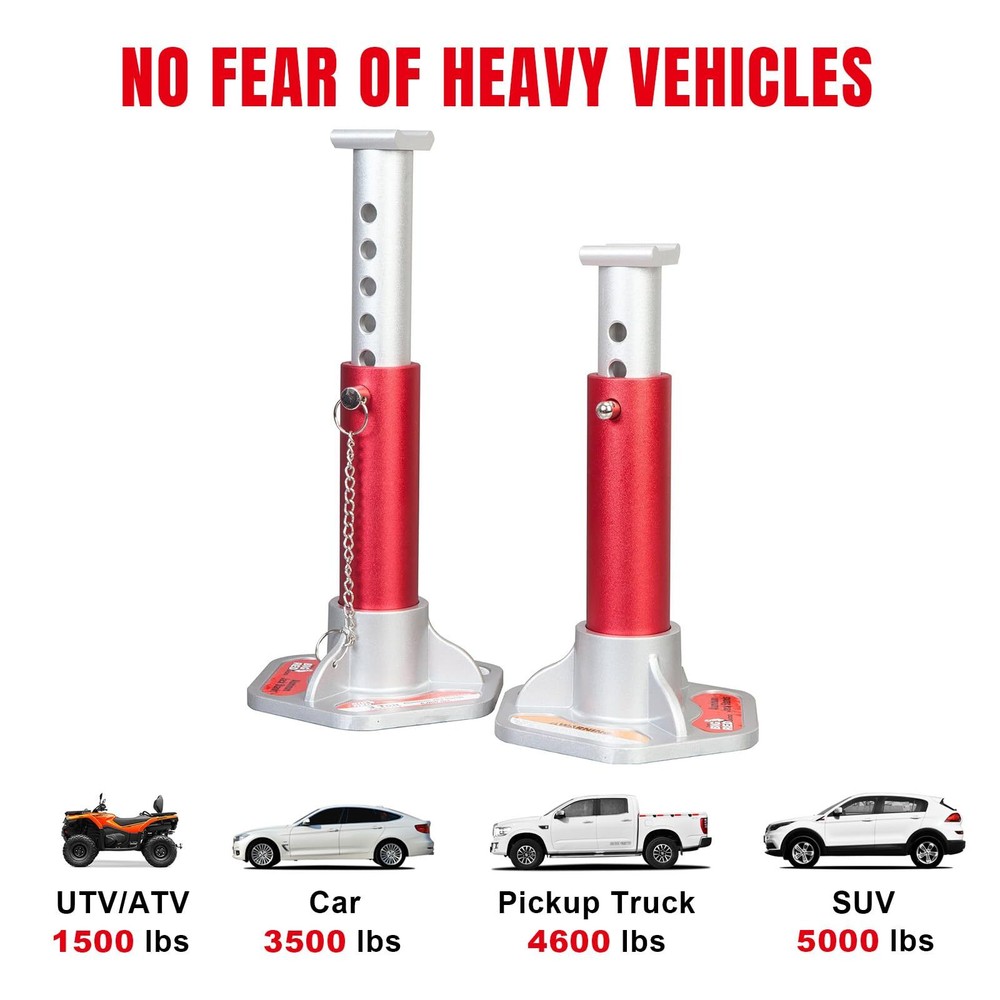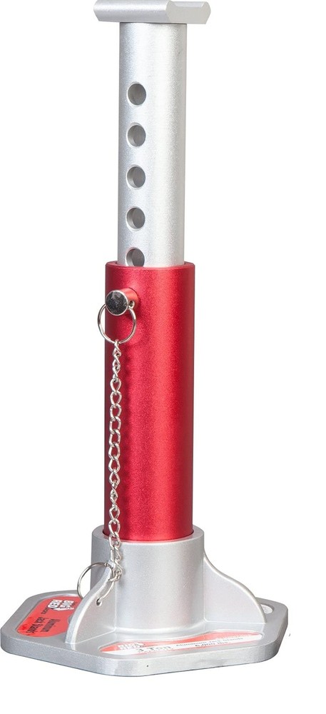 BIG RED T43004 Torin Aluminum Jack Stands with Locking Support Pins: 3 Ton (6,000 lb) Capacity, Red/Silver, 1 Pair Lightweight jack stands for supporting vehicles after lifting with a jack; Handles a wide range of vehicles including small cars (Suitable for most 3 Ton autos, not recommendable for big Pick-Up truck, Truck, too big off-road SUVs etc) Constructed of high-grade aluminum; Removable locking support pins provide added security and stability and is equipped with 6 locking positions Adjustable height ranges from 10-3/4" to 15-5/8" with a 3 ton (6,000 lb) load capacity; Saddle has a large surface area that provides better contact with the load being supported Wide foot base provides additional steadiness; Base is removable, allowing for compact storage when not in use Meets ASME safety standards and includes a limited 1-year manufacturer warranty Product Description The Torin BIG RED T43004 lightweight jack stands are a must have necessity in any garage. Ideal for supporting vehicles after lifting with a jack, handling a wide range of vehicles including small cars, jeeps, ATV's, UTV's, and more. These jack stands are constructed of high-grade aluminum and feature an adjustable height range from 10-3/4" to 15-5/8" with a 3 ton (6,000 lb) load capacity. Equipped with removable locking support pins which gives you security and stability and is equipped with 6 locking positions. The saddle has a large surface area that provides better contact with the load being supported. A wide foot base provides additional steadiness, which is also removable, allowing for compact storage when not in use. Meets ASME safety standards and includes a limited 1 year manufacturer warranty.