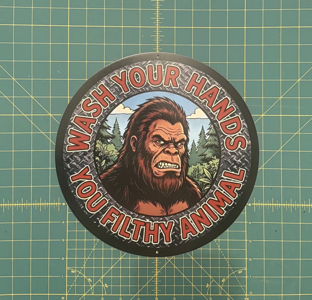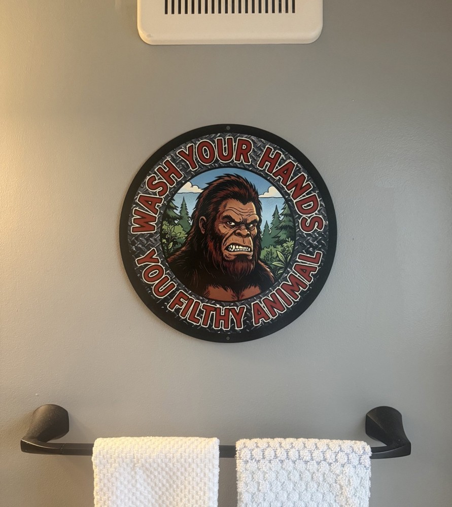 Funny Bigfoot sign, reads "Wash Your Hands You Filthy Animal." 11.5" round aluminum sign, great for bathroom, workshop, man cave, restroom, bar or tavern, garage. Great gift for the Cryptid enthusiast in your family! Brand new, with mounting holes centered at the top and bottom, lightweight and easy to mount. Ships with padding in a rigid cardboard box to make sure it arrives to your destination safely. Made in USA. Mounting hardware not included. Bigfoot sign, Bigfoot humor, Sasquatch sign, funny Bigfoot sign, funny bathroom sign, bar sign, garage sign, workshop sign, metal restroom sign, men's room sign, Sasquatch, Cryptid
