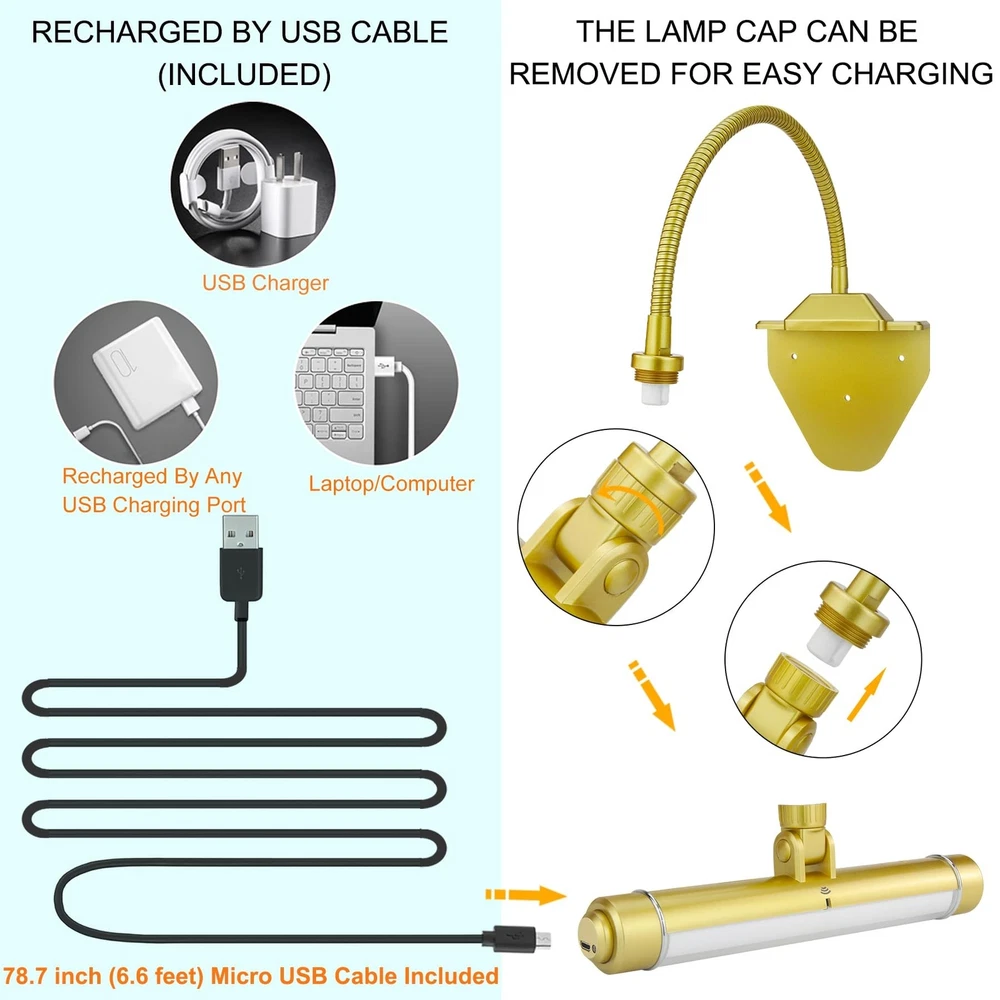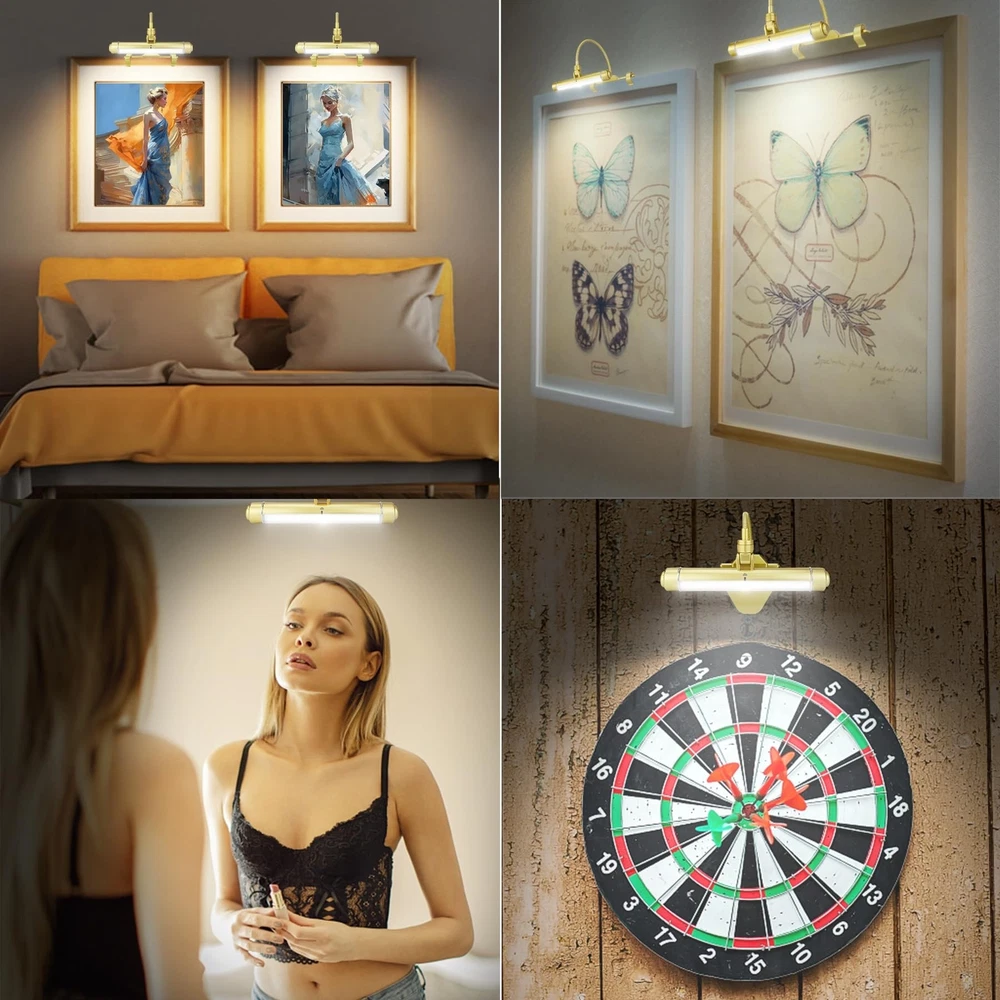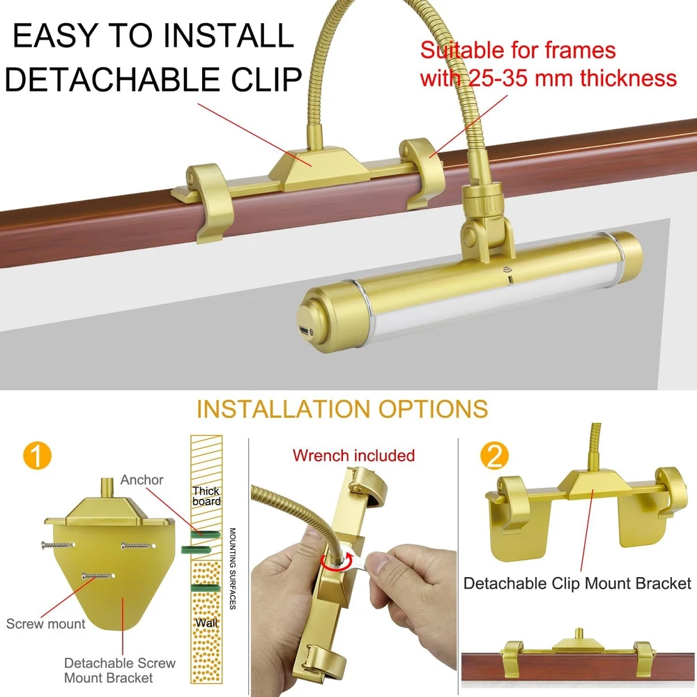 BIGMONAT Wireless Picture Light for Painting Rechargeable Battery Operated Artwork Light with Remote, Brightness Dimmable Clip on Display Lamp for Dart Board Art Gallery Photo Product Details Size: 8.4 inch Color: Gold Brand: BIGMONAT MPN: B600-Gold UPC: 769891772808 EAN: 0769891772808 Finish Type: Brushed Base Material: Plastic Product Dimensions: 14.5"D x 8.42"W x 1.2"H Item Weight: 1 Pounds Lamp Type: Picture Lights Finish Type: ‎Brushed Base Material: ‎Plastic Product Dimensions: ‎14.5"D x 8.42"W x 1.2"H Item Weight: ‎1 Pounds Lamp Type: ‎Picture Lights Shade Color: ‎White Shade Material: ‎Plastic Switch Type: ‎Remote Control and Push Button Style: ‎Modern Brand: ‎BIGMONAT Color: ‎Gold Special Feature: ‎Energy efficient , Dimmable, Timer Light Source Type: ‎LED Material: ‎Plastic Room Type: ‎picture light Recommended Uses For Product: ‎dartboard light/picture light Power Source: ‎Rechargeable Controller Type: ‎Remote Control Number of Light Sources: ‎28 Connectivity Technology: ‎USB Included Components: ‎picture light+USB cable+remote control Is Waterproof: ‎False Mounting Type: ‎Hanging Wattage: ‎1.5 watts Number of Items: ‎1 Lighting Method: ‎Downlight Control Method: ‎Remote Indoor/Outdoor Usage: ‎Indoor Specific Uses For Product: ‎Picture light/wall light/display light/dartboard light/indoor lighting Water Resistance Level: ‎Not Water Resistant Installation Type: ‎Hanging Number of Pieces: ‎1 Efficiency: ‎Energy efficient Voltage: ‎4.2 Volts Base Diameter: ‎7.1 Inches Brightness: ‎200 Lumen Is Cordless?: ‎Yes UPC: ‎769891772808 Size: ‎8.4 inch Manufacturer: ‎BIGMONAT Part Number: ‎B600-Gold Item Weight: ‎1 pounds Country of Origin: ‎China Item model number: ‎B600-Gold Batteries: ‎2 Lithium Ion batteries required. (included) Finish: ‎Brushed Pattern: ‎8.4In Gold Item Package Quantity: ‎1 Special Features: ‎Energy efficient , Dimmable, Timer Batteries Included?: ‎Yes Batteries Required?: ‎No Battery Cell Type: ‎Lithium Ion Warranty Description: ‎1 year. Date First Available: June 8, 2020 Wireless Rechargeable Painting Lights Recharged with USB cable (included) . Just unscrew down the light head to recharge and keep the base stay on paintings or pictures. The USB cable length is 6.6 feet(78.7inch). Built in 4400MAh big lithium battery ,1 time 4 hours fully charge can last 24 hours. 3 Lighting Modes and Brightness Dimmable Dartboard Light There are 3 lighting color temperature of the art light to choose from ,they are warm white 3000k,nature white 4300k and cool white 8000k. All modes brightness can be adjusted from soft to high and high to soft by remote control keys (50%,100%,+ brightness ,-brightness) or press the button on the side of light directly. Ultra Bright &Timer Auto Shut OFF LED Accent Spot Light Built-in 28 upgraded led beads to get up 200lumens lighting,longer using life time,more energy saving. There are timer function on the remote, you can preset timer to auto shut off in 15,30,45 or 60 minutes before leaving to save the battery. Adjustable Direction Lighting Head & 2 Installation Ways Clip on Dart board Light The LED light can be rotated 360of the neck and 180of the head.Can swing back and forth ,left to right. Almost meet all direction you need. There two bases in the package for your different mounting. One for screw(included) and the other for clip on.The wrench comes with the package for you to change the base easily. 1 More Details ☼200 Lumens,28 super bright SMD LEDs, 1.5W, 30,000 hours lifespan. ☼3 lighting modes: 3000K warm white light, 4300K natural white light and 8000K cool white light. ☼Brightness dimmable, the brightness can be adjusted by the remote control,from 1% to 100% and 100% to 1% recycle.Or press the button on the side of light tube and hold for seconds to change the brightness. ☼Material:Plastic shell +Metal goose neck. ☼The picture light is powered by 4400mAh high capacity Lithium battery built-in, 4hours fully charging with USB Wire(included)to last for 24 hour bright. The led indicator will auto off once the batteries are fully charged. ☼The remote control will operate lights within 20 feet.Up to 10 lights can be controlled by one remote control. 2 Installation ways: Detachable Clip Mount Bracket (included) 1. Attach detachable clip Mount Bracket to light by turning the clip bracket clockwise until it is tight.Tighten by wrench(included) 2. Open clips, to attach detachable clip mount bracket to picture or frame. For thickness between 1" to 1.4" (25mm~35mm) 3. Adjust neck and tilt head to desired position. Detachable Screw Mount Bracket (included) 1. Remove Detachable Clip Mount Bracket from flexible neck by rotating the Clip Mount Bracket counter- clockwise until loose.(Wrench included) 2. Place screw end of flexible neck into screw mount bracket. 3. Place screw mount bracket over top of the frame with the screw holes facing the back of frame. 4.Drill a pilot hole for each screw.Insert up to three screws (included) through the holes in the screw mount bracket to secure properly. 5. Adjust neck and tilt head to desired position. Do NOT put screws through picture. Check to make sure the screw mount is secure. Packing List - 1 x Picture Light - 1 x Remote Control ( included CR2025 button cell battery