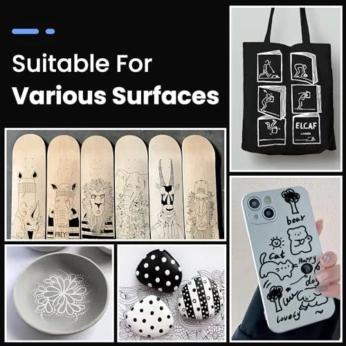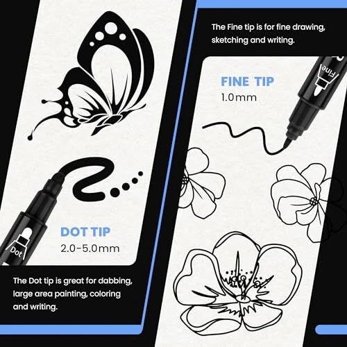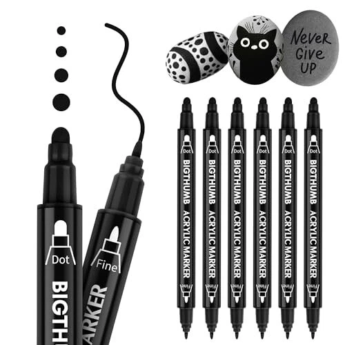 Permanent Markers Black Set: BIGTHUMB black markers are made with the highest-quality non-toxic, acid-free, no odor, no-leakage water-based acrylic ink that is waterproof, quick dry, long-lasting, and smooth ink flow. Each fat permanent marker conforms to ASTM d-4236 and EN-71 safety standards. The 6 Count Permanent Black Markers feature a Dual NIB design ( Extra-fine and Dot ). Different tips switching can be completed by changing the pen holding direction. The black marker tip is not only durable but also allows the marker paint pen to produce smooth and even ink, hardly skipping or breaking lines The black marker with a dual tip ensures extensive coverage, making these black markers ideal for scale projects and intricate designs. The high-quality black poster marker features a pump-action design for easy ink control, perfect for artists and crafters who demand excellence Multi-Surface Compatibility: These permanent poster markers are versatile enough to be used on a variety of surfaces, ideal for posters, signs, canvas, wood, paper, rock, and various surfaces. These black poster markers bring your artistic vision to life. The durable and reliable performance ensures that your creations maintain their brilliance over time The dual tip permanent marker black set is perfect for artists, art students, kids, teens, and adults to use on DIY designs, arts, and crafts, and painting projects. These black paint markers Great presents for Christmas, Birthday, Mother's Day, Easter Day, Valentine's Day, Halloween, Thanksgiving Day, Party, New Year, or a special holiday gift