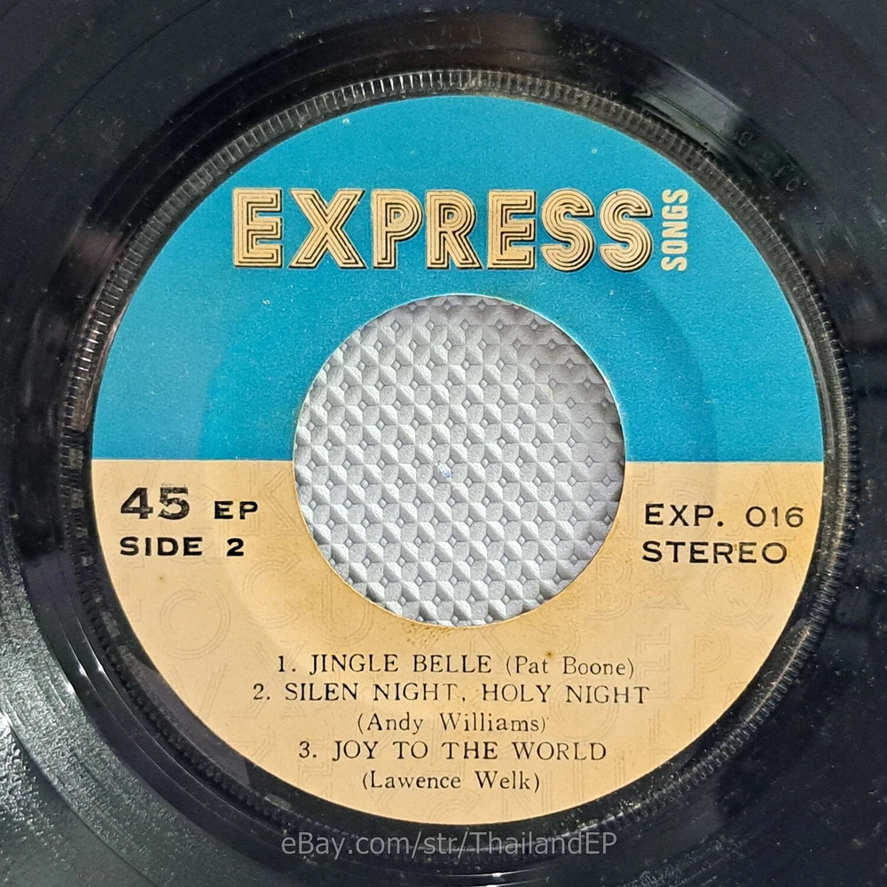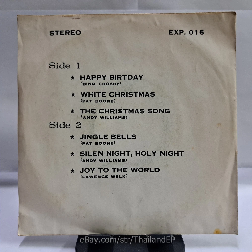 Welcome to The World of ""Thailand Vinyl Records"".Very rare and beutiful picture of cover. Check everyday . This item is for a true 7" single collector. It was printed and sold locally as limited EP back in the early 70's. Only few copies were spread outside Thailand. Most professional record collectors know that it is scarce nowadays and is absolutely a collector's item. If you know a UK magazine called RECORD COLLECTOR then you must have read many articles mentioning THAILAND EP and this is it !!! Here is your chance to own one-of-a-kind piece of Asian's 7" single history. Description Records !!! DETAIL SONG and ARTIST !!! Side A: A1 = Bing Crosby - Happy Birtday / A2 = Pat Boone - White Christmas Side B: B1 = Pat Boone - Jingle Bells / B2 = Andy Williams - Silen Night, Holy Night Label&Catalogue number : : EXP016 Country of release : THAILAND Condition (Sleeve/Disc) : VG+ / VG++ and pls see picture too. Shipping I am seller in Thailand not USA.So I can not ship 4$ as policy pls understand this real rate from oversea . Price for shipping(Airmail )&Packaging to worldwide only US 14.99 USD .Except Asia and JAPAN only 14.99 USD. You can save cost for combine shipping only 3 USD$ per each. 2xEP=17.99 USD$ , 3xEP=20.99 USD$ . My package very safety by big cardboard don't worry about your's EP/PS/LP. Time delivered 21-45 days . ***All item : have tracking system no need add money*** **For normal shipping (Airmail).Time delivery to ITALY maybe use 1-2 Months, France use 1-2 Months.But Don't worry item will arrived to you sure!!.For fastest and High value you can use Express Mail Service cost for1 EP =39 USD.EP will arrived to you within 5-7 Days. ***All shipment have fully tracking system *** Payment PAYMENT : I accept the follow payment by eBay managed , . My ID eBay provide by eBay .Account will be provide at the end auction.Charges to be covered by winner. If you have question pls email to me anytime i can answer immediatly. I have many EP,PS 7" Thailand Pls Click => View seller's other items Check my feedback , I care and honest all customer.I welcome 0 feedback but contact me first if you will bidding. Good Luck !!!! and Enjoy . 45 RPM / EP/ LP Grading Scale: Mint /NM/ Excellent(VG++) /VG+/ VG /G+ /Good(G) / Fair / Poor / Bad (According Record Collector Magazine (UK)) LOT153-10EXP016