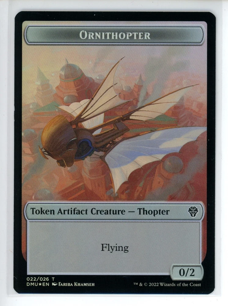 Finish: Foil Card Name: Bird (002) // Ornithopter Double-sided Token Set: Dominaria United Character: Bird Game: Magic: The Gathering Set Code: DMU Manufacturer: Wizards of the Coast Card Condition Types: Type 1 - Pack to Sleeve Card Number: 2//22 Rarity: Token Language: English