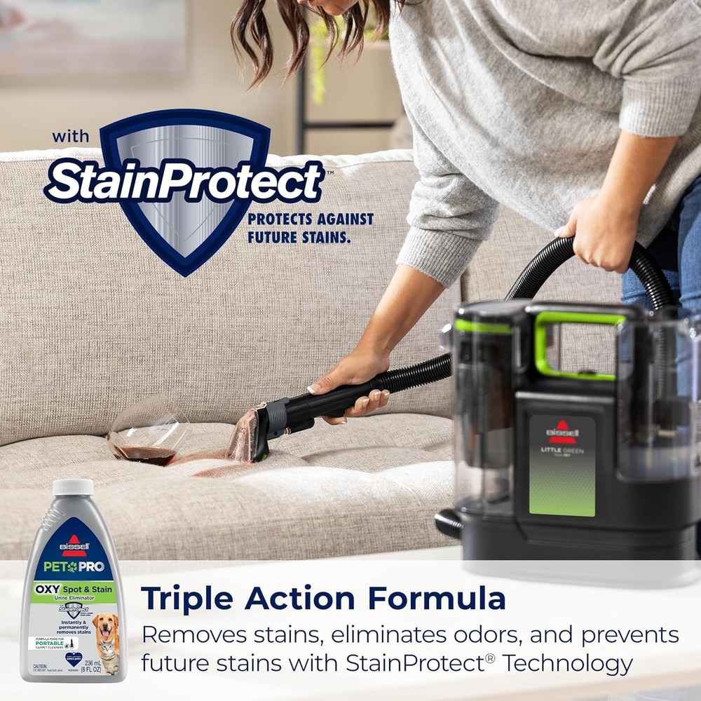 WE SHIP FROM US → US, SO YOU WILL NOT PAY ANY IMPORT FEES. THE DE MINIMIS LAW DOES NOT AFFECT YOUR ORDER. EVERY PURCHASE SAVES PETS. BISSELL proudly supports BISSELL Pet Foundation and its mission to help save homeless pets. SUPERIOR SUCTION. 30% more powerful than the competitive portable deep cleaner.* INSTANT & PERMANENT PET STAIN REMOVAL. Use with Triple Action PET PRO OXY Spot & Stain formula with Urine Eliminator and StainProtect Technology to protect against future stains. SELF-CLEANING TOUGH STAIN TOOL. Rinse out left-behind residue, dirt and debris with a one-touch hose and tool cleanout. EASY TO USE. Longer hose and cord let you easily clean hard-to-reach messes, and the two tank technology simplifies filling and emptying while keeping clean and dirty water separate. SPRAY, SCRUB, AND SUCTION. TRIPLE ACTION cleaning removes tough set-in pet messes like muddy paw prints, embedded dirt, bio messes, and more. IN THE BOX: Self-cleaning Tough Stain Tool, Specialized Pet Hair Removal Tool, 8 oz. trial size BISSELL PET PRO OXY Spot & Stain with Urine Eliminator and StainProtect Technology.