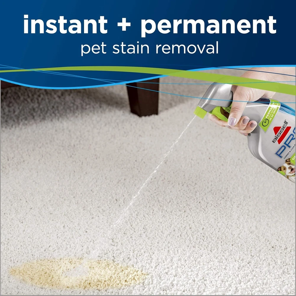 Every BISSELL purchase helps save pets. BISSELL proudly supports BISSELL Pet Foundation and its mission to help save homeless pets. Permanent stain removal in 30 seconds Instantly and permanently removes tough stains like tracked-in dirt, grass, mud, blood, pet stains and more Eliminates tough pet odors and discourages pets from resoiling Safe for kids and pets when used as directed Oxy stain destroyer formula starts working on contact to mobilize, lift, and penetrate the stain at the source to remove stains in 30 seconds Please note: one sprayer is included with two-packs. Please keep your sprayer and reuse it for the second bottle (simply remove the sprayer from the first bottle and apply to the second). We do this with the intention to maintain the ability to supply our valued customers during seasons of high demand while helping reduce the use of plastic by reusing those sprayers. Thank you for your support; stay happy and healthy