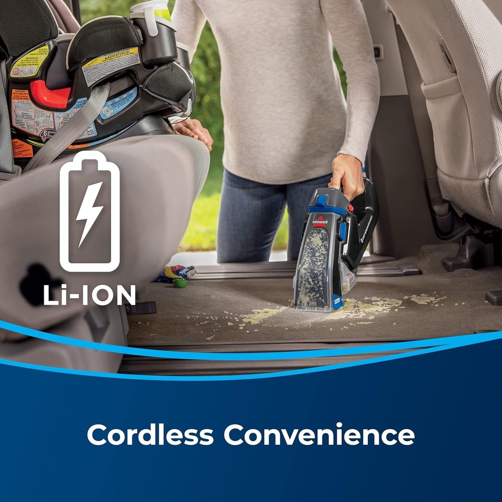 About this item EVERY PURCHASE SAVES PETS. BISSELL proudly supports BISSELL Pet Foundation and its mission to help save homeless pets. QUICK AND EASY CLEANING. Great for tackling everyday messes like tracked in dirt, liquid spills and pet stains. CORDLESS CONVENIENCE. Grab-and-go 7.2 V lithium-ion chargeable battery so it's ready to clean wherever, whenever. LIGHTWEIGHT DESIGN. This 3.3 lb machine makes cleaning even hard-to-reach areas easy. READY-TO-USE. No water required and formula stores right in the machine, so it's ready to clean when needed. FORMULA & BRUSH INCLUDED. Your purchase includes two trial-sized bottles of PET PRO OXY Spot & Stain and a removable scrub brush.