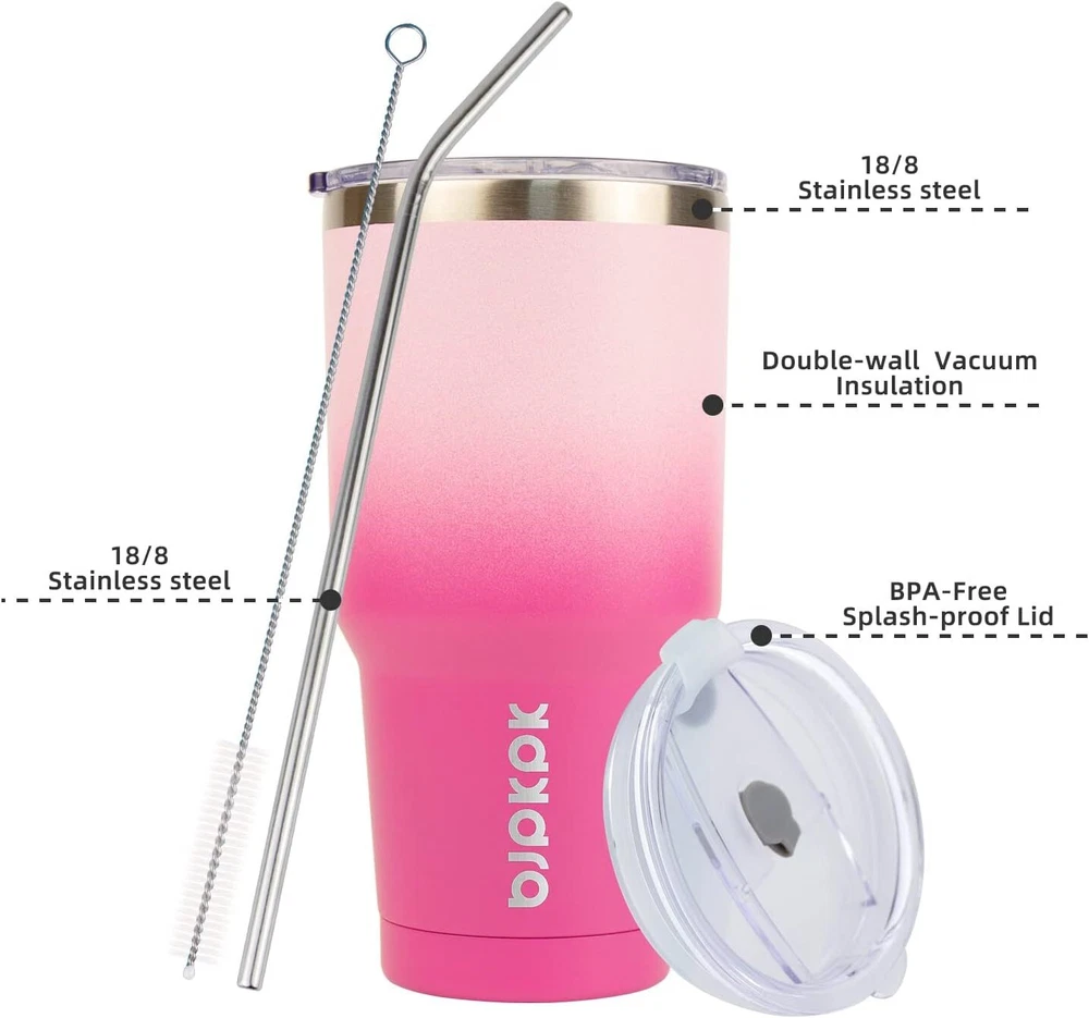 BJPKPK 30 oz Tumbler With Lid And Straw Travel 30oz, A-Cherry Blossom-30oz Product Details Brand: BJPKPK Color: A-Cherry Blossom-30oz Special Feature: Leak Proof, Non-Slip, Break Resistant, Scratch Resistant Style: Modern Theme: Beach Recommended Uses For Product: Travel, Home Included Components: Lid, Brush, Straw Specific Uses For Product: Cold Drinks, Hot Drinks Shape: Round Pattern: Solid Product Care Instructions: Hand Wash Only Age Range (Description): Adult Material Feature: Insulated Reusability: Reusable Unit Count: 1.0 Count Product Dimensions: 3.9"W x 7.9"H Material Type Free: BPA Free Number of Items: 1 Manufacturer: BJPKPK Size: 30oz Item Weight: 14.1 ounces Department: Unisex-Adult Country of Origin: China Item model number: Tum0805 MaterialCapacity: Stainless Steel30 Fluid Ounces OccasionItem Weight: Mother's Day, Christmas, Father's Day, Halloween, ThanksgivingMother's Day, Christmas, Father's Day, Halloween, ThanksgivingMother's Day, Christmas, Father's Day, Halloween, Thanksgiving See more 0.88 Pounds Made of 18/8 food grade stainless steel, BJPJPK insulated tumblers adopt double walled vacuum insulation that can keep your beverage hot or cold for hours, no need to put ice cubes in your mug anymore, no more worrying about the drink sweat and make rings on your table The insulated tumbler cup come with 2 BPA free lids, the sip design lid allow you to sip, drink or gulp, choose your own way for drinking, the other leak proof lid with simple push-on operation fully avoid splash or spill This insulated coffee mug has a narrow bottom design which make it fits most cup holder in car, the special design makes the vacuum tumbler perfectly fits all the people, men can hold its upper part and women with small size hand can hold the bottom part With 30 oz capacity, the jug is enough for both daily use or travelling, fits car cup holders, designed with non-sweat design, the outer layer is coated with powder which can keep your tumbler dry and neat when holding, take the travel tumbler together when you go outdoor activities is a nice choice BJPJPK provide various colors and styles tumblers for customers, just choose the one you like best, these tumblers are also wonderful gifts options for friends or family, Package include: 1 x 30 oz water tumbler, 2 x lids, 1 x straw, 1 x straw brush BJPKPK 30oz Insulated Tumbler with Lids and Straw, Stainless Steel Travel Coffee Tumbler,Powder Coated Travel Mug-Cherry Blossom