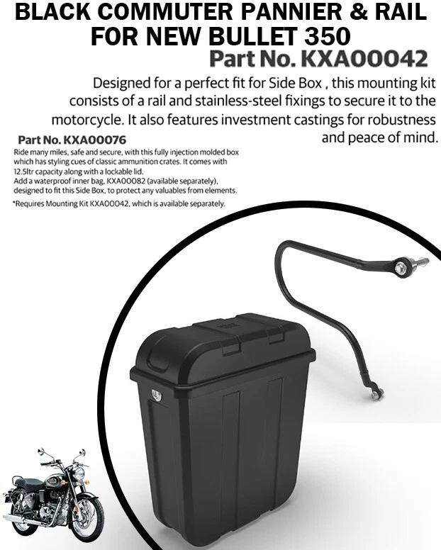 "BLACK COMMUTER PANNIER & RAIL" FIT FOR ROYAL ENFIELD NEW BULLET 350 - Express Shipping. COMMUTER PANNIER:- Seamless integration- engineered to fit prefectly and easily to your Royal Enfield Rigorous testing - tested on real road conditions for quality and durability COMMUTER PANNIER RAIL:- Designed for a perfect fit for the Black Commuter Pannier, this mounting kit consists of a rail and fixings to secure it to the motorcycle. It also features investment castings for robustness and peace of mind Product Info: Product Type : BLACK COMMUTER PANNIER & RAIL Fit To Make : NEW BULLET 350 Color : Black Placement on Vehicle : Rear Manufacture Part Number : KXA00042, KXA00076 Return Policy : Return will be Accepted Only Manufacturing Defect we will not accept return Encase of Fitment issue Shipments We do ship the items worldwide and it will take 7-8 days to reach final destination. If the item do not arrived and destination within this period so please contact us. We are not liable to pay any import duty or taxes, if the same charged by the customer?s country. If custom required in Buyer Country Buyer will be responsible to pay that Custom fee to clear the parcel, If buyer Denied refund will not be initiated in that case NOTE- Please make sure to provide your full address with your CORRECT contact phone number or mobile number to avoid Shipment delay due to insufficient address. Even Few shipment companies doesn't accept the PO Box address. So please try to give your complete address with Telephone number. Payments We accepted the payment through PayPal because it's easy way to online transaction. Feedback Leaving Negative or Neutral Feedback is not an easy solution of a problem,so please contact us if you have any questions or any complaints before leaving a Feedback, will assure you give a 100% solution. Your feedback is important for us to grow our business on eBay,so please do leave positive feedback. Our Guarantee & Timeline for Returns If you are not completely satisfied with your purchase, simply exchange it or return it to us for a refund within 7 days of the date of delivery. THANK YOU!!!