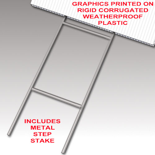 PRODUCT DESCRIPTION: Tampa Printing uses heavy duty premium 4mm thick (industry standard) indoor / outdoor corrugated coroplast plastic material for our yard signs. All yard signs are printed using heavy duty vinyl with the industry best latex ink technology, are UV and water resistant, and withstand hot and cold conditions. All yard signs include a metal step stake for easy installation in grass or soil. All yard sign dimensions are 24 inches wide by 18 inches tall. PRODUCT USES: Our yard signs are perfect for business or personal use. Place these signs where they can be clearly read for passersby. At traffic intersections, events, yard sales, new business locations or election campaign events. PRODUCTION QUANTITIES AND DISCOUNTS: This listing is offered as a single or double sided item. If you require a larger quantity and/or size, message us for a quote. PRODUCTION/SHIPPING: Our yard sign production is REALLY FAST! Once your order is purchased, we produce and ship within one to two business days! Our normal business hours are Mon-Fri, 9am-6pm EST, excluding holidays.