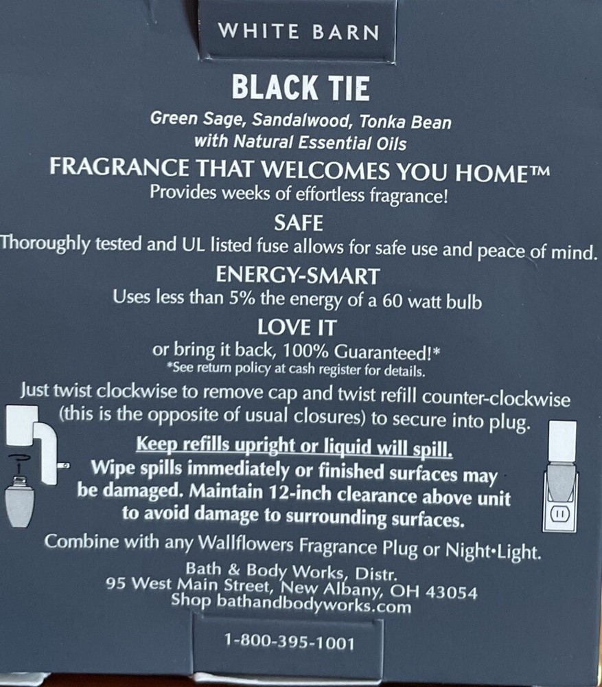 Add a touch of sophistication to your home with this set of two Bath and Body Works Wallflower refills in the scent of Black Tie. These liquid refills are perfect for everyday use and come in a clear glass bottle with a wall plug-in power source. The diffuser feature ensures an even distribution of the sage, sandalwood, and tonka bean scents, creating a relaxing and calming atmosphere in any room. These refills are easy to install and are suitable for use in the whole house. The 0.8 fl oz volume ensures that you can enjoy the fragrance for a long time. The set includes two refills and is a great addition to any home decor. SHIPS FREE!!!