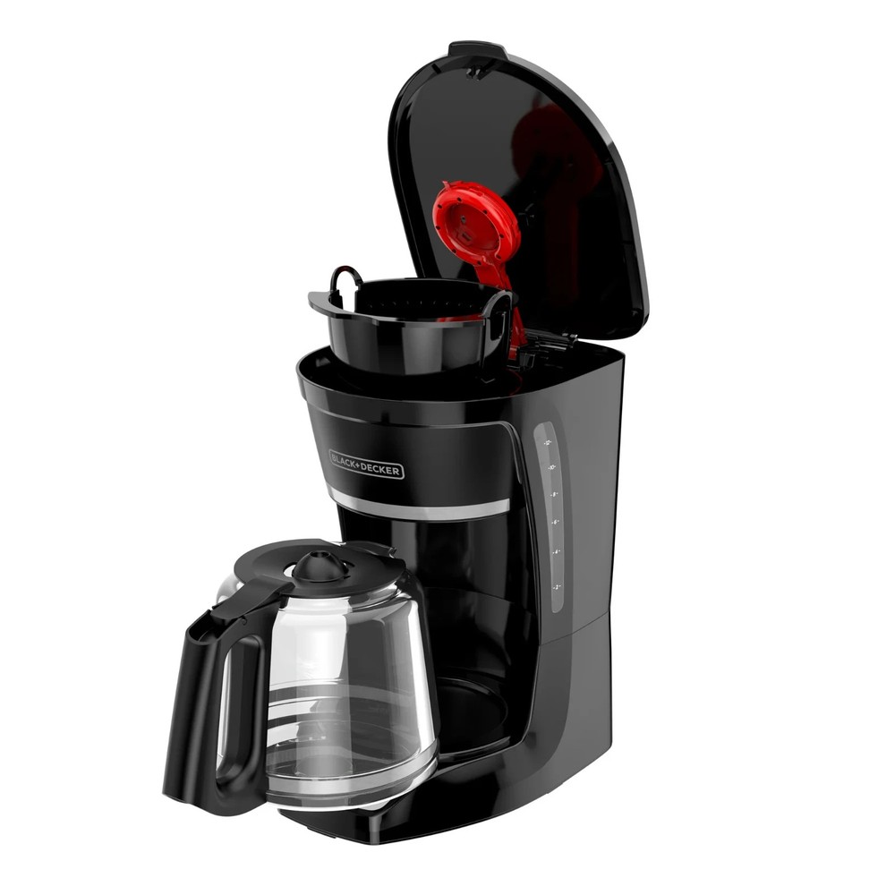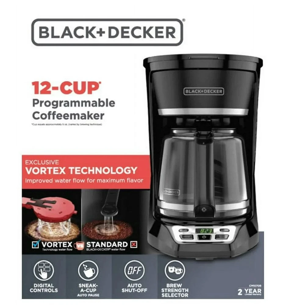 Start your day right with the BLACK+DECKER 12-Cup Programmable Coffeemaker, designed for convenience and consistent flavor. With QuickTouch™ controls and a 24-hour auto-brew timer, you can wake up every morning to the delicious smell of fresh coffee. The VORTEX showerhead technology ensures grounds are evenly saturated for a rich, balanced taste in every pot. Choose your strength with the brew selector, or grab a quick cup mid-brew with Sneak-A-Cup™. That, plus the large glass carafe, easy-to-clean removable filter basket, and automatic shut-off make this coffeemaker as reliable as it is convenient. 12-cup glass carafe: Brew a full pot for family, guests, or just extra cups throughout the morning. Programmable brewing: Set the 24-hour auto brew so coffee is ready when you wake up. Strength selector: Choose between regular or strong brew to match your flavour preference. Sneak-A-Cup™: Pause the cycle to pour your first cup without spills or drips. Even flavor extraction: VORTEX showerhead saturates grounds thoroughly for rich, balanced coffee. Easy cleanup: Dishwasher-safe carafe and removable brew basket with permanent filter. Keep warm plate: Maintains optimal temperature for up to two hours. Auto shut-off: Peace of mind with automatic power-down after the keep warm cycle.