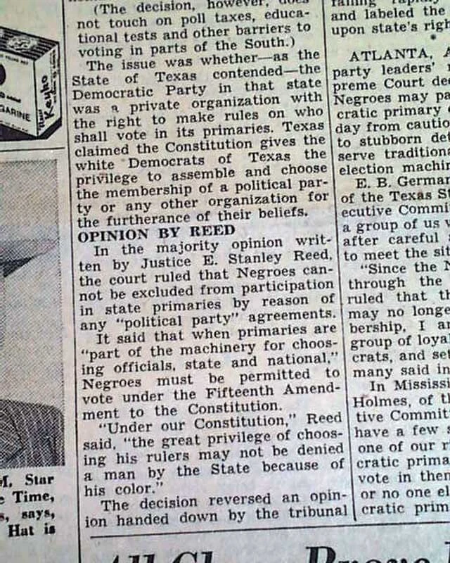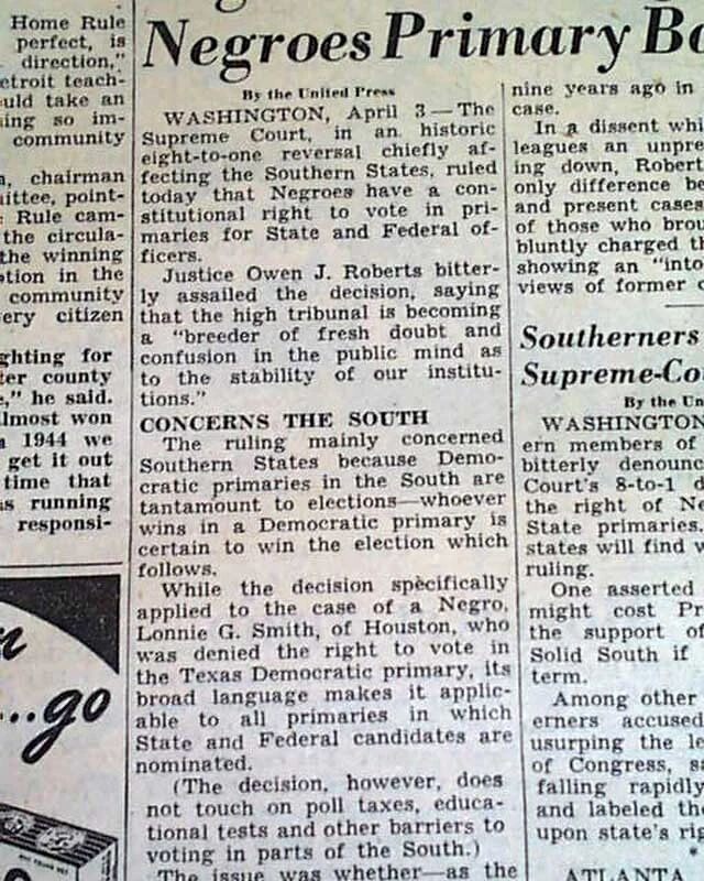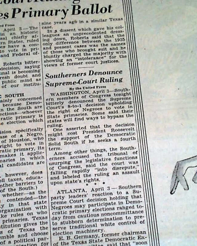 BLACKS VOTING RIGHTS Smith v. Allwright Desegregation Decision 1944 Newspaper Offered is an original, collectible newspaper (NOT a copy/reproduction): THE DETROIT FREE PRESS, April 4, 1944 * Smith v. Allwright decision (1st report) * United States Supreme Court decision * African Americans voting rights in Texas Page 3 has a two column heading: "High-Court Ruling Gives Negroes Primary Ballot" with smaller subheads. (see images) Complete with 16 pages, light toning and a little wear at the margins, generally nice. Please Note: All of our offerings are 100% authentic! We do not offer reprints or reproductions of any kind. They are guaranteed to be original! Links to Archival Storage Options & Certificates of Authenticity Are Below! Historical reports may be beautiful or ugly, but they are always informative. While we rejoice in the beautiful (heroic, discovery, amazing feats, etc.), we at History's Newsstand also offer "the ugly" for we are determined to learn from the wrongs of the past - understanding, to do so, we must be willing to look these wrongs directly in the face and shout "NO MORE!". It is for this reason many Black Americans collect historic slave ads, Jews collect reports regarding the Holocaust, women collect coverage of the Women's Suffrage Movement, etc.. If you find any to be offensive, we agree! Hopefully this is an indication we are moving in the right direction. Domestic Shipping Policy... For this specific item, A U.S. winner pays $10.00 S&H. If multiple items are purchased and paid for simultaneously , the S&H will be calculated by using the highest item's S&H as the base cost , and then adding a small amount for each additional newspaper. The per-item additional cost for newspapers, folders, portfolios, and presentation cases vary according to size and weight. All U.S. orders include in-house insurance at no additional cost to the buyer and include delivery confirmation. All orders include tracking & delivery confirmation. Orders ship within 24 business hours of receiving payment. Some small items may be shipped 1st Class. We will still provide tracking and insure them at our expense. Combined Shipping Notice If the automated eBay checkout process does not properly combine shipping, we will refund overages automatically. If you prefer, contact us prior to payment to obtain a revised invoice. International Shipping Policy... If the S&H to your location is not given, international buyers/winners should contact us for an invoice which includes S&H . Import duties, taxes, VAT. etc. are not included in our quoted S&H. These charges are the buyer’s responsibility. Note: We will not falsify customs declarations or mark an item as a "gift" in order to avoid customs fees. If insurance is desired, be in touch for a quote. All insured orders are subject to customs, duties, & taxes for the amount insured and are the buyer's responsibility. International purchasers are encouraged to take advantage of our combined shipping policy to lower the cost per item S&H. If you wish to take advantage of combined shipping, please do not pay for any until you are finished - and then contact us for a combined invoice. If You Are Unhappy With Your Order We make every effort to provide the best possible buying experience. If we fall short of your expectations in any way, please contact us so we can try to make things right for you. Archival Storage... ...is available for an additional $15.00, plus an appropriate adjustment to S&H (see above Shipping Policy). If desired, purchase this directly (through eBay) at: archival storage folder . Again, to insure you will receive the appropriately sized folder for your item, please select the $15.00 folder option. Certificate of Authenticity... A certificate of authenticity is also available for an additional $3.00, which includes both the issue date and title, and certifies, by Timothy Hughes Rare & Early Newspapers, the issue to be authentic & original. If desired, purchase this directly (through eBay) at: certificate of authenticity . About Us... Contact Information... We have been both collectors and dealers in rare newspapers since 1975, serve as consultants to multiple museums, and are members of both the Ephemera Society of America and the American Antiquarian Society. Bid & Buy with confidence knowing every item we offer is guaranteed to be authentic. Timothy Hughes Rare Newspapers P.O. Box 3636 Williamsport, PA 17701-8636 Hours: M-F, 7:30-4:00 EST View our additional ebay offerings "...desiring to conduct ourselves honorably in all things." Heb. 13:18 In an effort to honor eBay's policies and our loyal customers who watch our listings, we do not end auction items early. We hope you understand! " Were it left to me to decide whether we should have a government without newspapers, or newspapers without a government, I should not hesitate a moment to prefer the latter." Thomas Jefferson