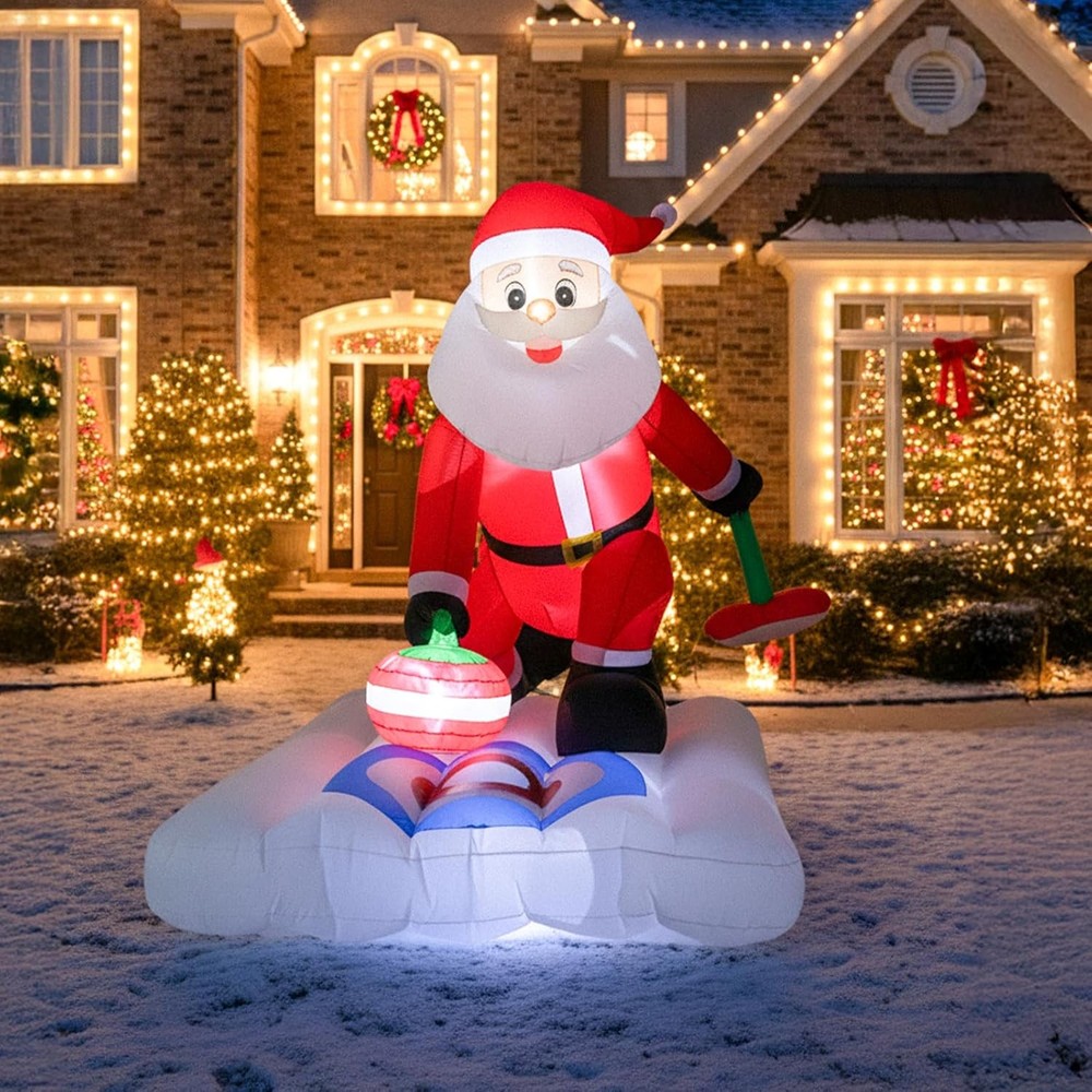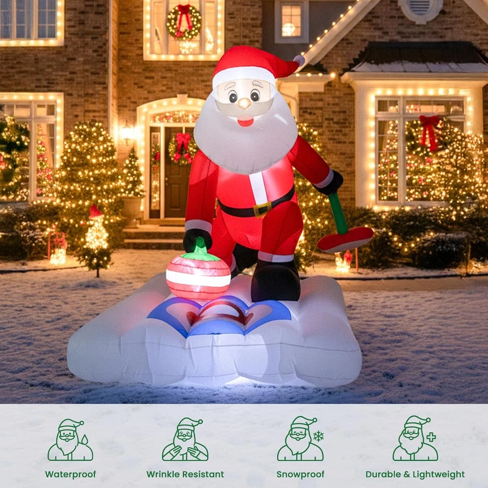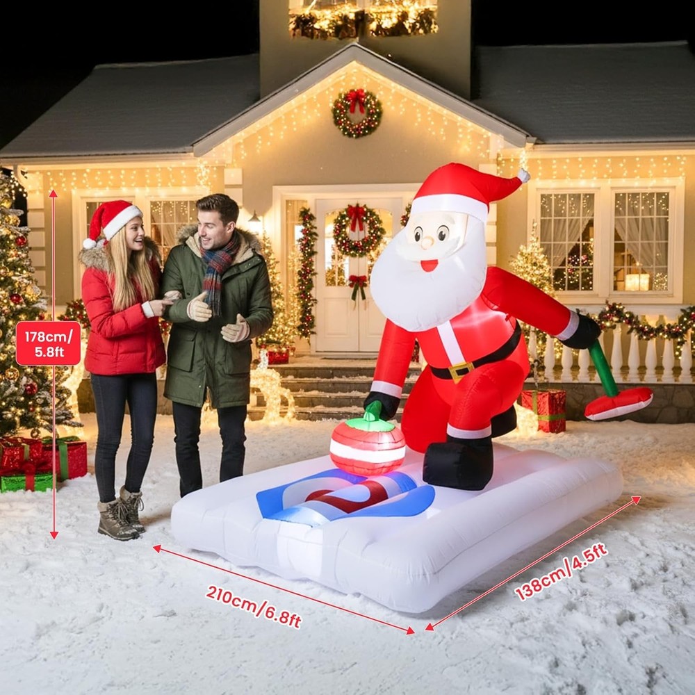 Christmas Inflatable Outdoor Decoration 7Ft x 6Ft Santa Claus Playing Curling with Built-in LED Lights, Blow Up Decorations for Yard Gardern Lawn Xmas Party Indoor Christmas Holiday 【Perfect Christmas Inflatables Decor】: The Santa inflatable playing curling, with a curling stone in hand and a playful grin, bringing a lively and festive vibe to your outdoor Christmas decorations for the yard. Your guests will be charmed by its delightful appearance, making them feel like they are stepping into a cheerful holiday scene. They will absolutely adore it! 【Easy to Set Up】: Simply turn on the built-in fan and watch as this Christmas Santa Claus blow up yard decorations come to life in a matter of minutes. Note: Zip up the bottom and not attempt to inflate this Santa inflatables outdoor decorations during unusually strong wind and raining day. 【Fun Christmas Decor: Inflatable Decorative Accents】: Built from durable, all-weather material, this 7FT inflatable Christmas Santa Claus with LED lights stands strong against wind and rain. It's designed to be a long-lasting part of your holiday tradition, bringing festive cheer to your yard for many seasons to come. 【Versatile Occasions 】Simplify your holiday decorating with our versatile inflatable Christmas Santa.This Christmas blowups perfect for Christmas outdoor and indoor decoration, garden, yard, lawn, patio, living room, which make you stand out in the Christmas holiday. 【The Perfect Addition to Your Holiday Decor】Struggling to find the perfect outdoor Christmas decoration? Look no further! This merry inflatable Christmas Santa is a wonderful addition to your garden and yard. It also doubles as a festive Thanksgiving inflatable, offering fantastic value. It's more than just a decoration—it's a fun gift your child will absolutely love. Order today and get ready to create lasting memories this Christmas!