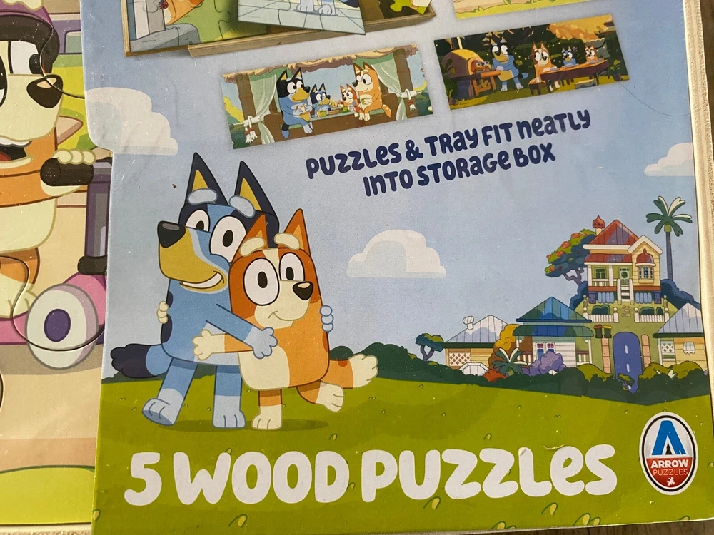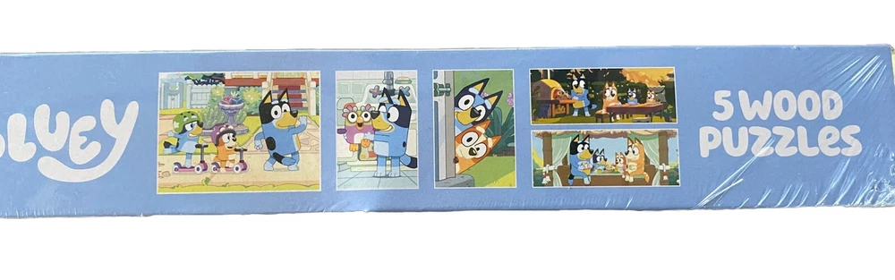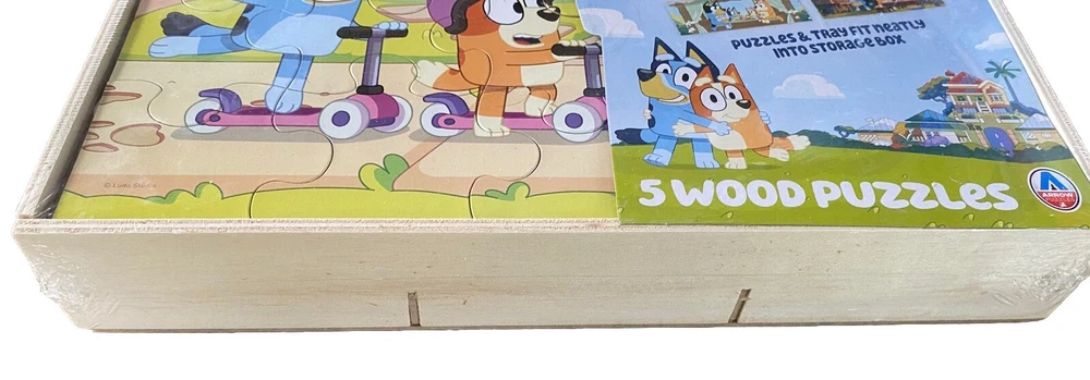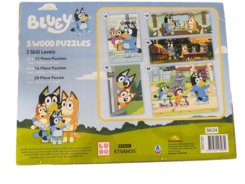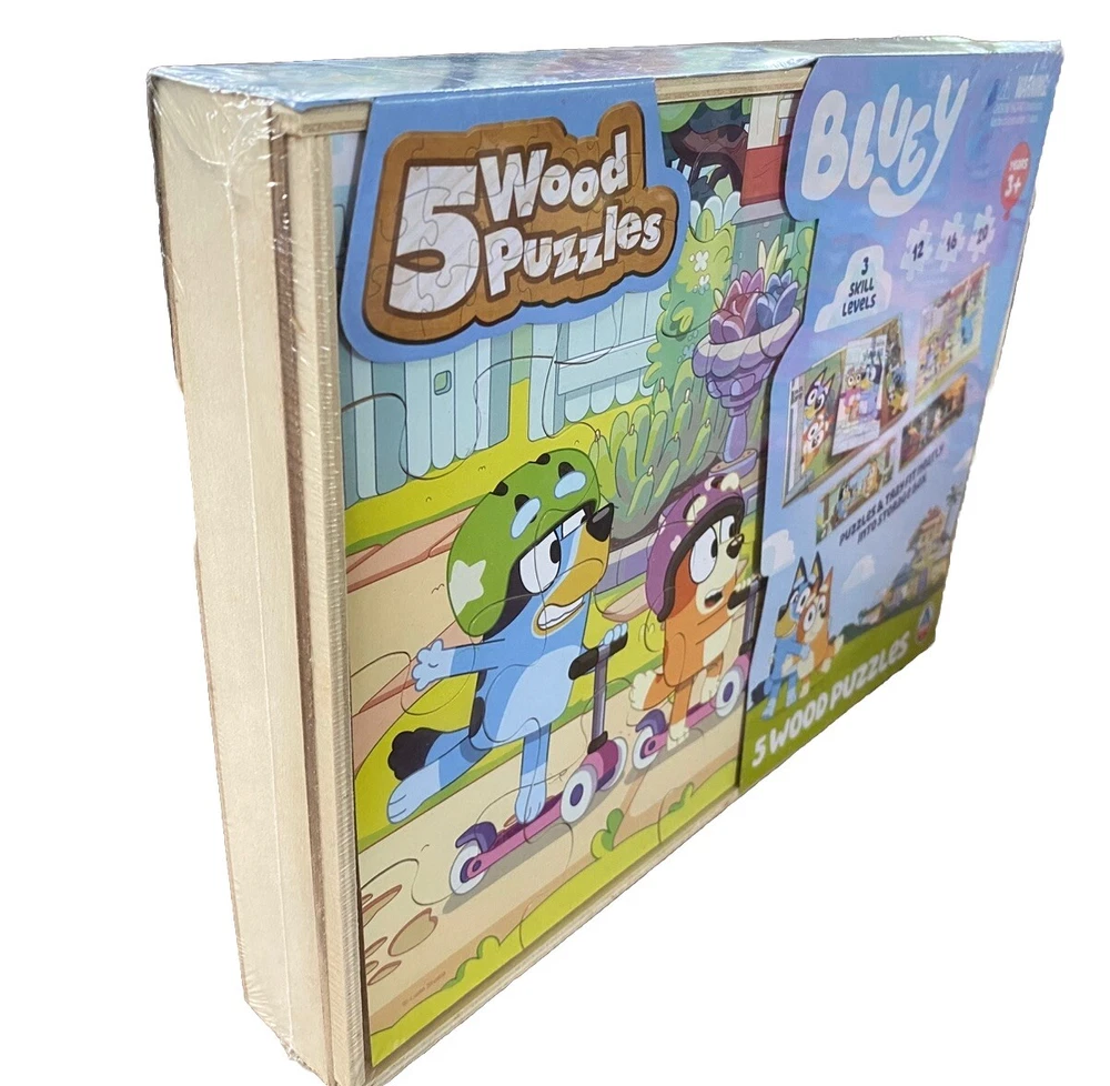 Piece together some family fun with the BLUEY 5 Wood Jigsaw Puzzles, featuring your favourite Heeler family dog in vibrant, multi-colourful scenes. Ideal for kids aged 3 and up, this set includes puzzles with 2x12, 2x16, and 1x20 pieces, catering to different skill levels and providing a rewarding challenge for young minds. Crafted from durable wood, these puzzles promise lasting quality and entertainment. Whether it's a rainy day activity or a fun family competition, these puzzles will engage and entertain any Bluey fan, encouraging problem-solving and fine motor skills. Complete with a sturdy wooden box, they make for a splendid gift or a cherished addition to any puzzle collection. Brand New & Sealed. Please refer to pics for further details. Thank you for shopping at Funkee Munkee New & Rescued Treasures.